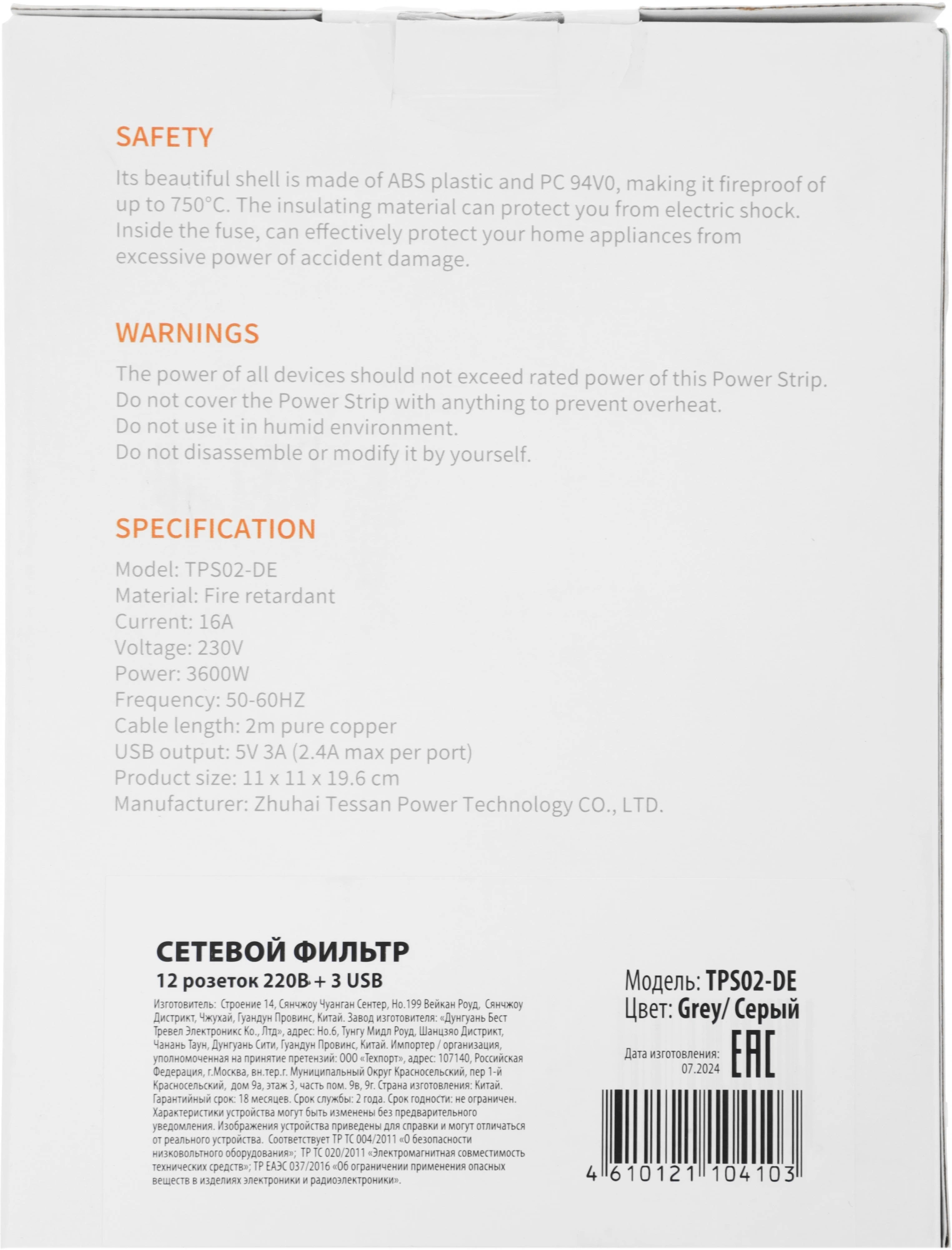 Сетевой фильтр с 12 розетками 220В, 3 USB портами и кнопкой питания. Компактный дизайн. LED индикатор. Защита от перегрузки и скачков напряжения. Огнеупорный материал корпуса. Высококачественный медный кабель 2 метра. Надежные плотные разъёмы.
