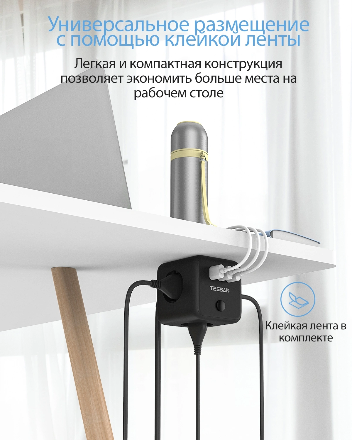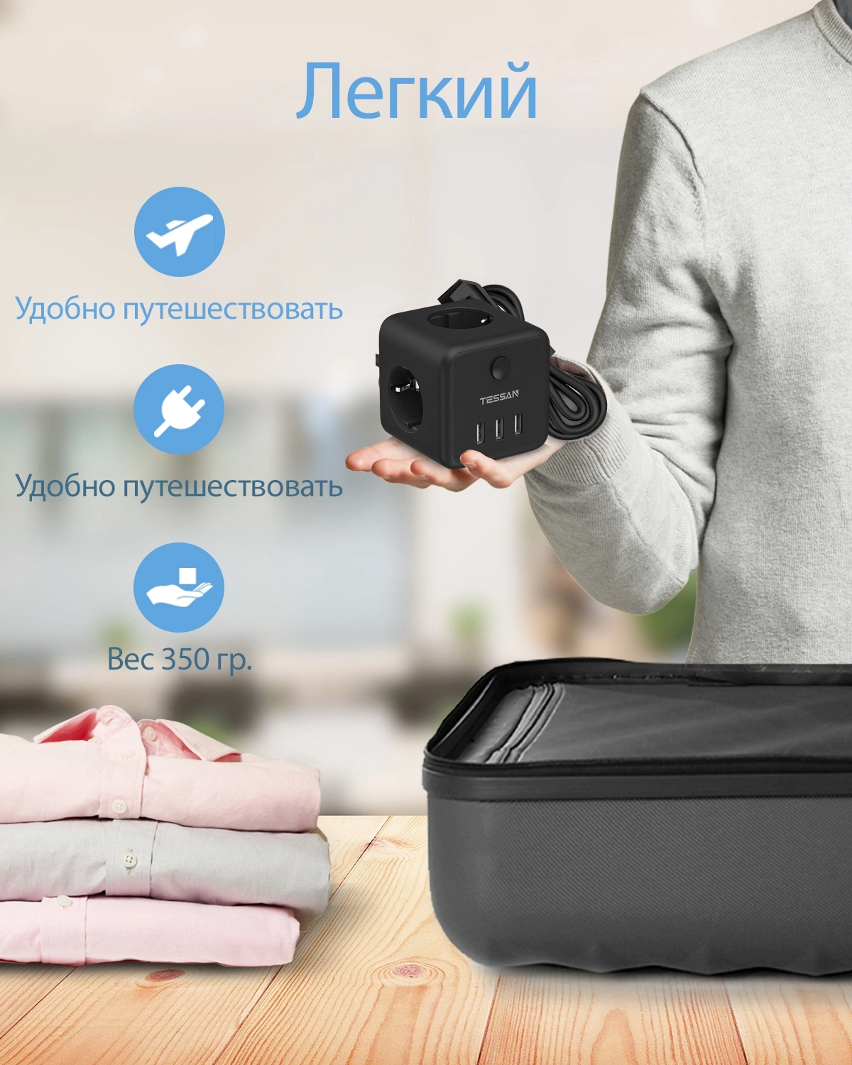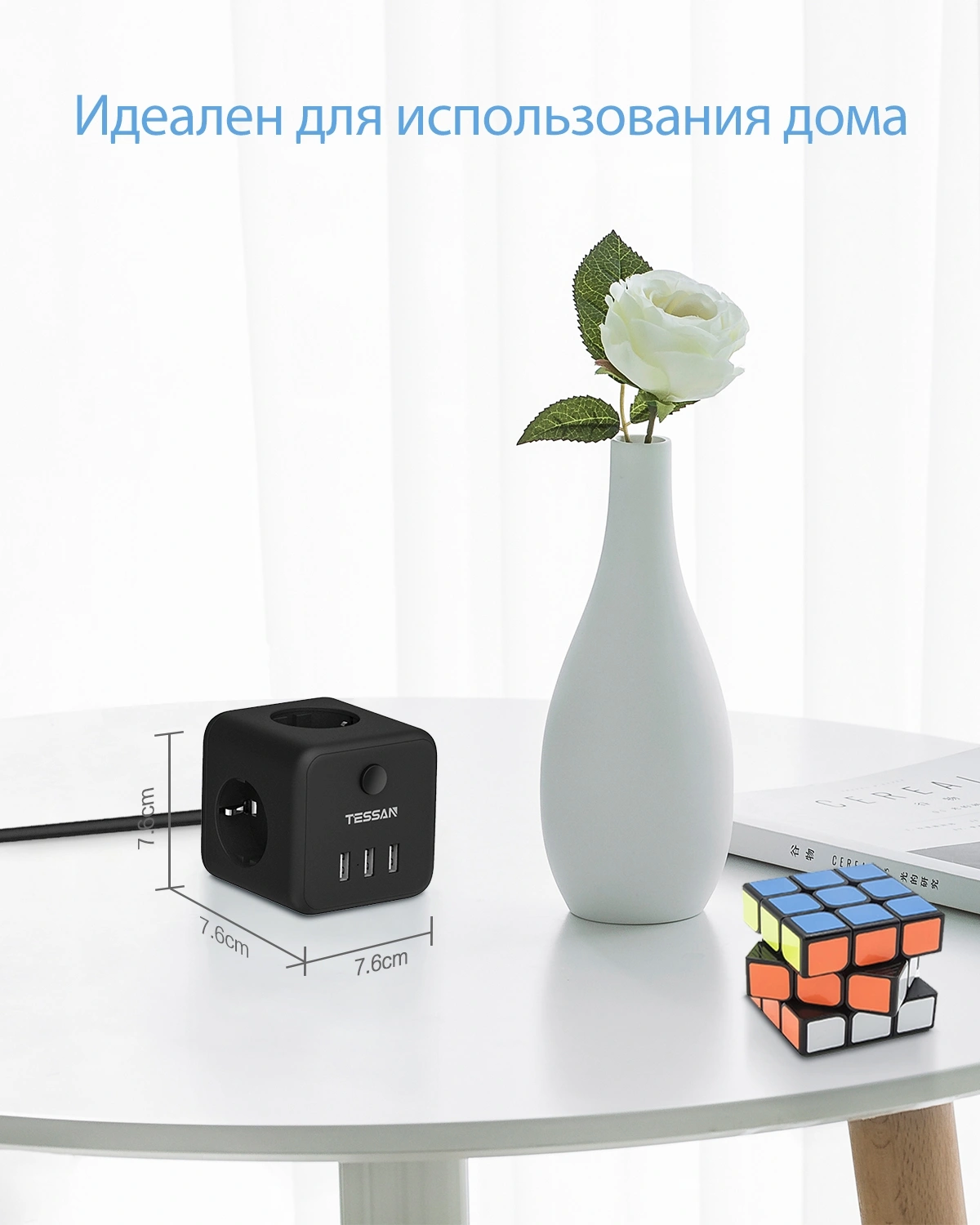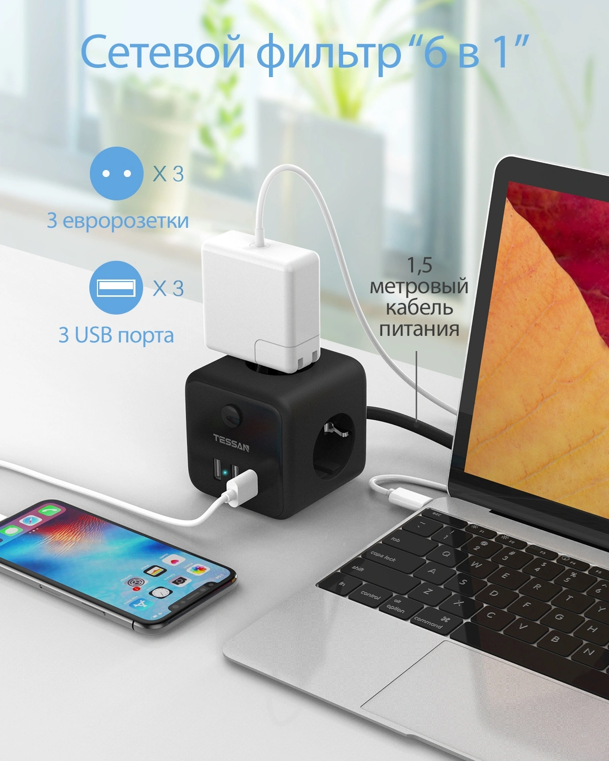 Сетевой фильтр с 3 розетками 220В, 3 USB портами и кнопкой питания. Компактный дизайн. LED индикатор. Защита от перегрузки и скачков напряжения. Огнеупорный материал корпуса. Высококачественный медный кабель 1,5 метра. Надежные плотные разъёмы.