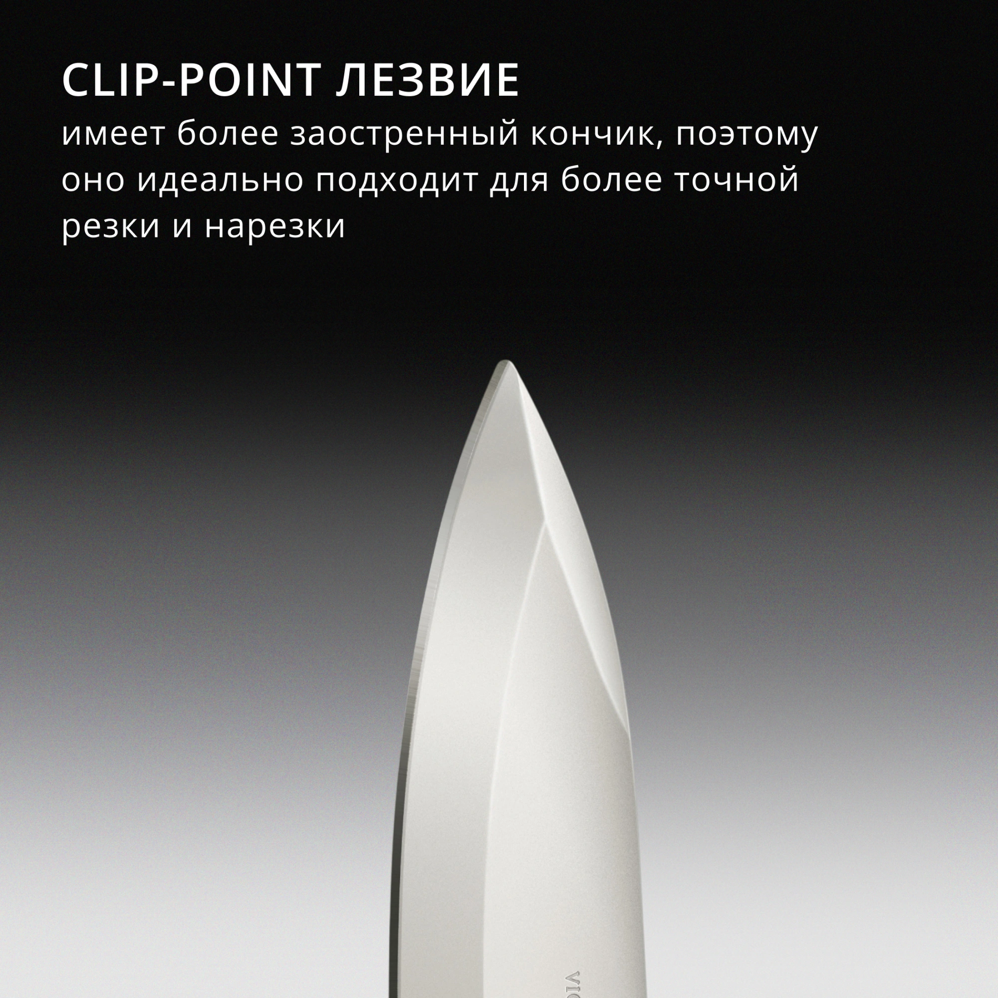 Clip-point лезвие. Лезвие имеет более заостренный кончик, поэтому оно идеально подходит для более точной резки и нарезки. Форма лезвия также обеспечивает лучший контроль при выполнении более сложных и точных задач. Это лезвие доступно на некоторых ножах коллекции Evoke.