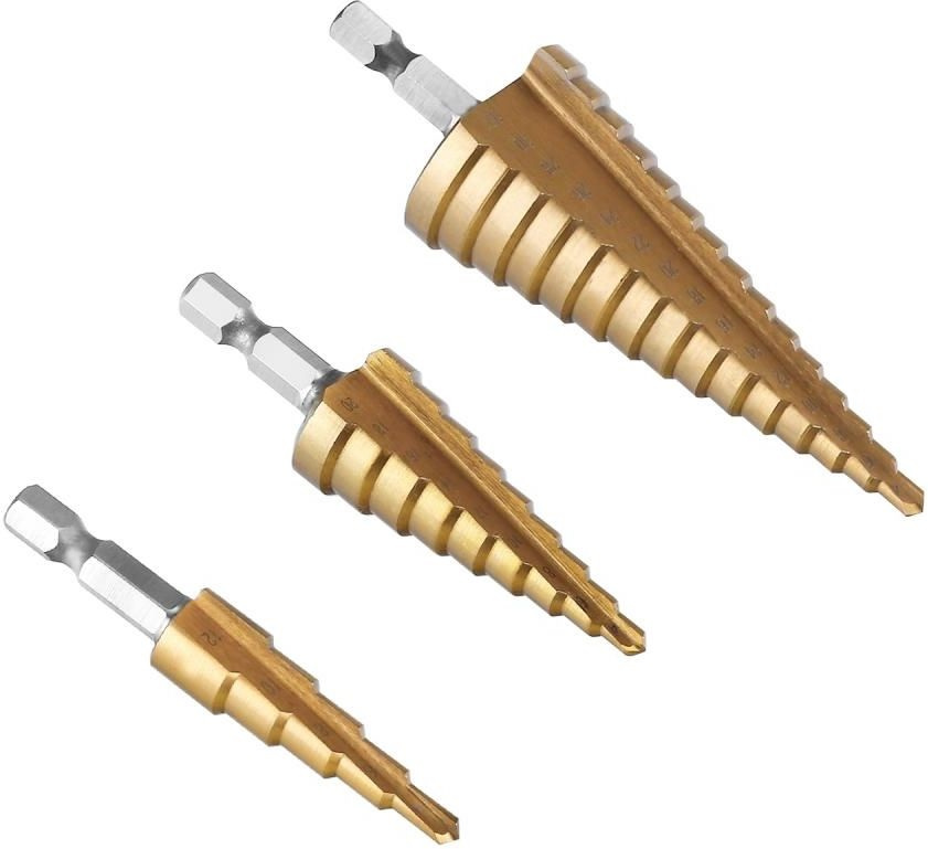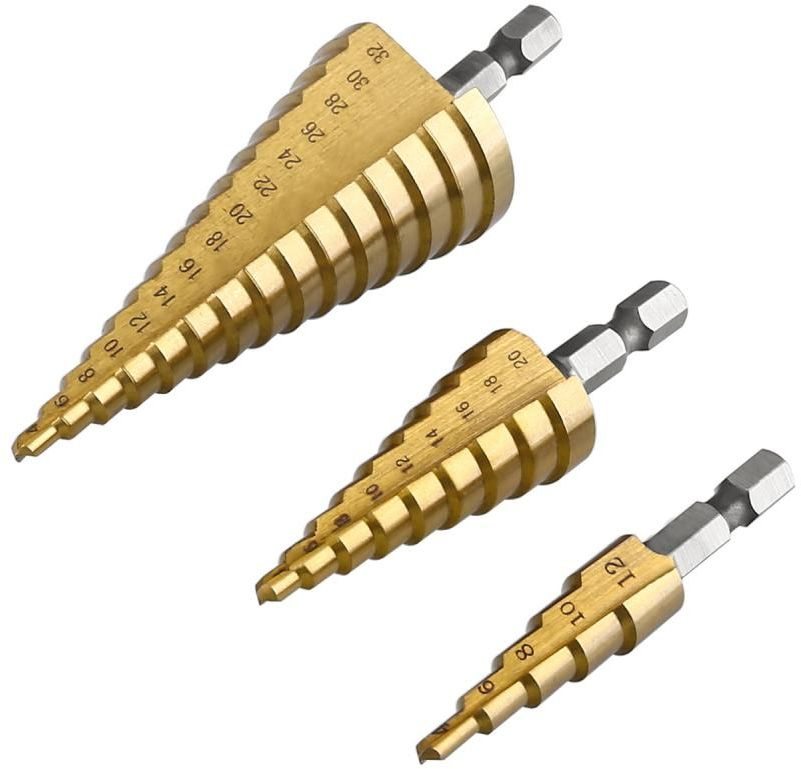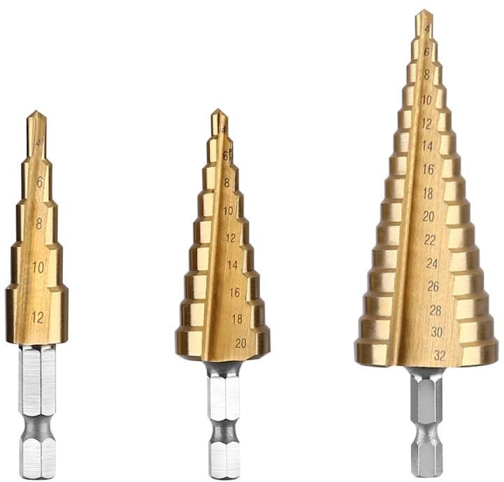 Набор сверл ступенчатых DEKO DH21, 4-12 мм, 4-20 мм, 4-32 мм, 3 шт. из быстрорежущей стали (HSS) с покрытием из нитрида титана для увеличения срока службы. Сверла идеально подходят для сверления отверстий в изделиях из цветных металлов, пластика и стальных листах.