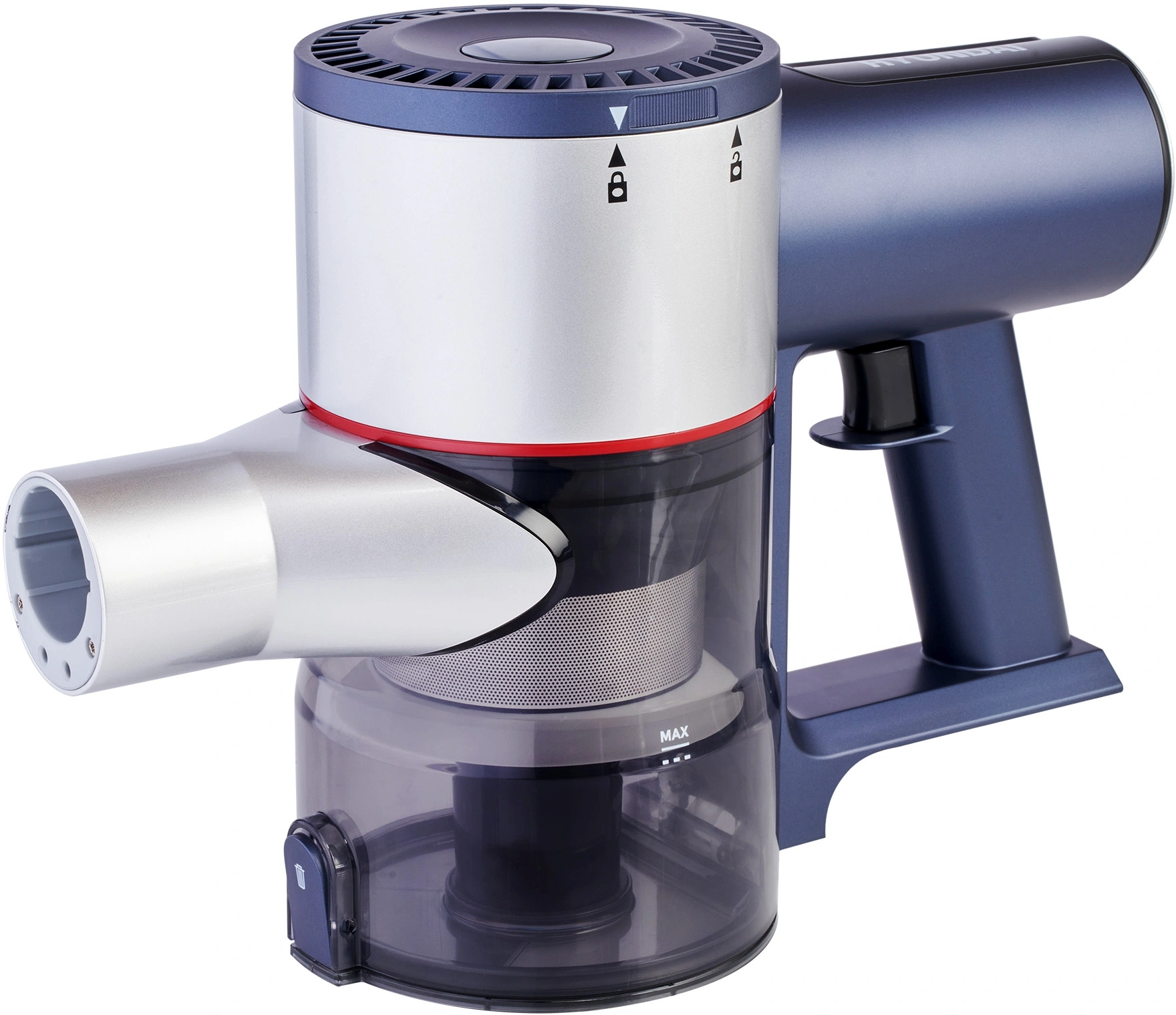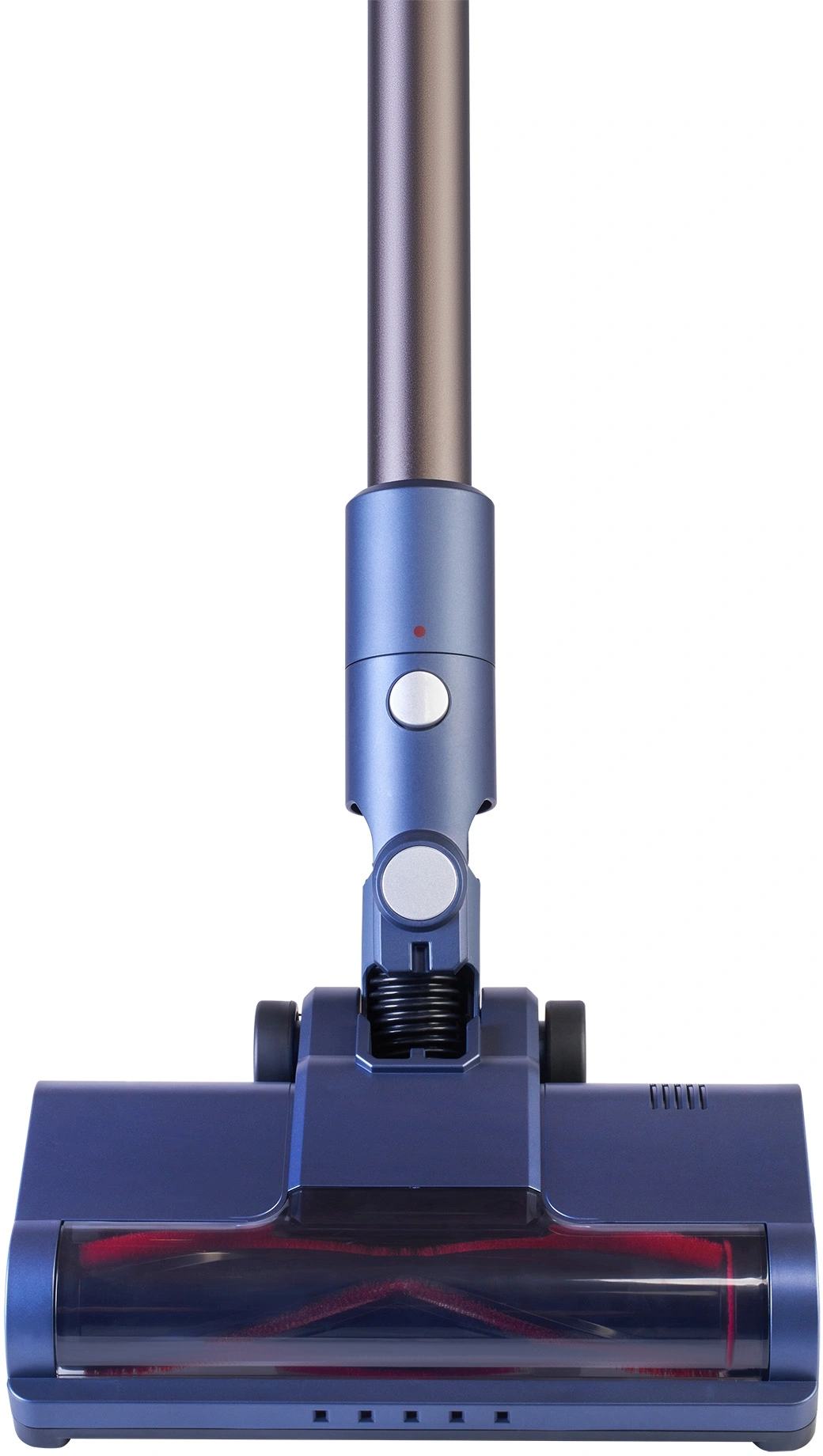Управление на ручке. На рукоятке пылесоса размещаются кнопка регулировки уровня мощности (низкий, средний, высокий) и светящийся LED дисплей, на котором отображаются выбранный режим, уровень заряда, а также имеются индикаторы засорения щетки и трубки.