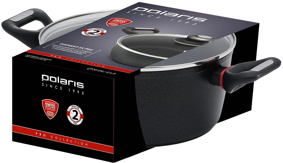 DIAMANT-3X PRO Инновационное 3-слойное антипригарное покрытие с микровкраплениями. Толщина алюминия - 3,5 мм. Ручки - эргономичные бакелитовые ручки с покрытием "Soft touch". Термостойкое внешнее покрытие.