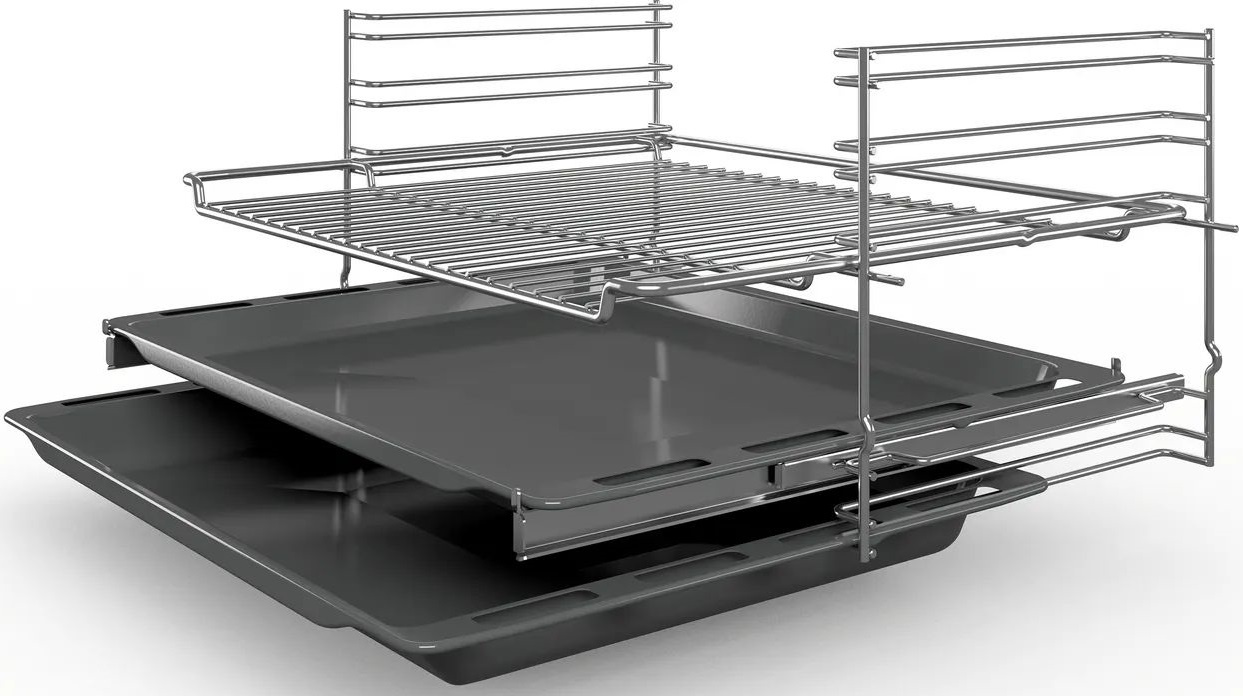 вентилятор охлаждения, дисплей, полностью стеклянная внутренняя поверхность дверцы духовки, телескопические направляющие, утапливаемые переключатели