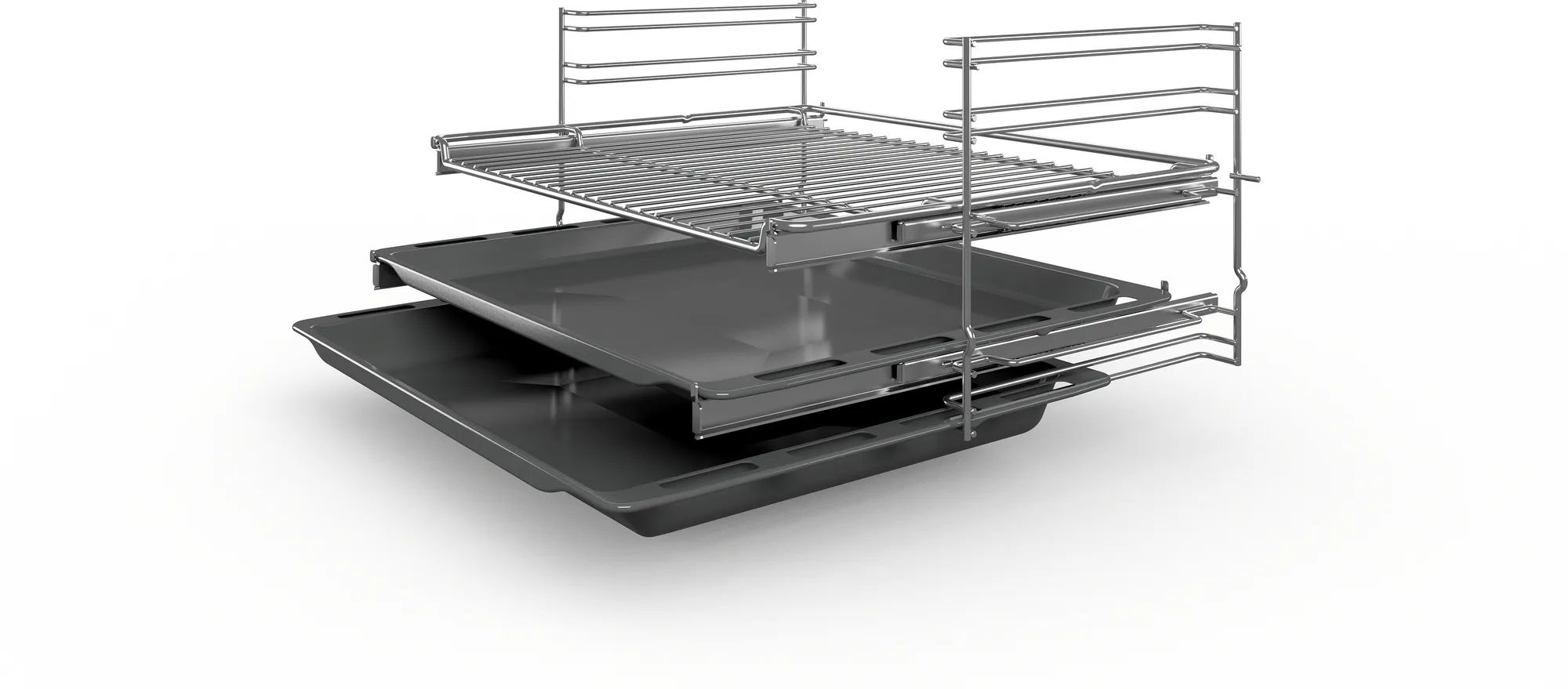 вентилятор охлаждения, дисплей, полностью стеклянная внутренняя поверхность дверцы духовки, телескопические направляющие, утапливаемые переключатели