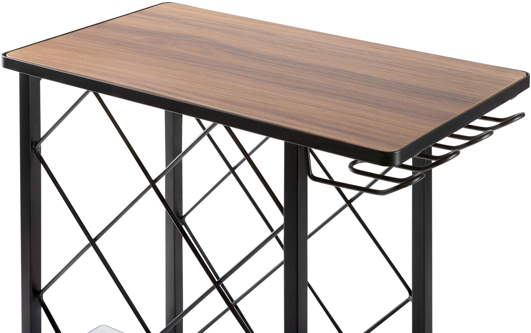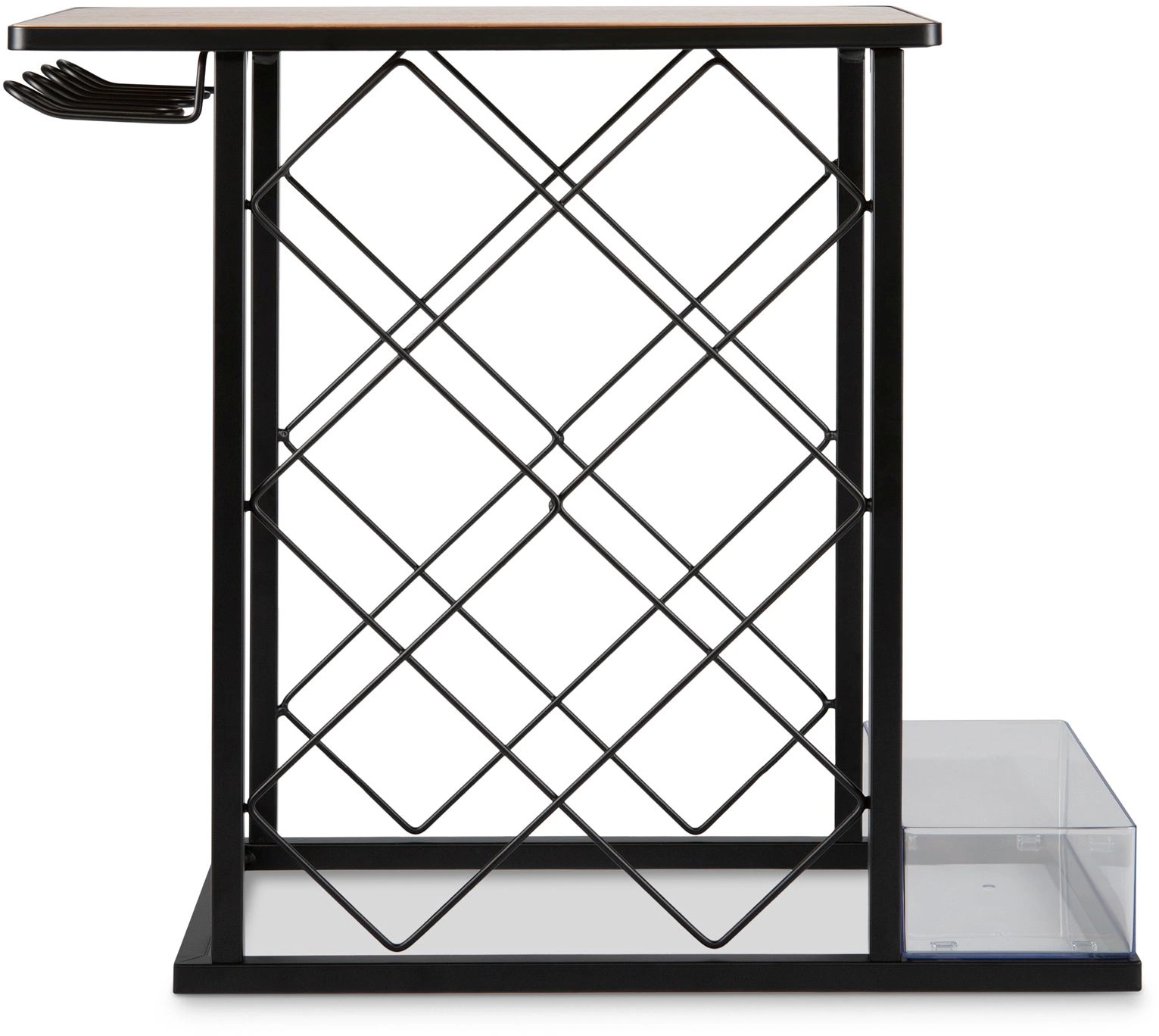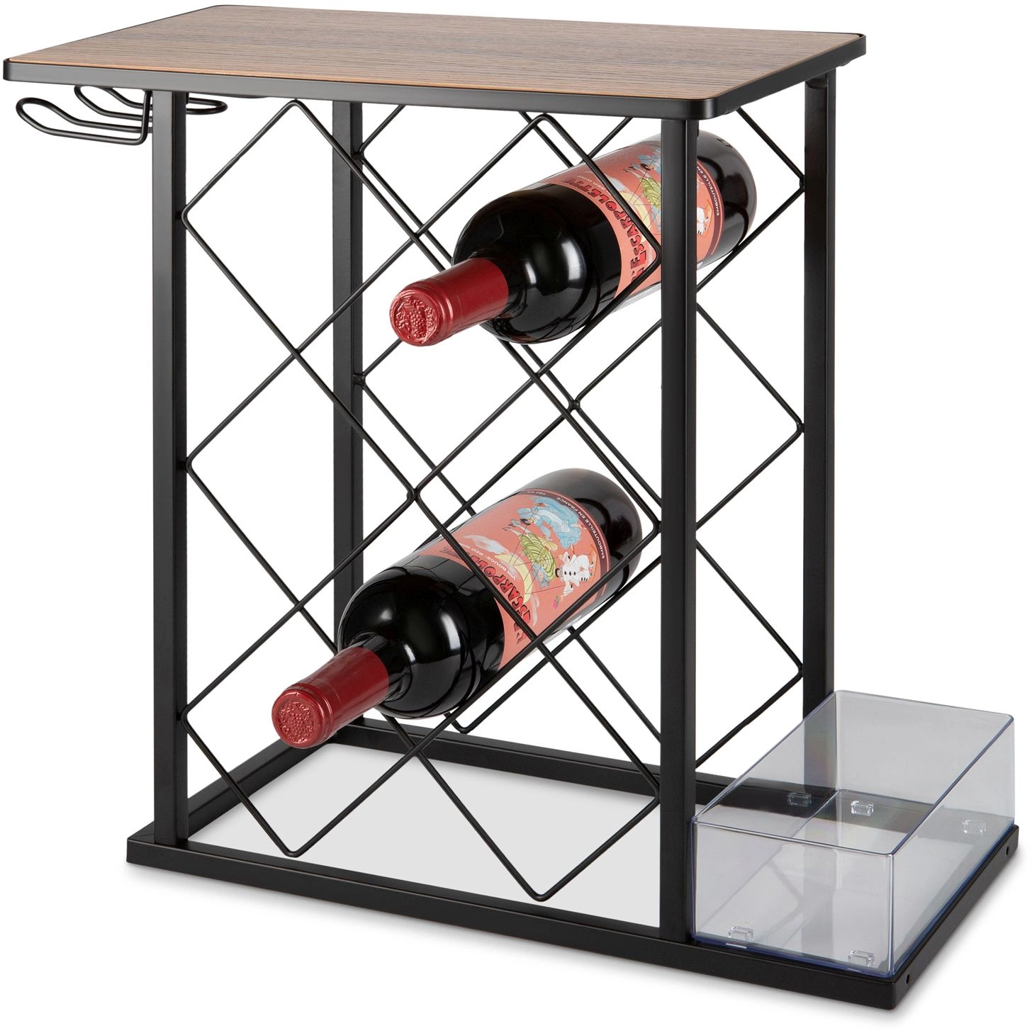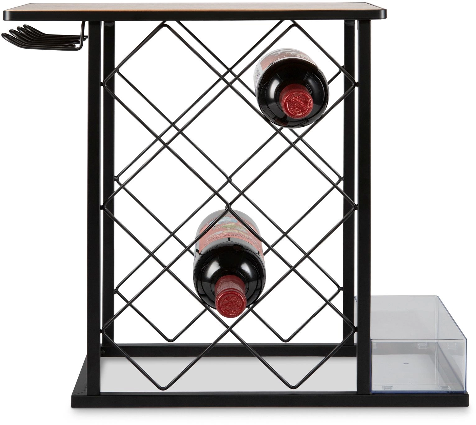 Элегантный лаконичный дизайн. Образующие ячейки тонкие прутки придают невесомость всей конструкции и создают впечатление, что бутылки парят в воздухе. Матовый черный цвет основания отлично гармонирует с древесной фактурой столешницы.