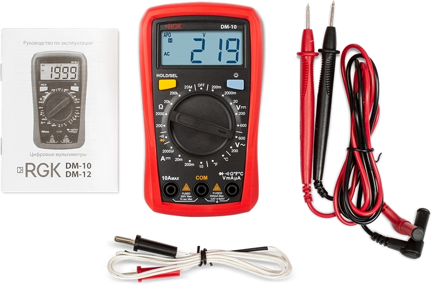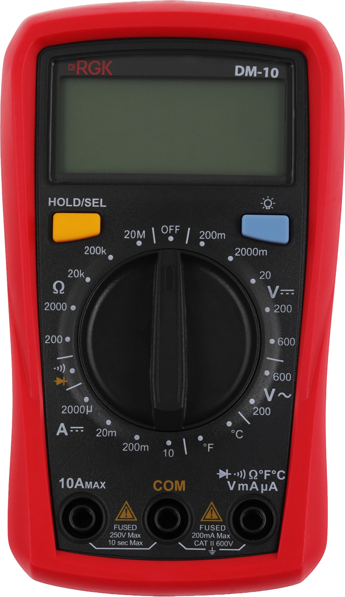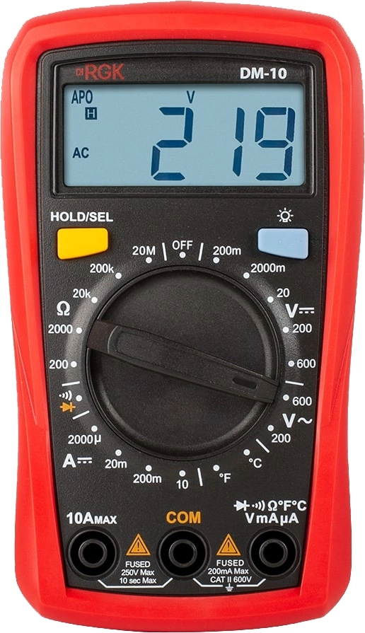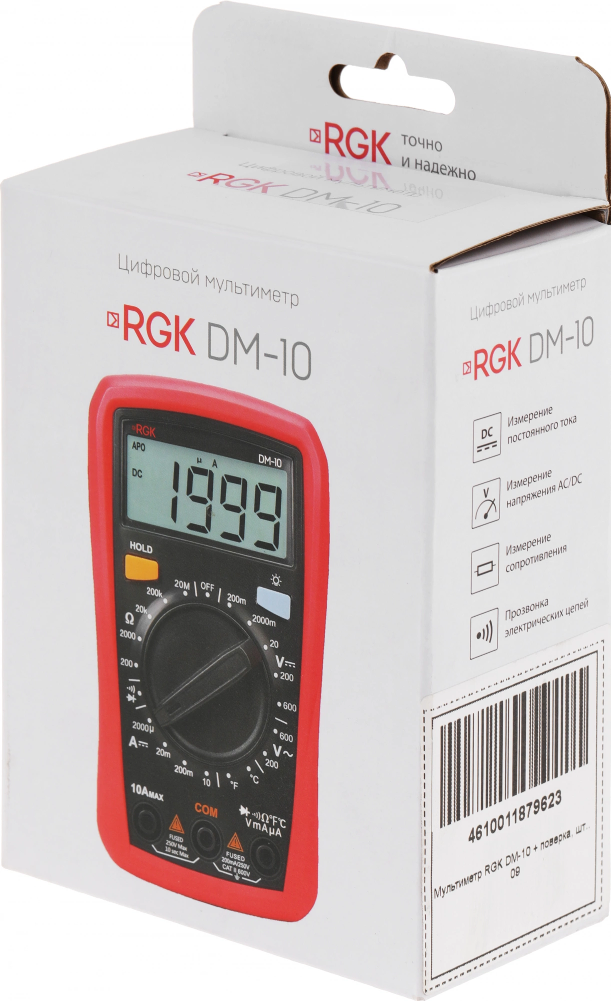 Цифровой мультиметр RGK DM-10 – это прибор для измерения различных параметров электросетей, диагностики оборудования, проверки диодов на работоспособность и прозвонки цепей. За счет компактных размеров и легкости освоения основных функций, эта модель - отличный выбор для домашнего использования.
