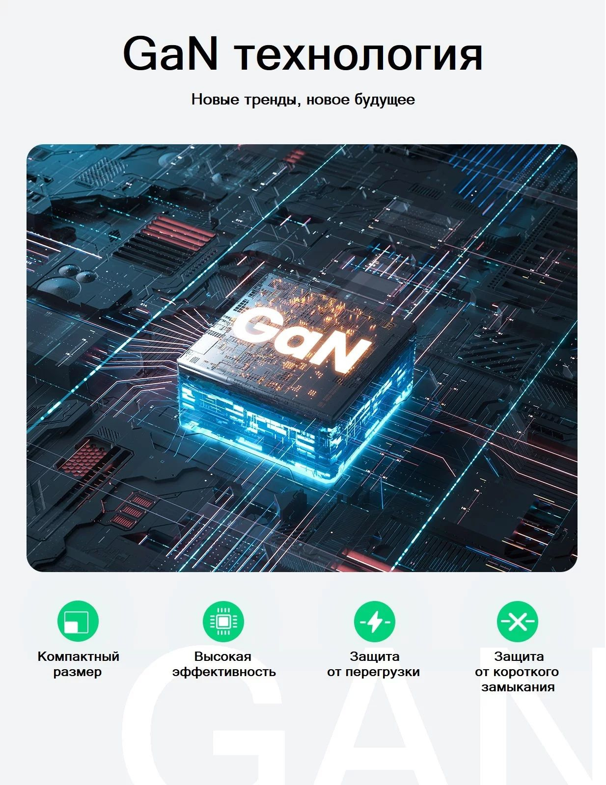 Быстрое зарядное устройство UGREEN 65 Вт, технологией Navitas GaN Power IC, имеет меньший размер, но большую мощность.