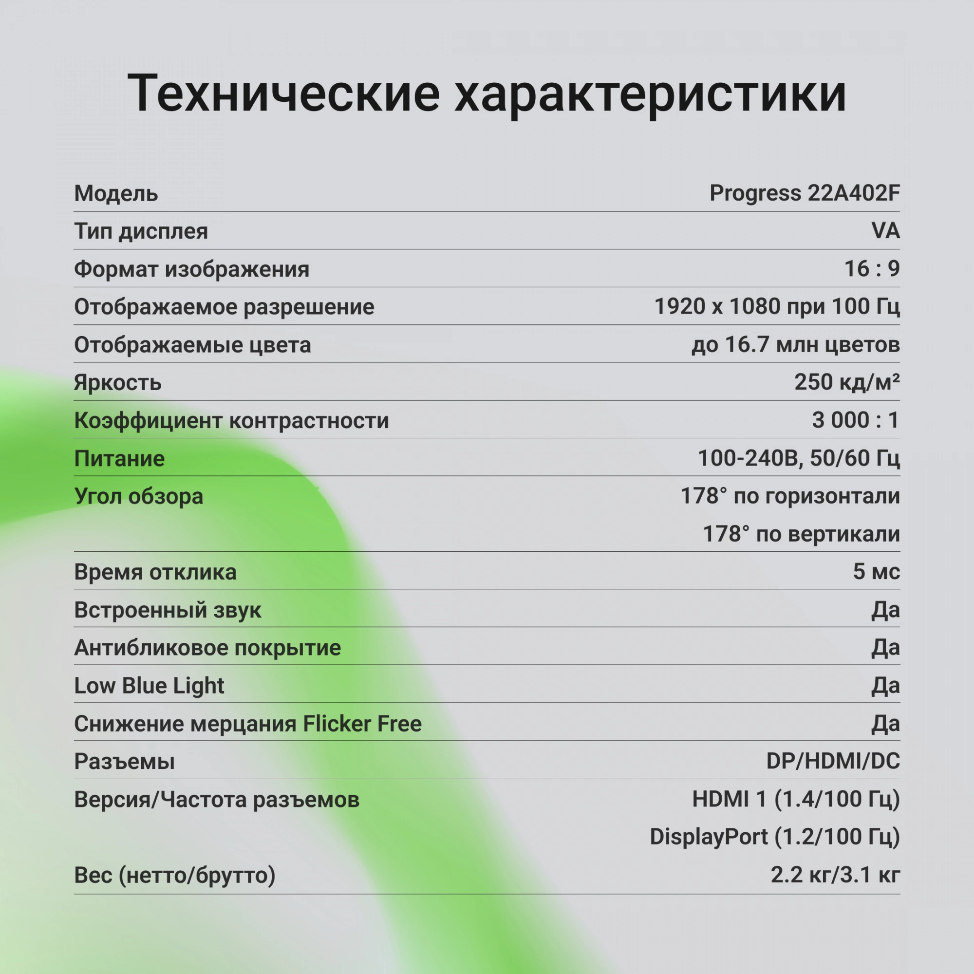 Знакомьтесь с монитором Progress 22A402F, который сочетает в себе отличное качество изображения и компактные размеры.