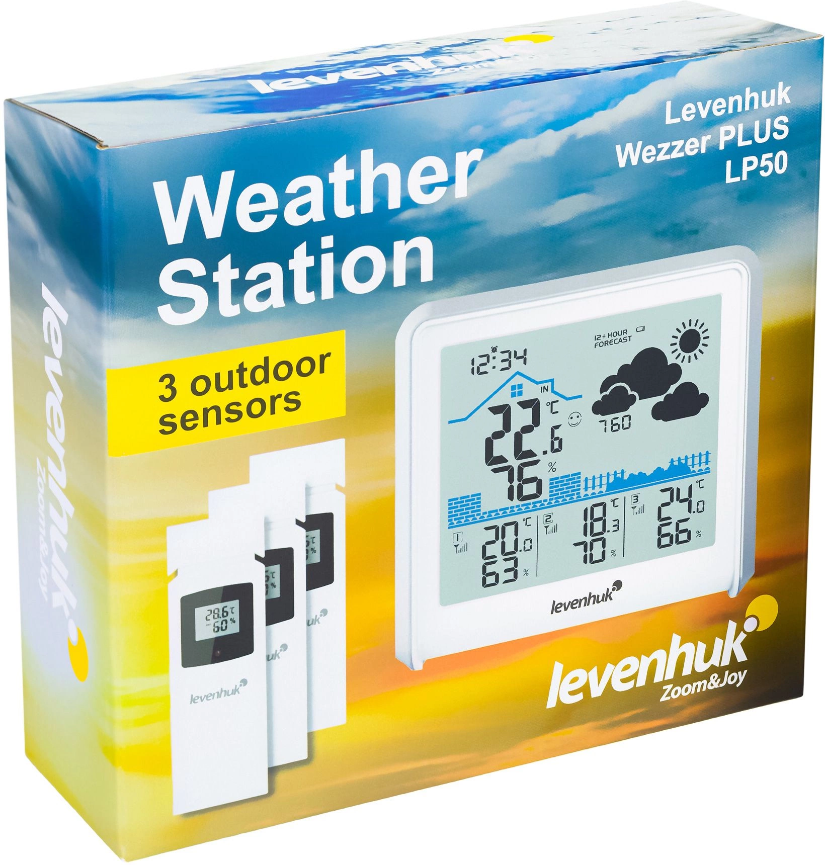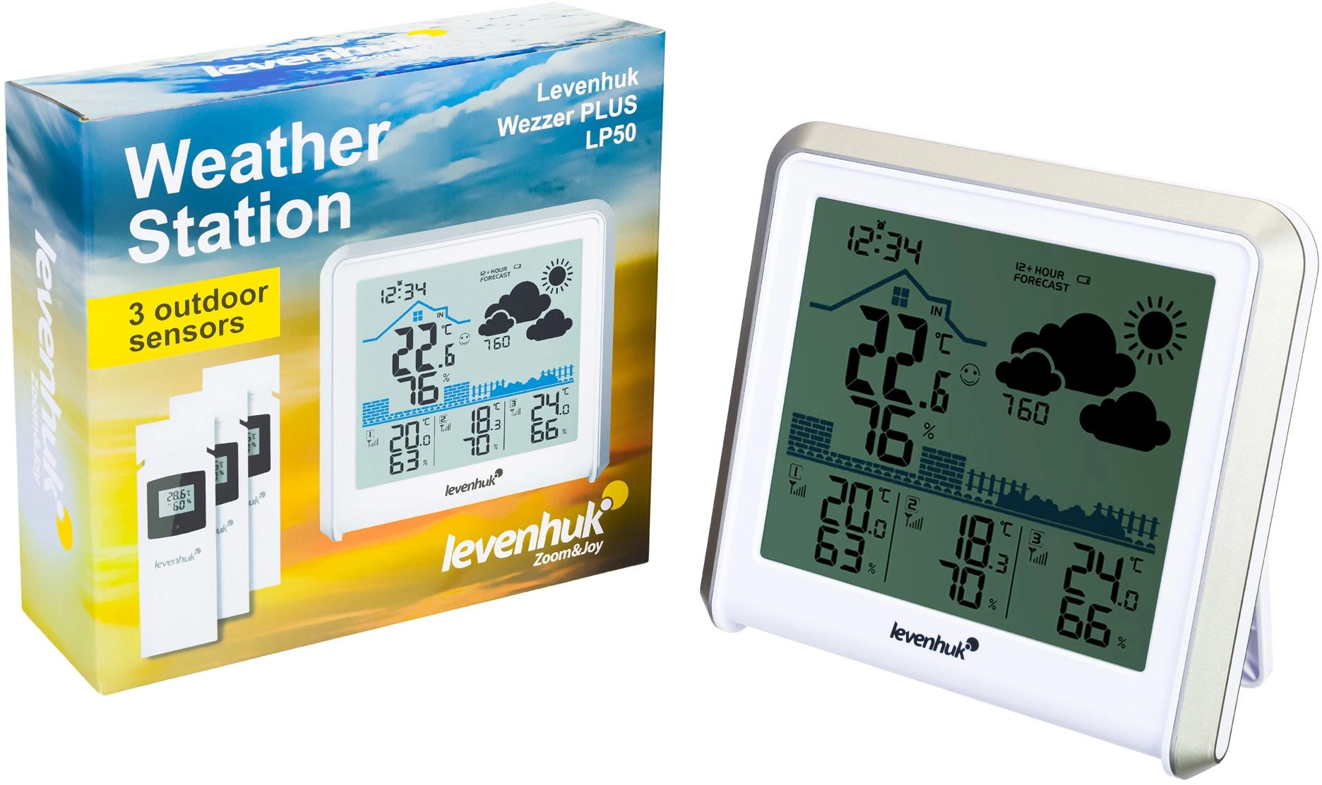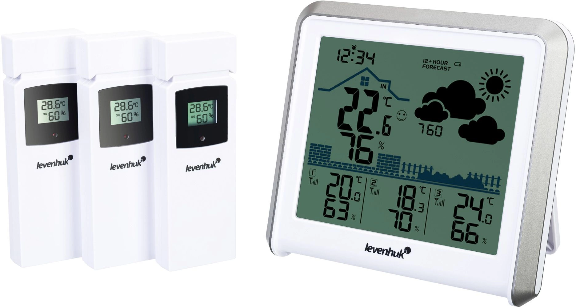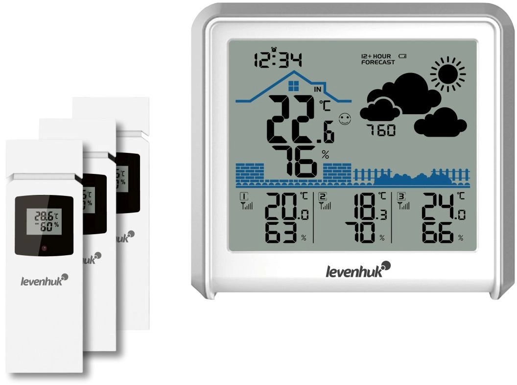 Погодная станция проводит измерения ключевых метеопараметров в четырех местах одновременно. Вместе с основным блоком поставляются три беспроводных термогигродатчика. Их можно разместить в разных помещениях и на улице на расстоянии до 100 метров от самой станции.