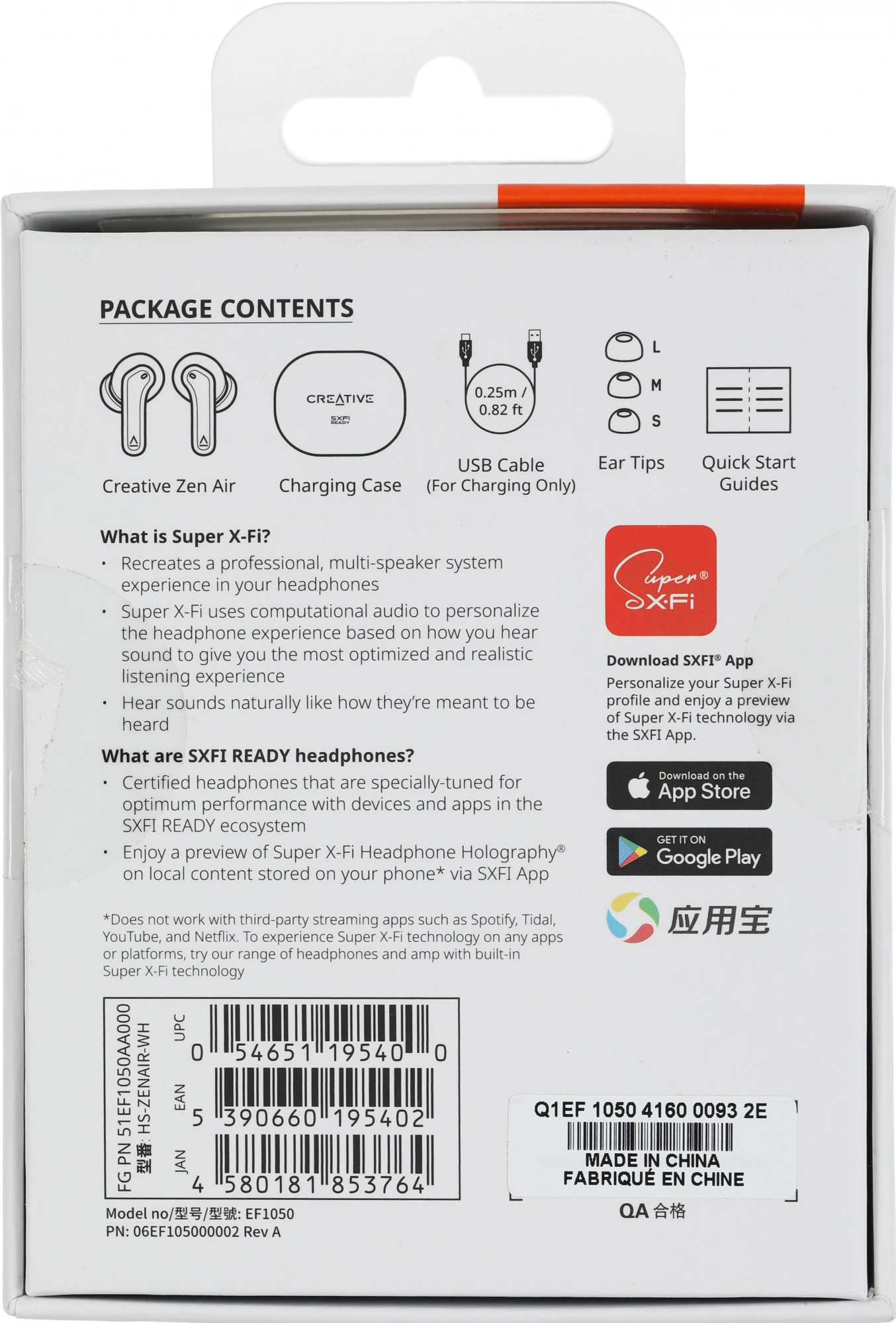 Creative Zen Air, USB-C зарядный чехол, USB-C зарядный кабель, пара (S), (M), и (L) силиконовых вкладышей, Краткое руководство пользователя