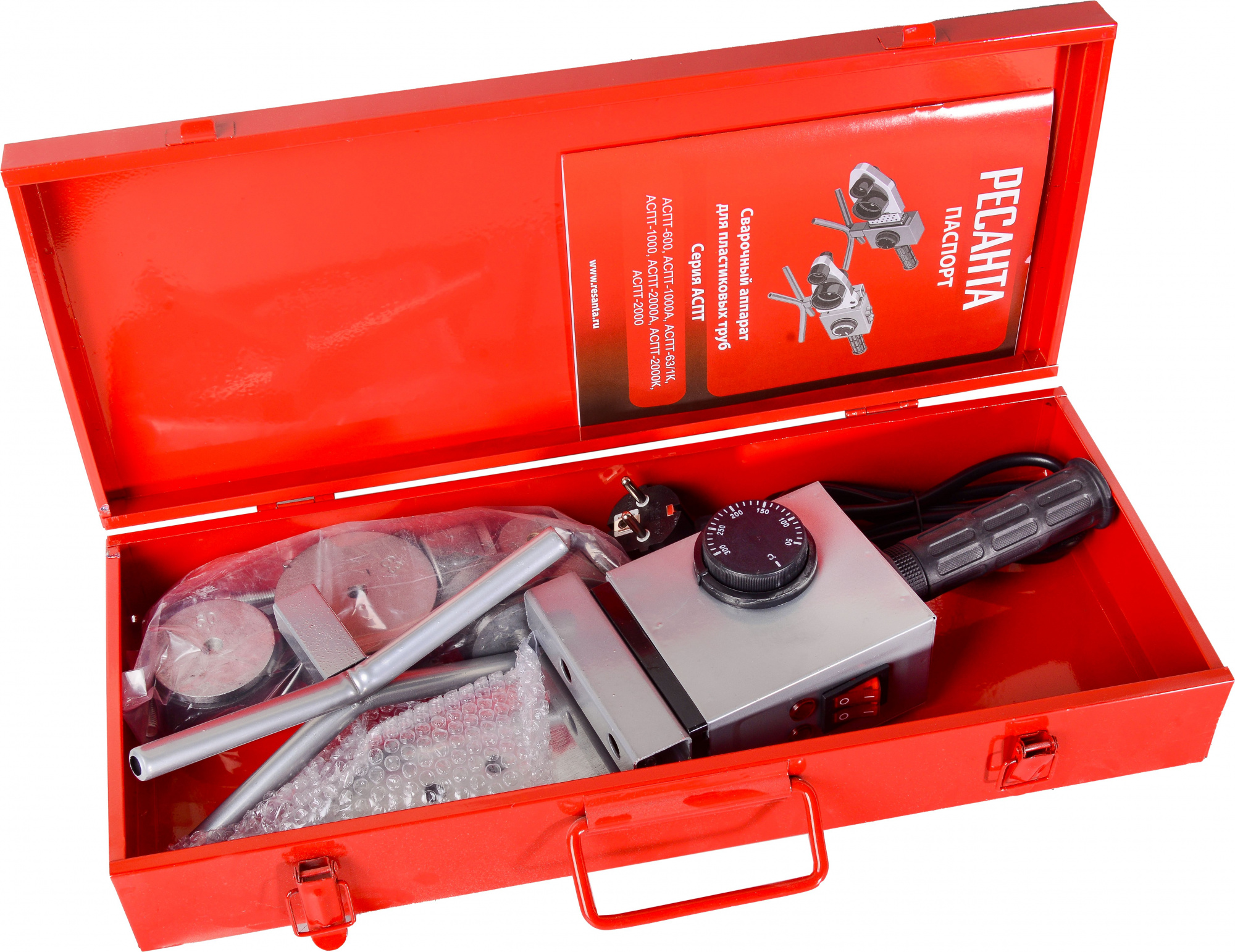Терморегулятор. Доп. в комплекте: насадки (диаметр 20, 25, 32, 40, 50, 63 мм.) - 6 шт.; подставка под сварочный аппарат; ключ имбусовый; кейс.