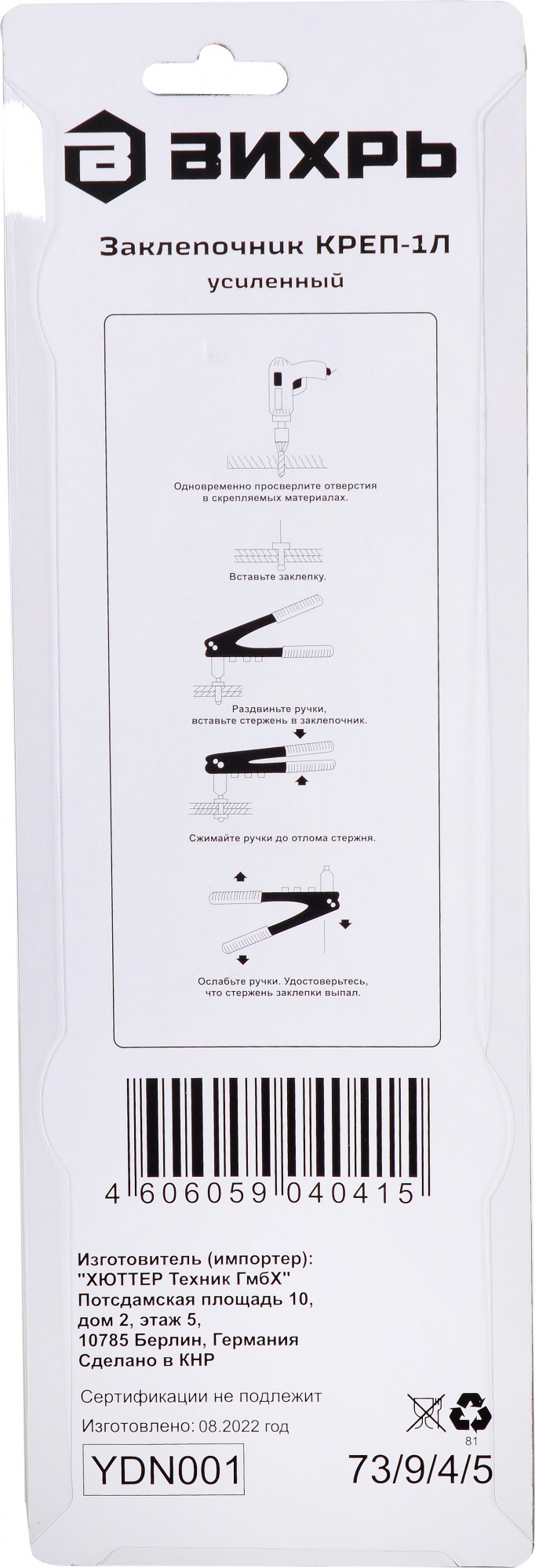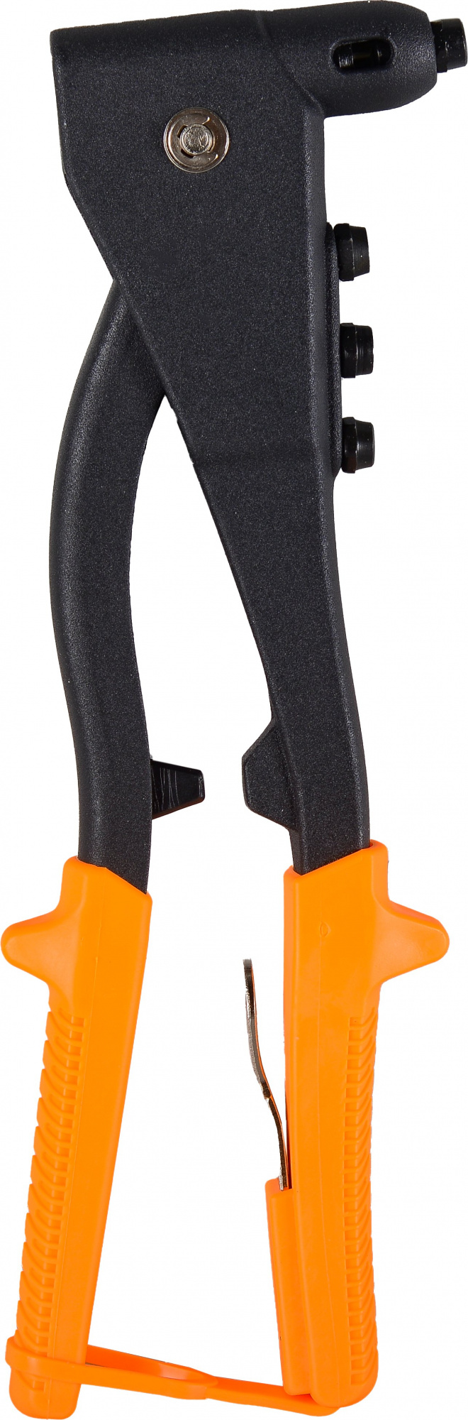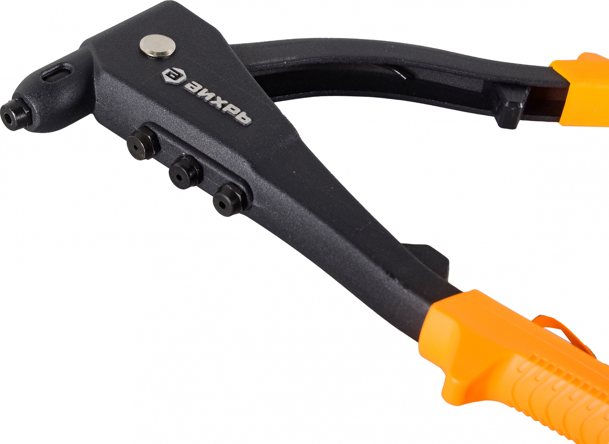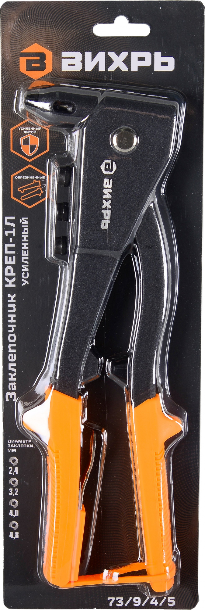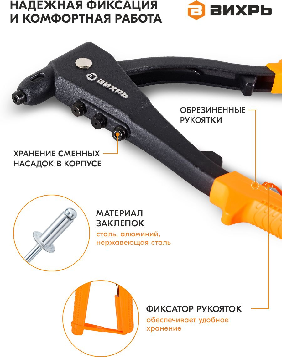 Типы заклепок: сталь/алюминий/нержавеющая сталь; Тип изделия: усиленный. В комплект входят 4 насадки под диаметры 2.4, 3.2, 4.0, 4.8 мм. и ключ для их замены. Насадки крепятся на инструмент, что создает дополнительное удобство в работе. Макс. скрепляемая толщина - 45 мм.