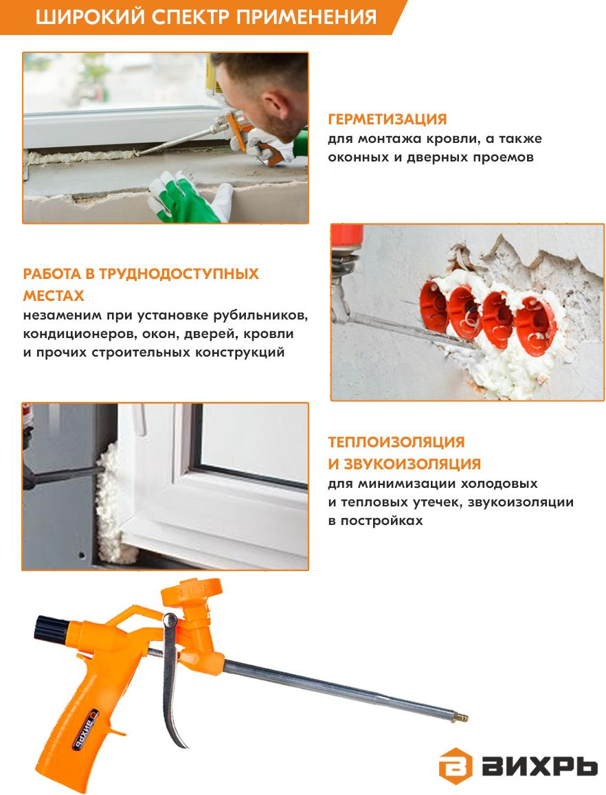 Пистолет для монтажной пены ВИХРЬ применяется в строительных и ремонтных работах. Незаменим при установке окон, дверей, кровли и прочих строительных конструкций, для работы в труднодоступных местах.