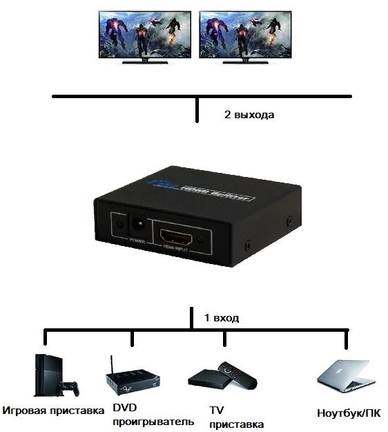 Делитель HDMI сигнала с усилителем 1 х HDMI "ВХОД" - 2 x HDMI "ВЫХОД". Предназначен для передачи цифрового HDMI аудио и видеосигнала от одного источника на два монитора. Поддерживает необходимый уровень сигнала за счёт питания от внешнего адаптера.