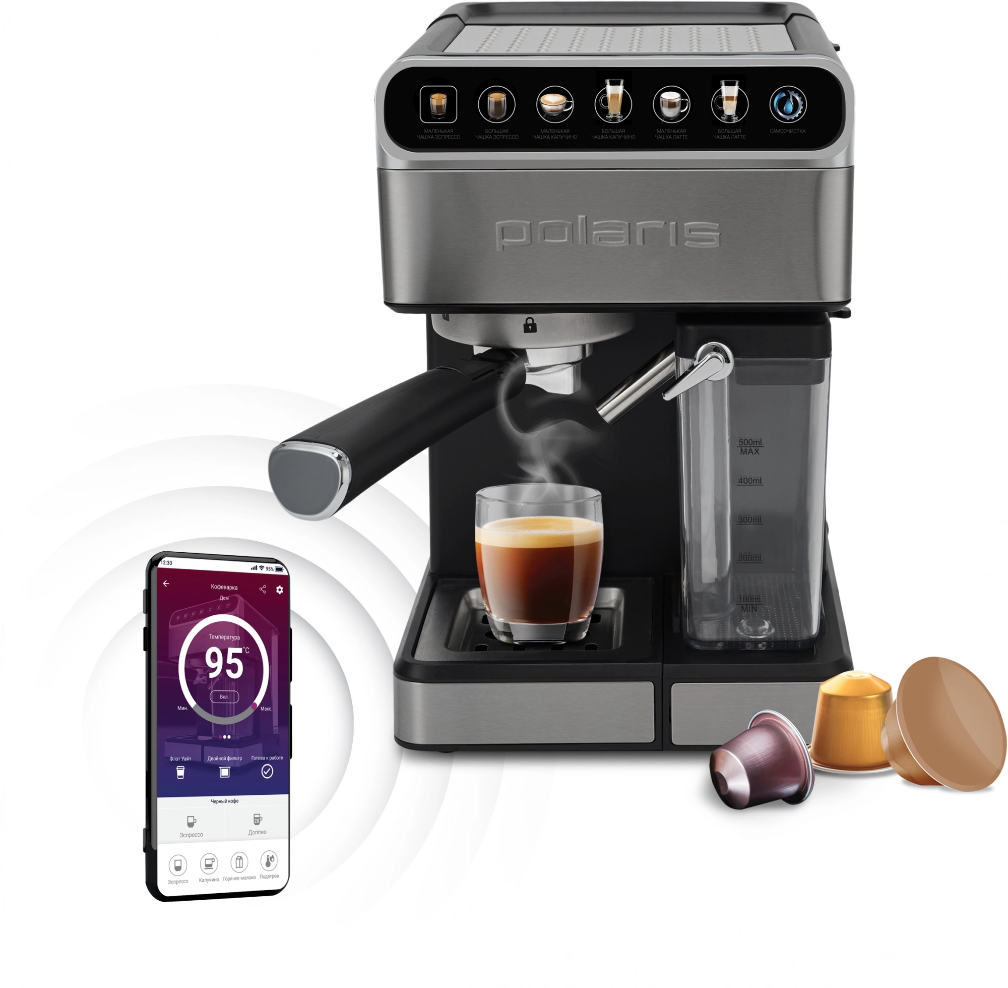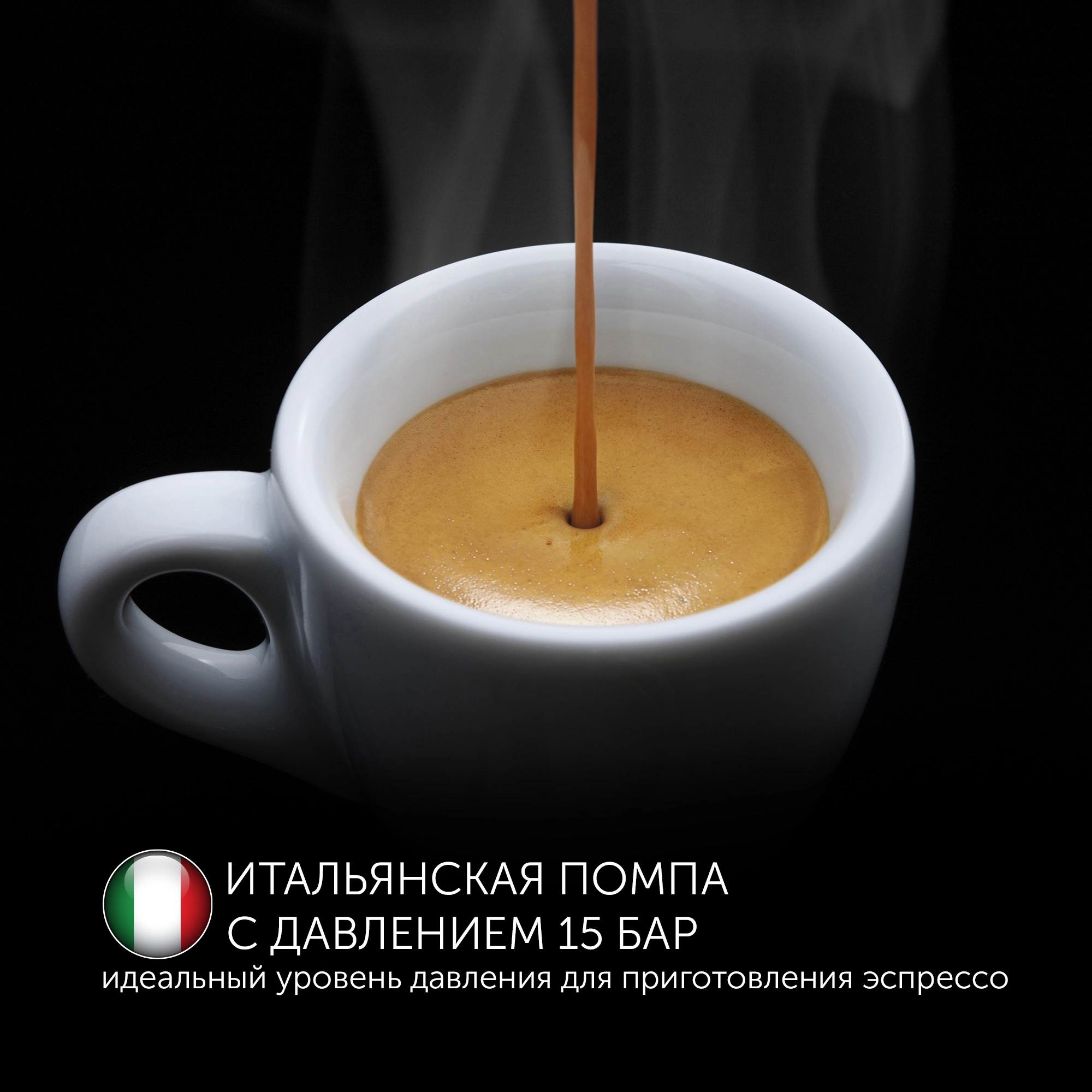 Рожковая кофеварка с автоматическим капучинатором, позволяющим готовить молочно-кофейные напитки в одно касание. Модель 3-в-1: работает с капсулами Nespresso и Dolce-Gusto, а также с молотым кофе.
