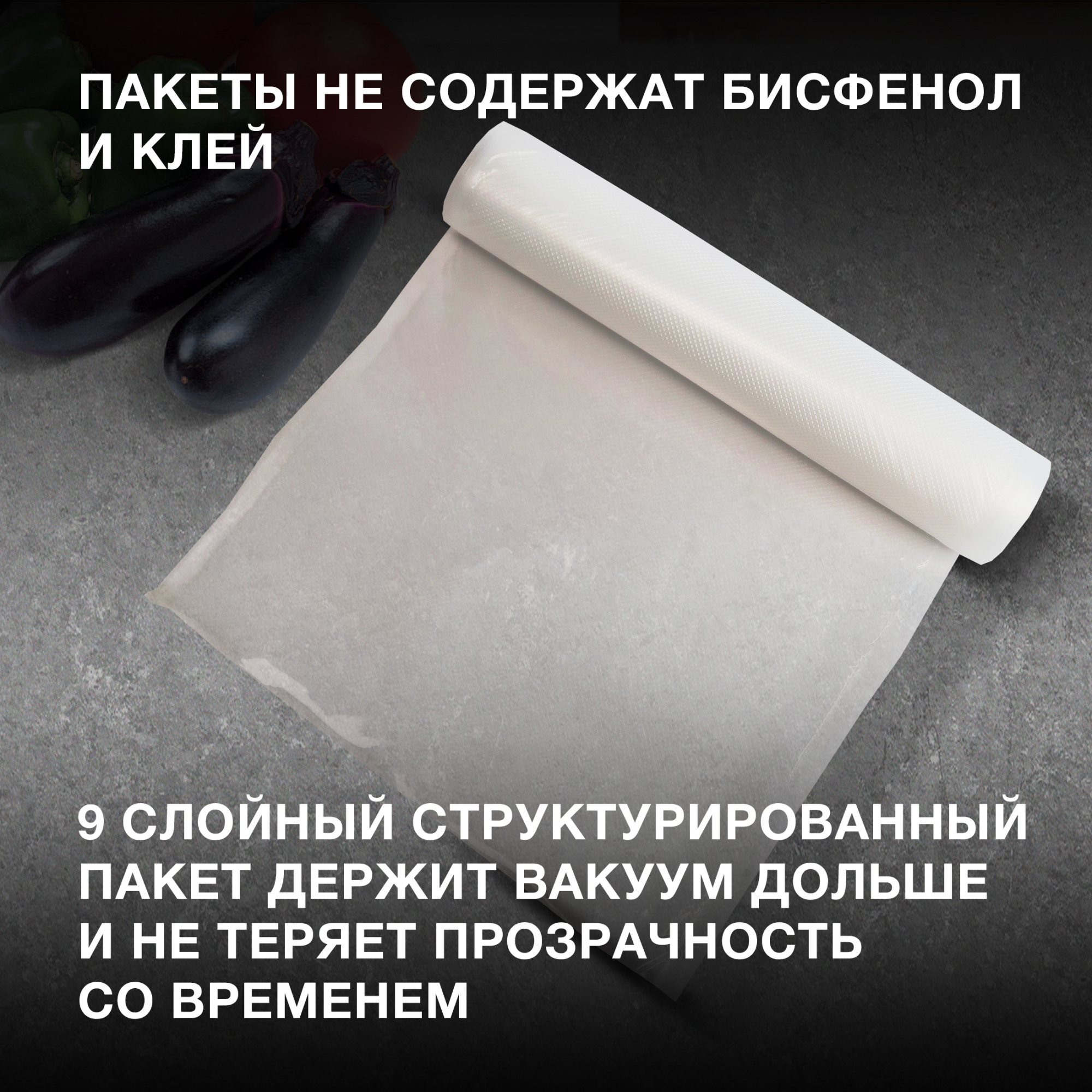 Данная модель оснащена эргономичной перфорацией и содержит 9 слоев специального покрытия, что обеспечивает надежную защиту пищи от порчи. Многослойная конструкция позволяет пакетам дольше выдерживать повышенное давление.