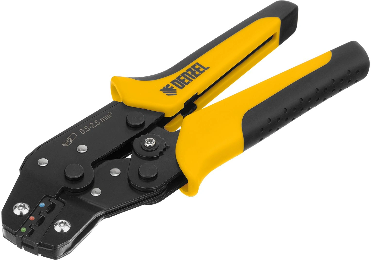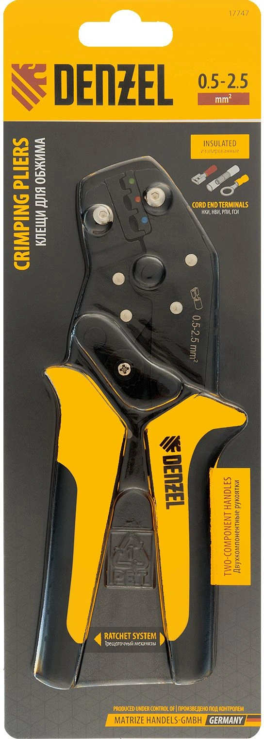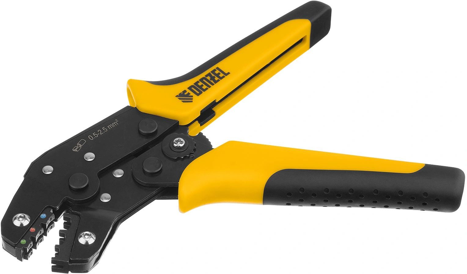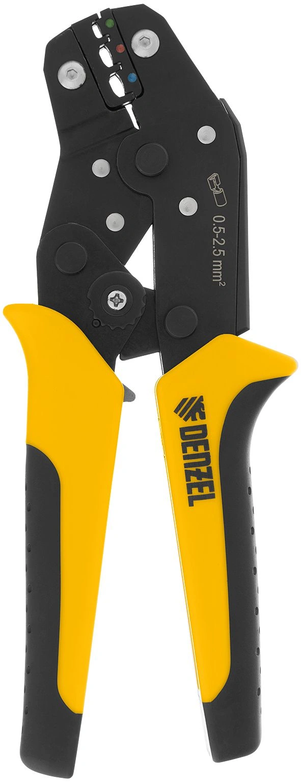 Клещи Denzel 17747 предназначены для обжима изолированных кольцевых наконечников НКИ и вилочных НВИ, разъемов плоских РПИ, гильз соединительных ГСИ сечением 0,5-2,5 кв.мм. Инструмент пригодится частным и профессиональным мастерам при проведении электромонтажных работ.