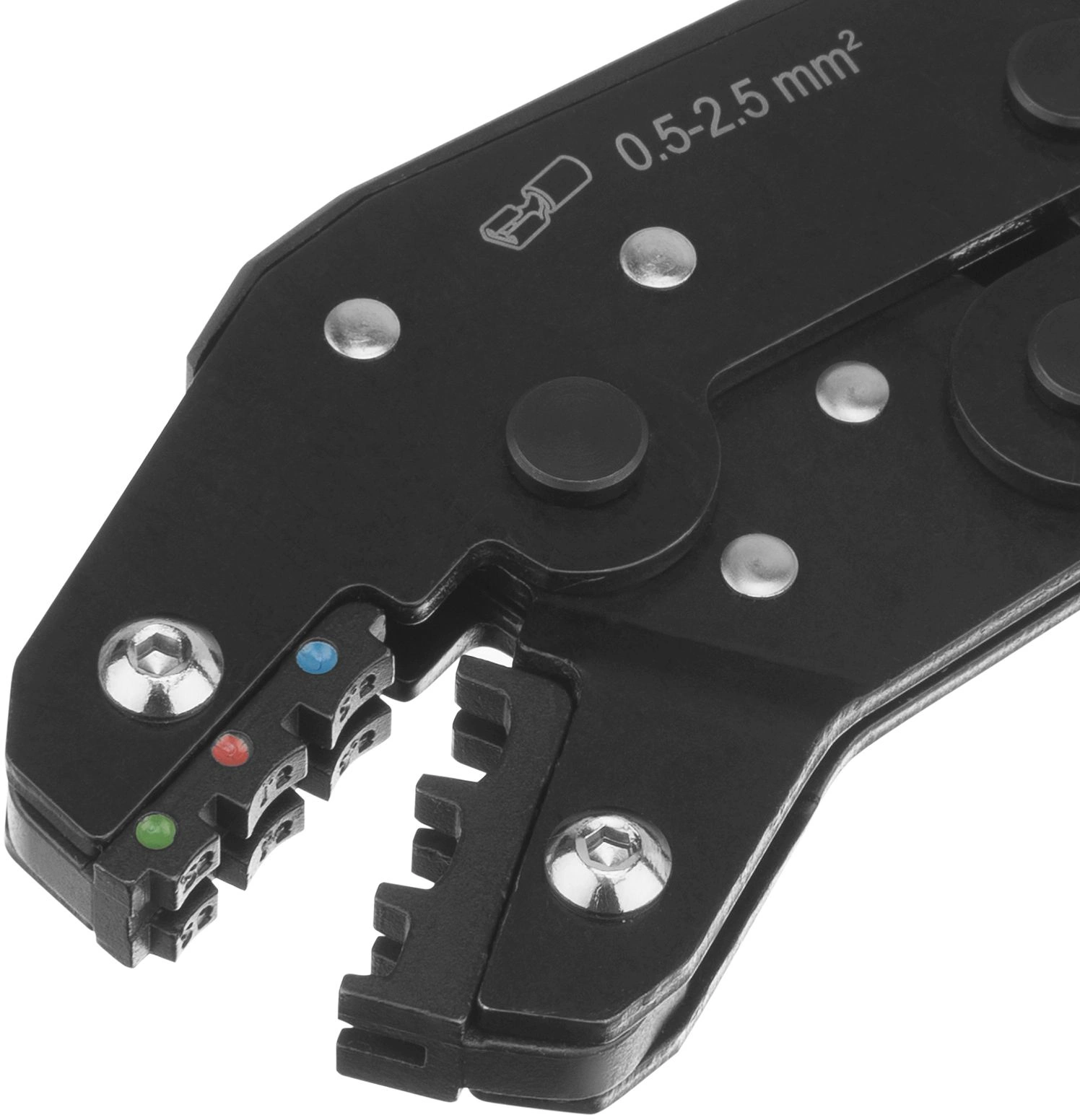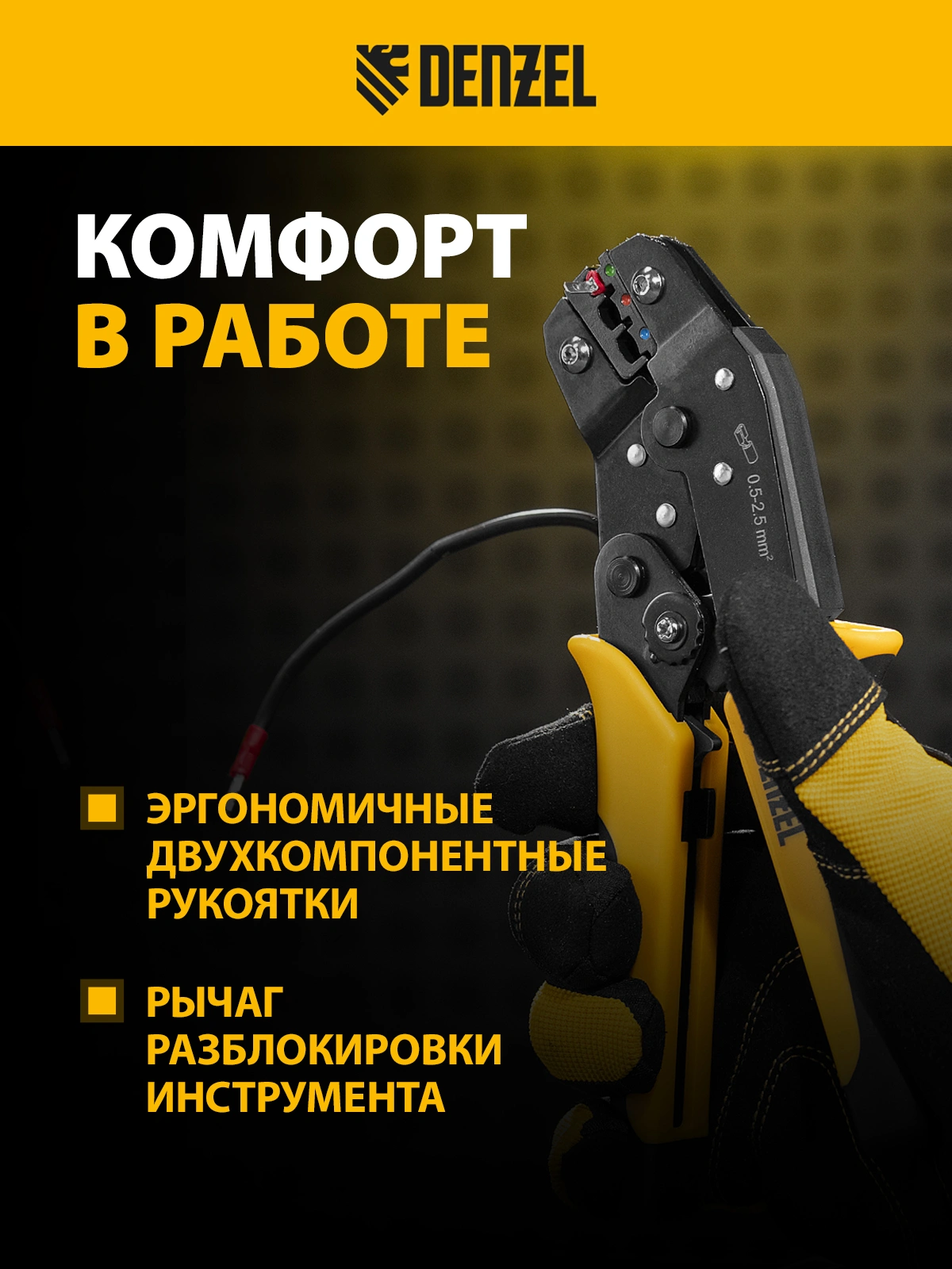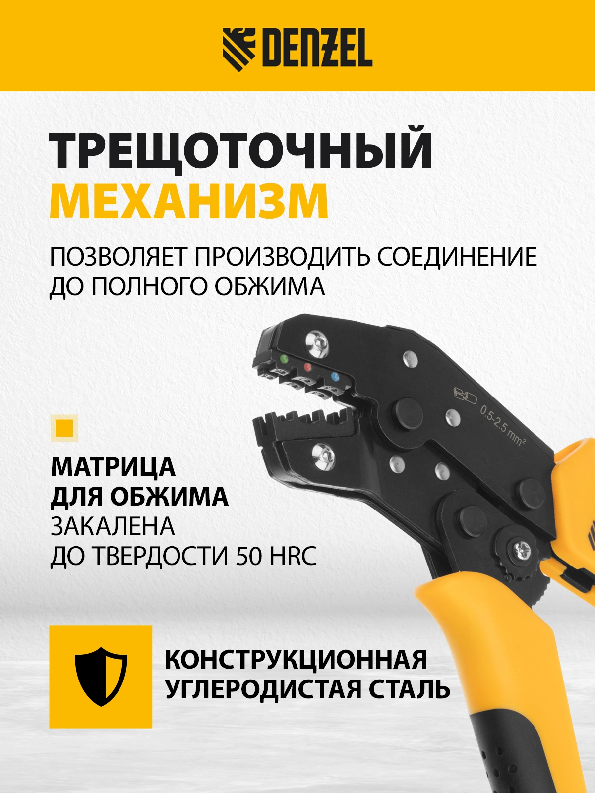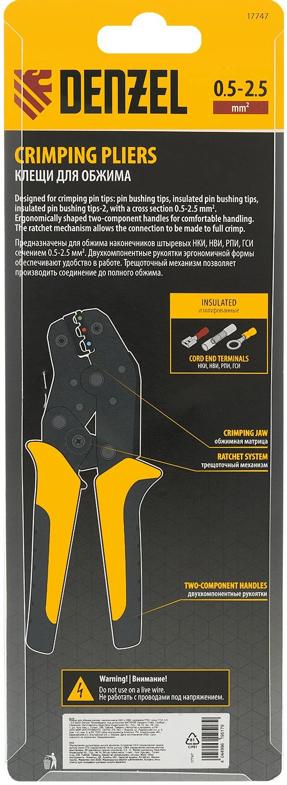 Клещи Denzel 17747 предназначены для обжима изолированных кольцевых наконечников НКИ и вилочных НВИ, разъемов плоских РПИ, гильз соединительных ГСИ сечением 0,5-2,5 кв.мм. Инструмент пригодится частным и профессиональным мастерам при проведении электромонтажных работ.