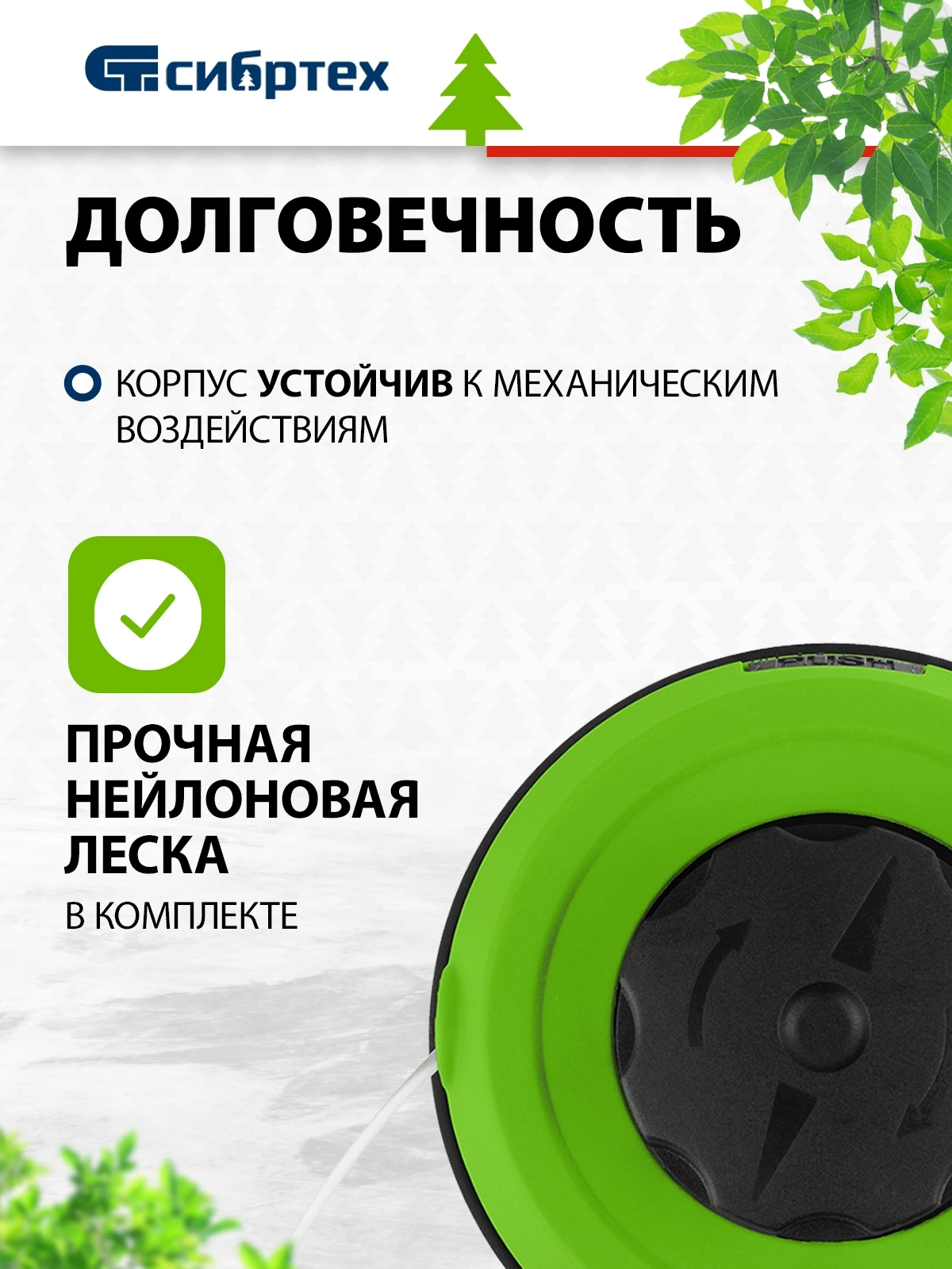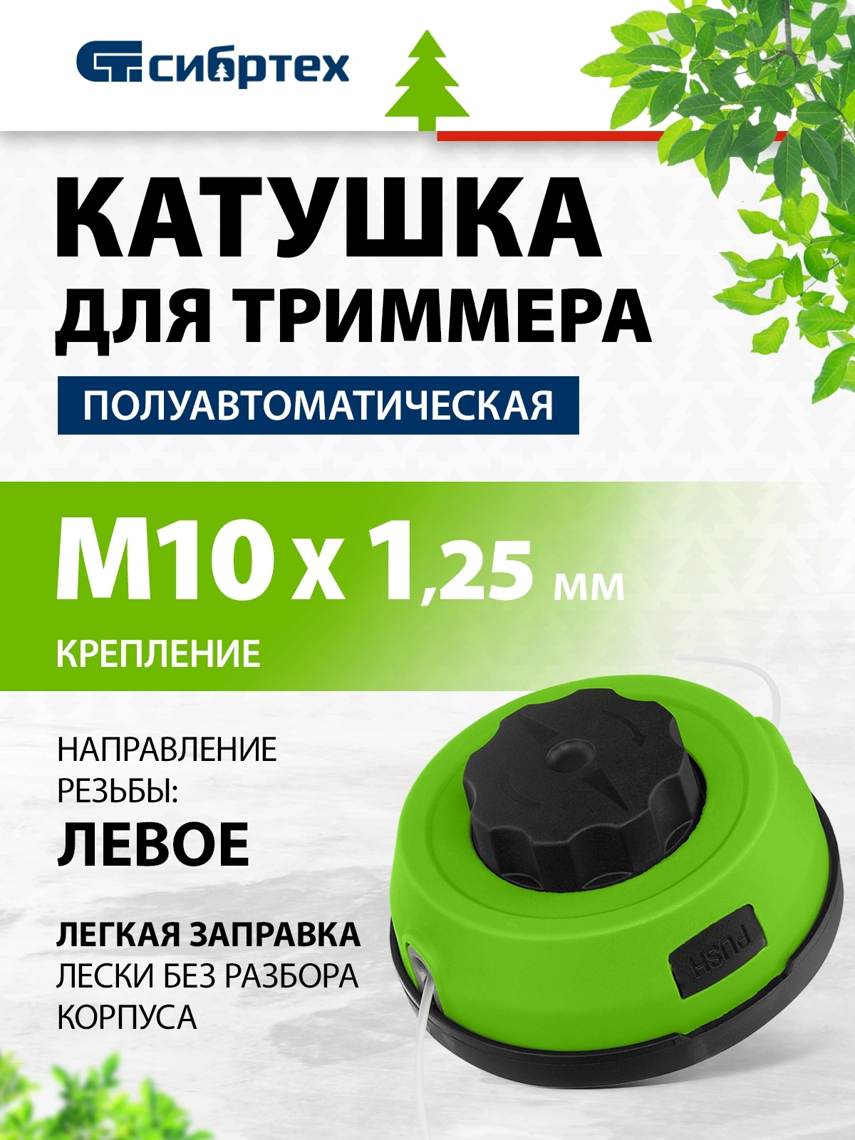 Полуавтоматическая катушка Сибртех 96373 с легкой заправкой лески крепится на вал бензинового или электрического триммера при помощи гайки М10 х 1,25 мм с левой резьбой. Заправляется леской диаметром до 3 мм, что позволяет использовать ее для подравнивания газона и скашивания сорняков.