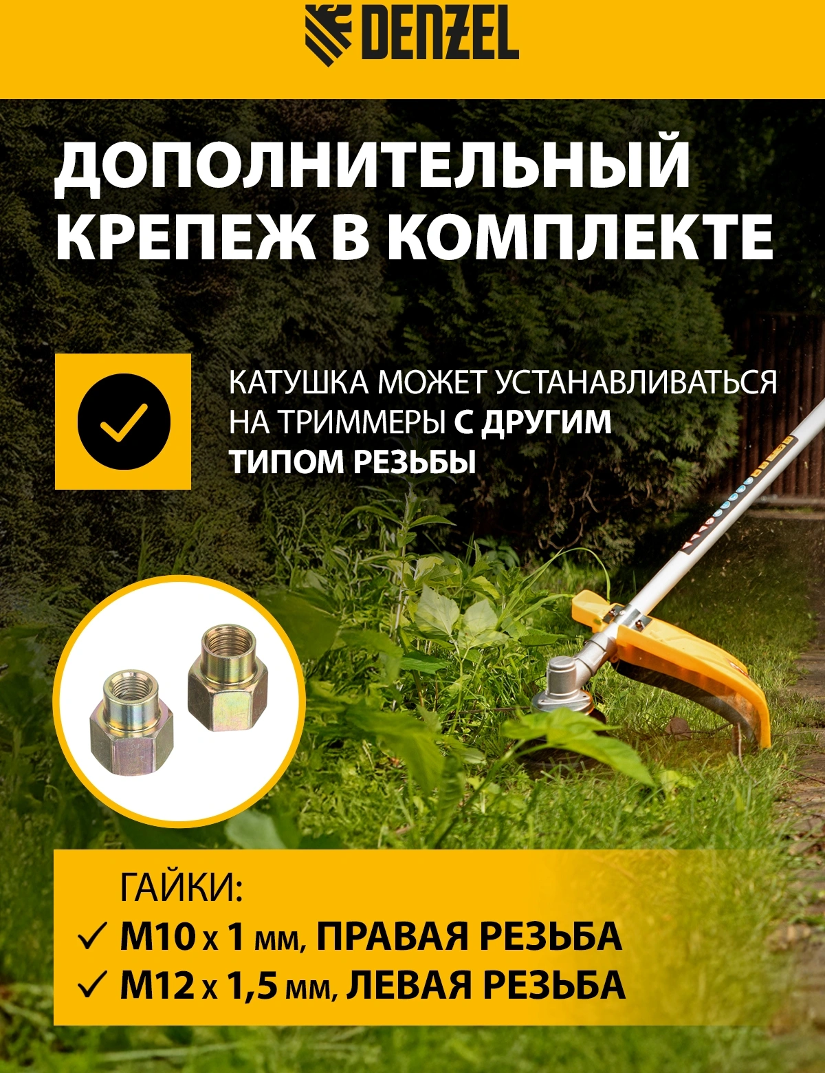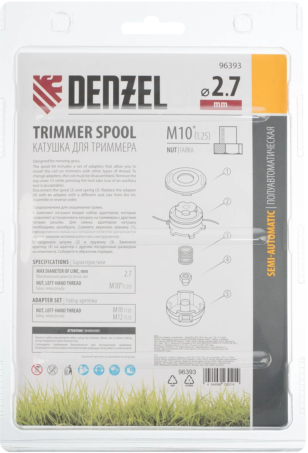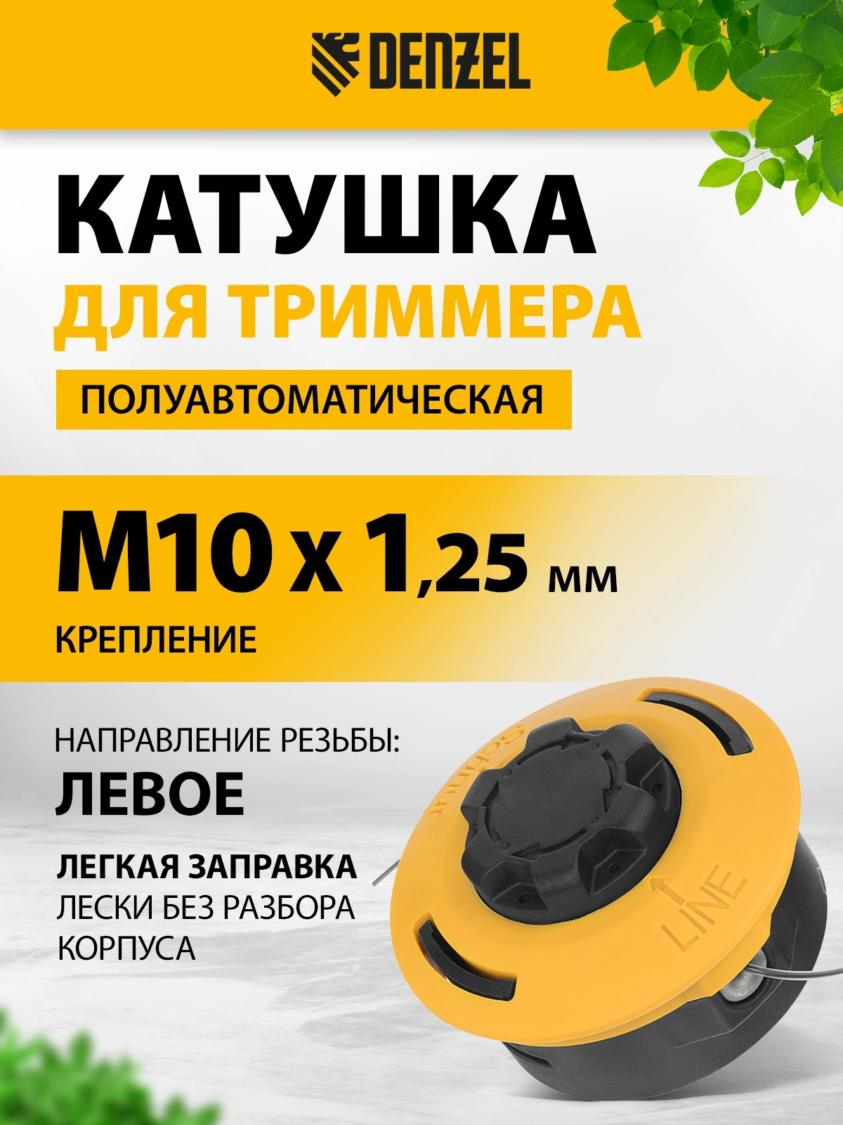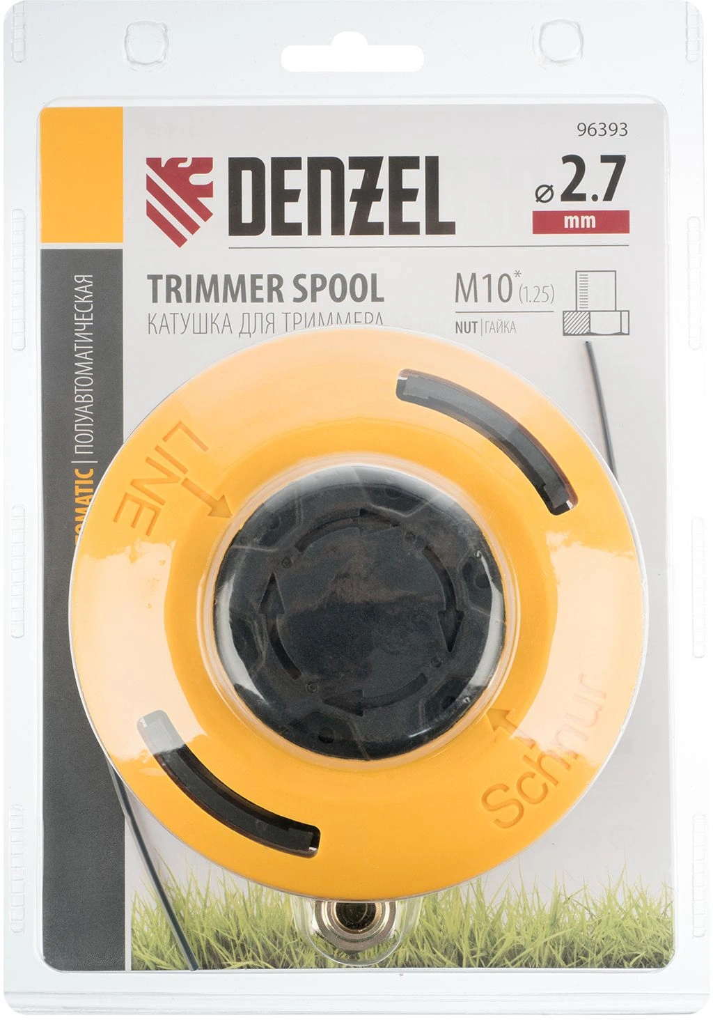 Полуавтоматическая триммерная катушка Denzel 96393 имеет посадочный размер M10 с левой резьбой 1,25 мм и комплектуется адаптерами M10 и M12 с шагом резьбы 1,0 и 1,5 мм соответственно. Служит оснасткой для электрического или бензинового триммера и используется для ухода за озелененными территориями.