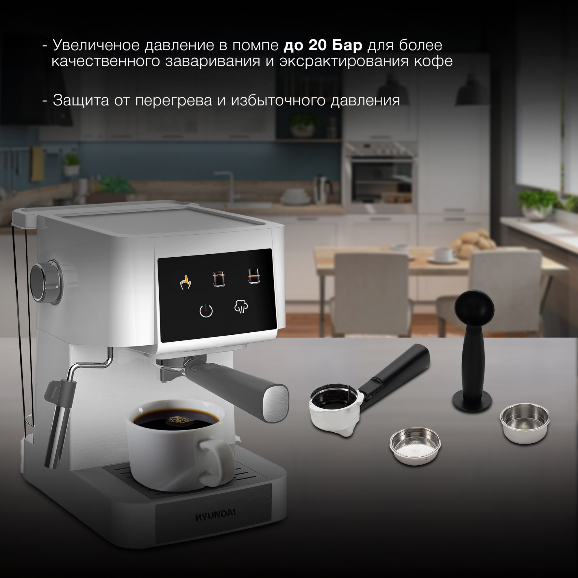 Создаваемое помпой давление до 20 бар гарантирует получение крепкого и насыщенного напитка.