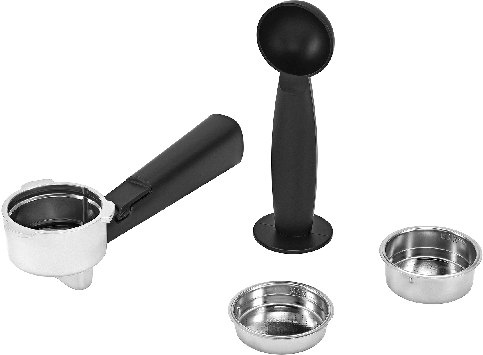 В комплектацию входят два сита-фильтра, рассчитанных на 1 и 2 стандартных порции напитка, а также мерная ложка-темпер для их наполнения и выравнивания молотого кофе.