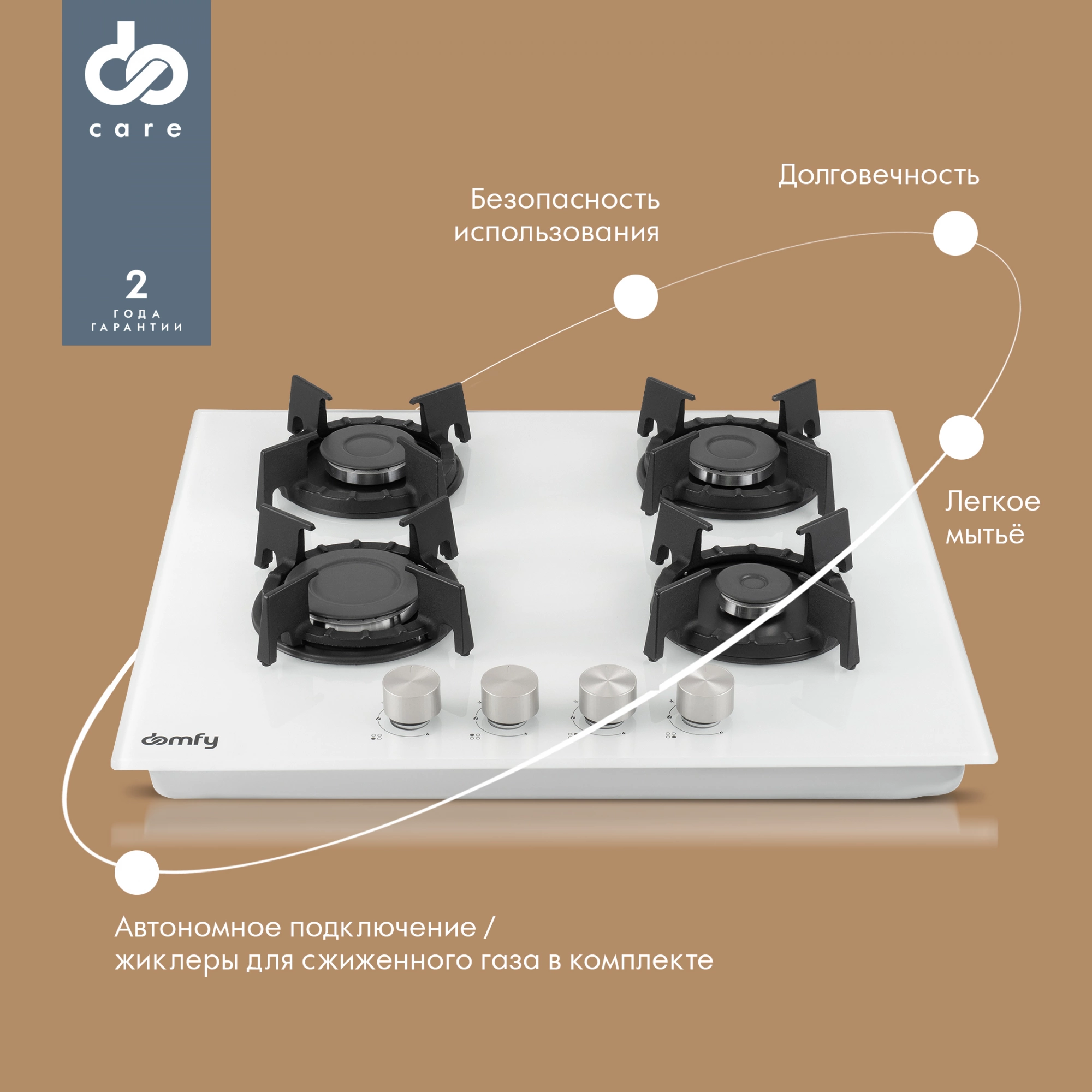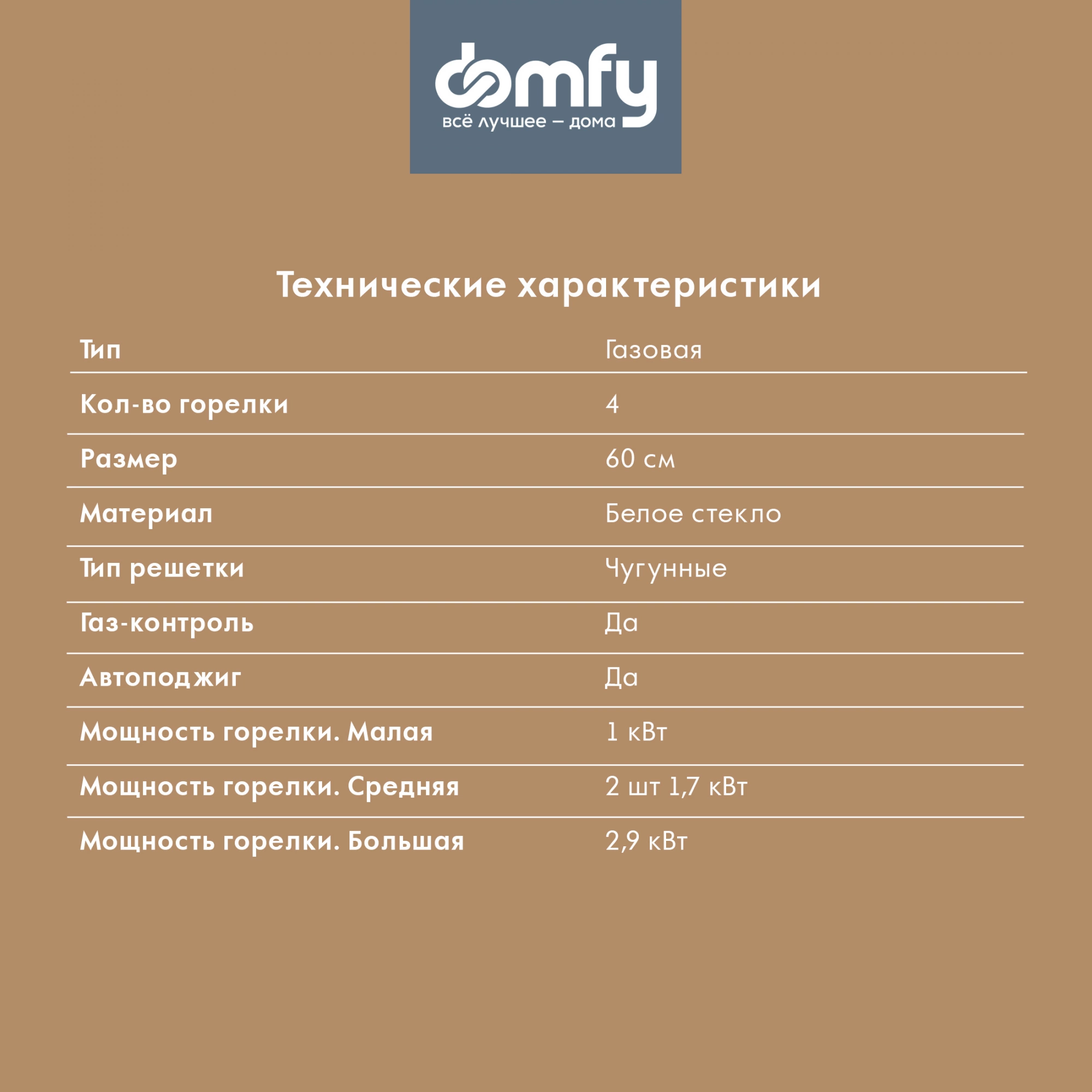 Встраиваемая газовая варочная панель DOMFY DM6430GH WG сочетает практичность, надежность и простоту управления, делая процесс приготовления пищи максимально комфортным.