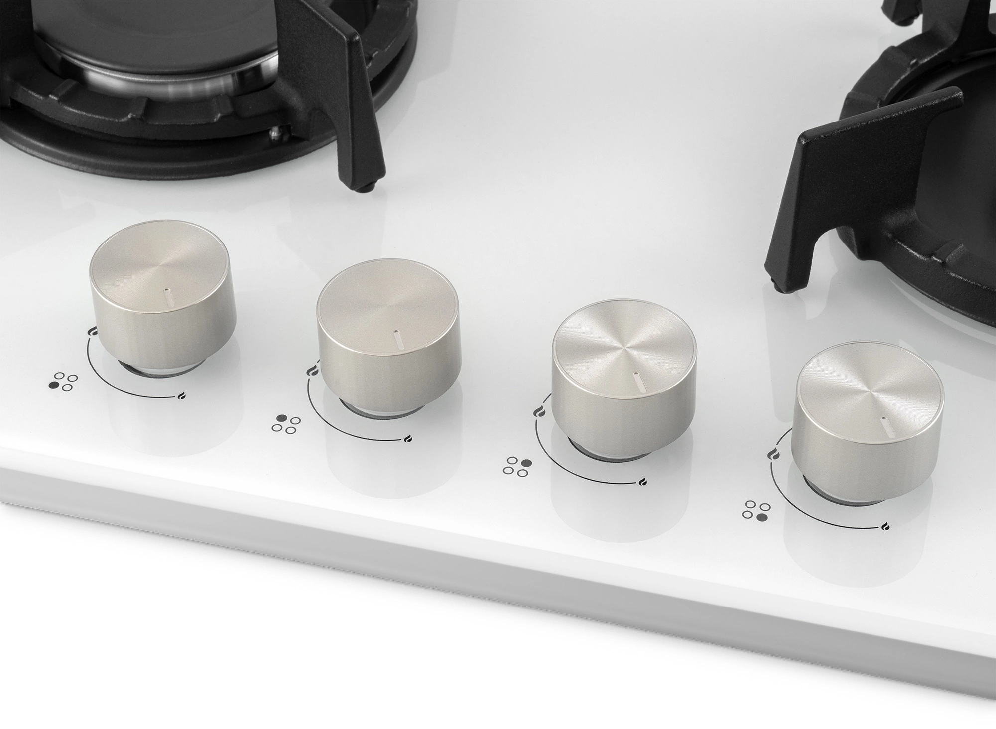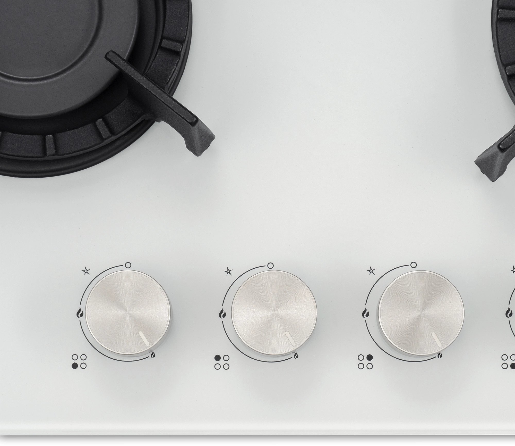 Механические поворотные регуляторы обеспечивают точное и удобное управление пламенем. Графические обозначения рядом с ручками помогают быстро определить, какая конфорка будет включена. Встроенные пьезоэлементы поджигают газ одновременно с началом его подачи.