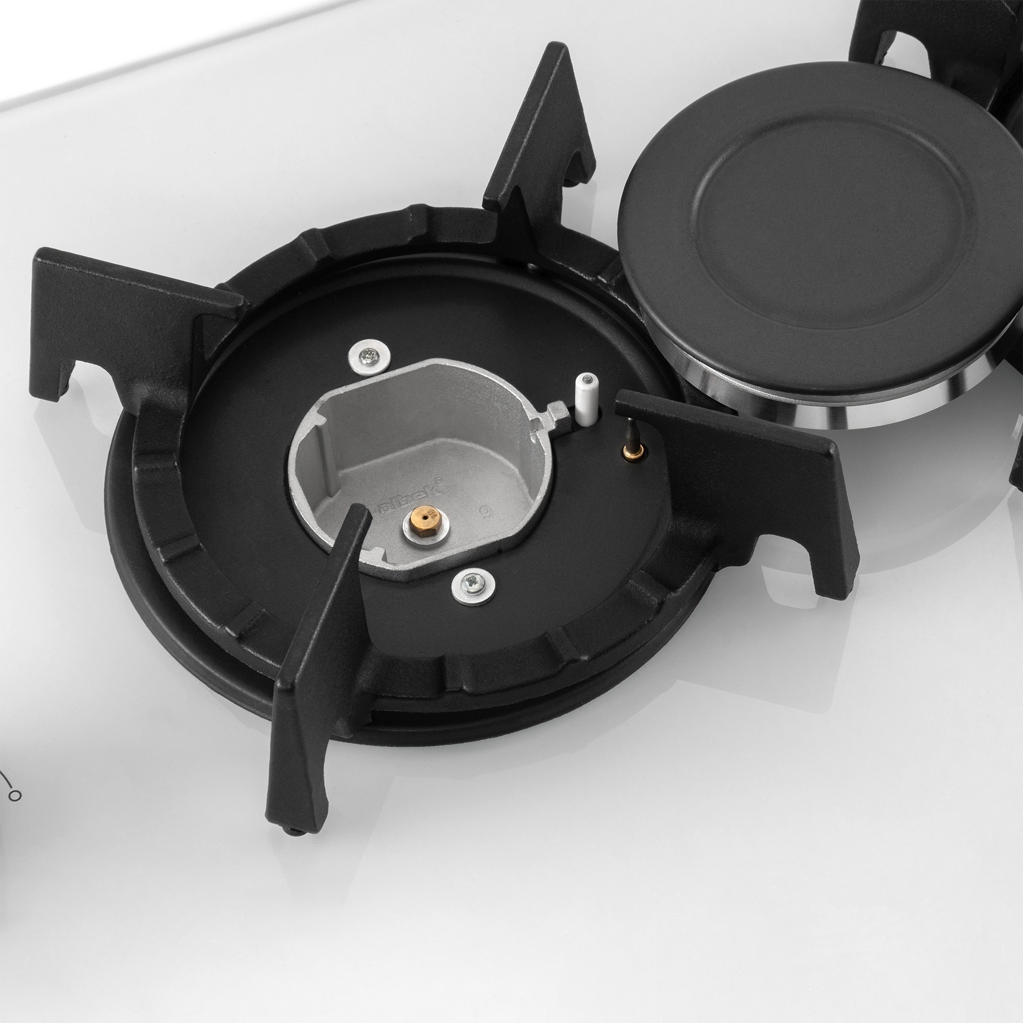 Четыре газовые конфорки различной мощности (1 кВт, 2х1,7 кВт и 2,9 кВт) позволяют использовать посуду разного размера, обеспечивая оптимальный расход газа и минимальные теплопотери. Можно готовить сразу несколько блюд, экономя время.