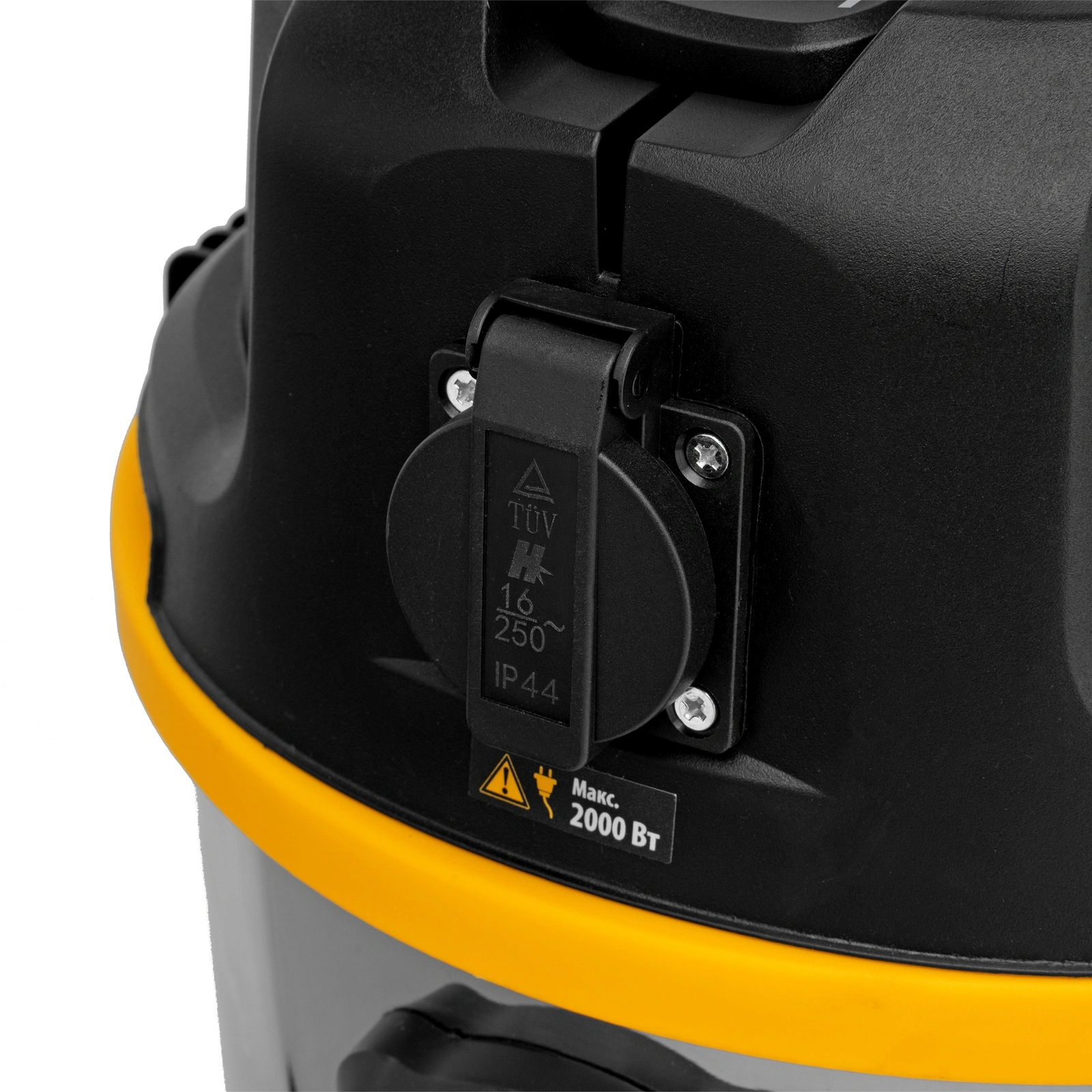 Наличие встроенной розетки для подключения электроинструмента; Возможность сбора жидкости; Функция полуавтоматической очистки; Функция выдува; Термозащита; Мешки и фильтры в комплекте; Пробка для слива воды; Комплект адаптеров для электроинструмента