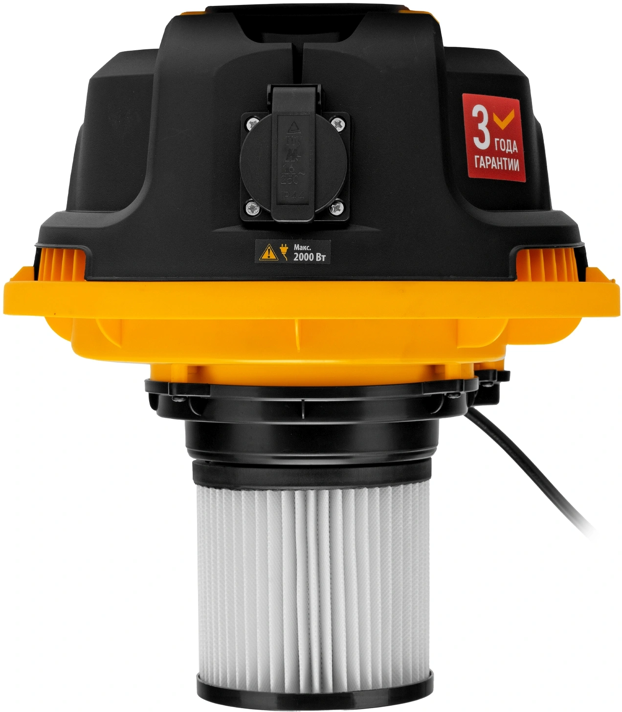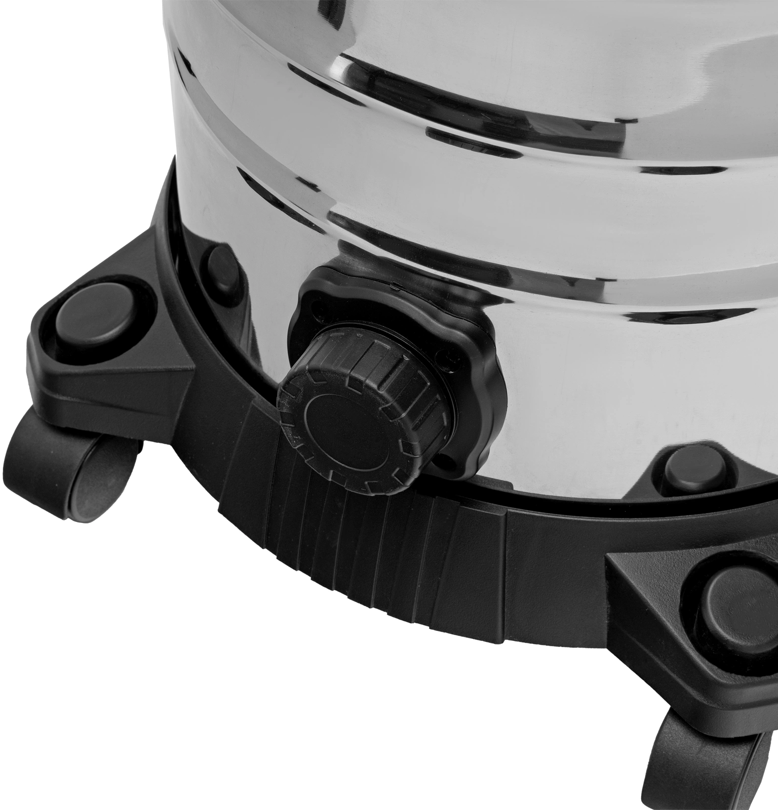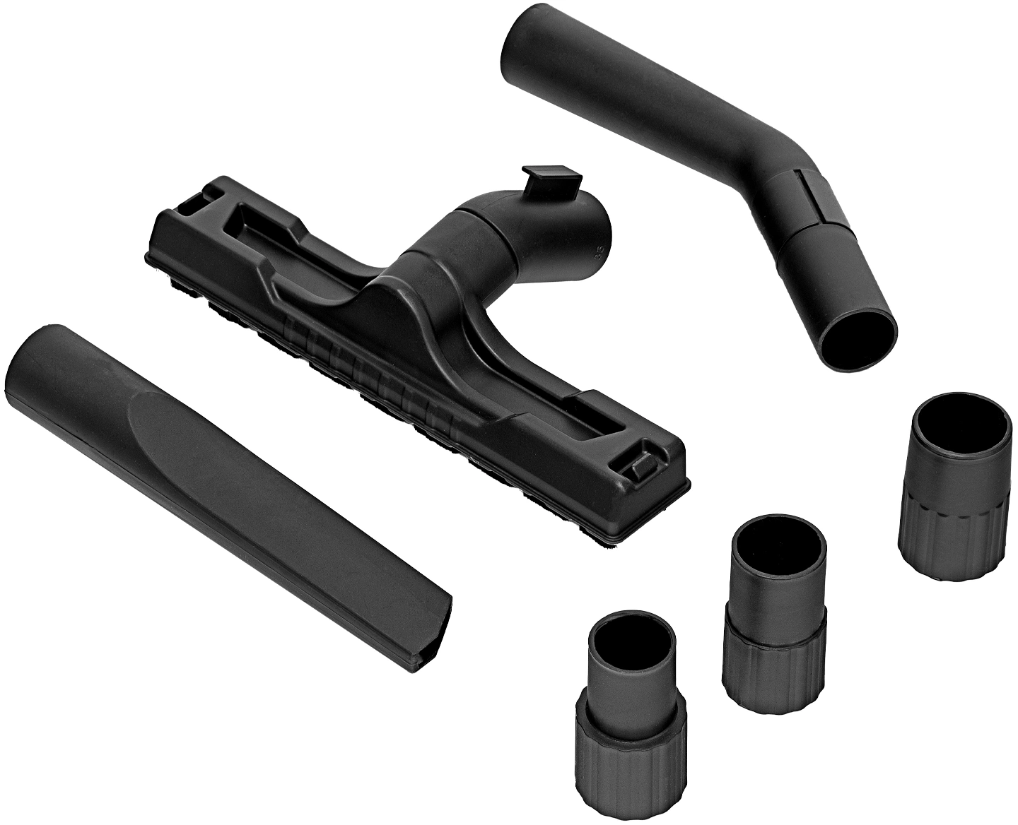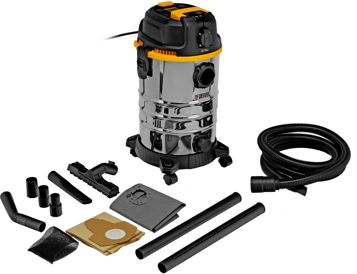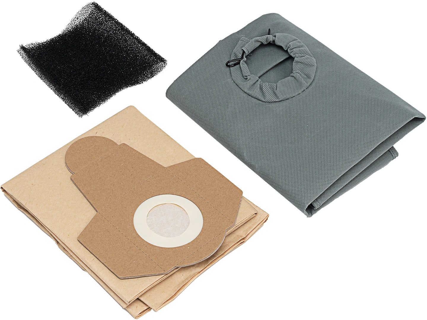Компл.:Пылесос, Шланг-воздухопровод с адаптерами, Коврово-половая насадка, Изогнутая труба (ручка), Переходник для электроинструмента, Щелевая насадка, Удлинитель, HEPA фильтр, Воздушный фильтр для сбора воды, Бумажный мешок для мусора, Тканевый мешок для мусора, Поворотные колеса, Мембранный фильтр