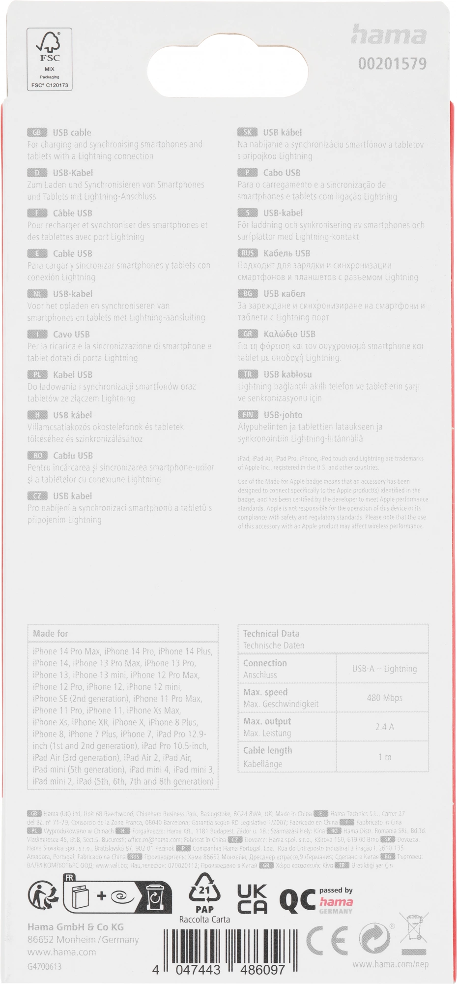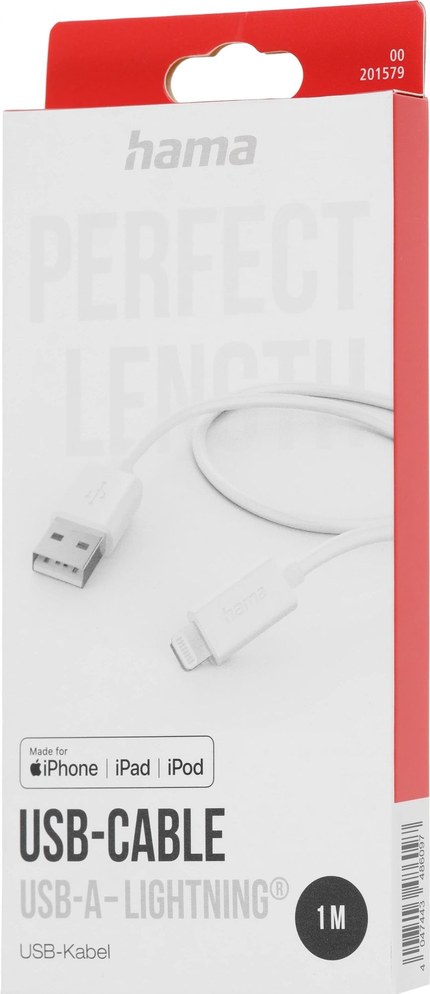 Кабель для зарядки Hama , USB-A - Lightning. Максимальная совместимость со всеми Apple iPhone, iPad и iPod