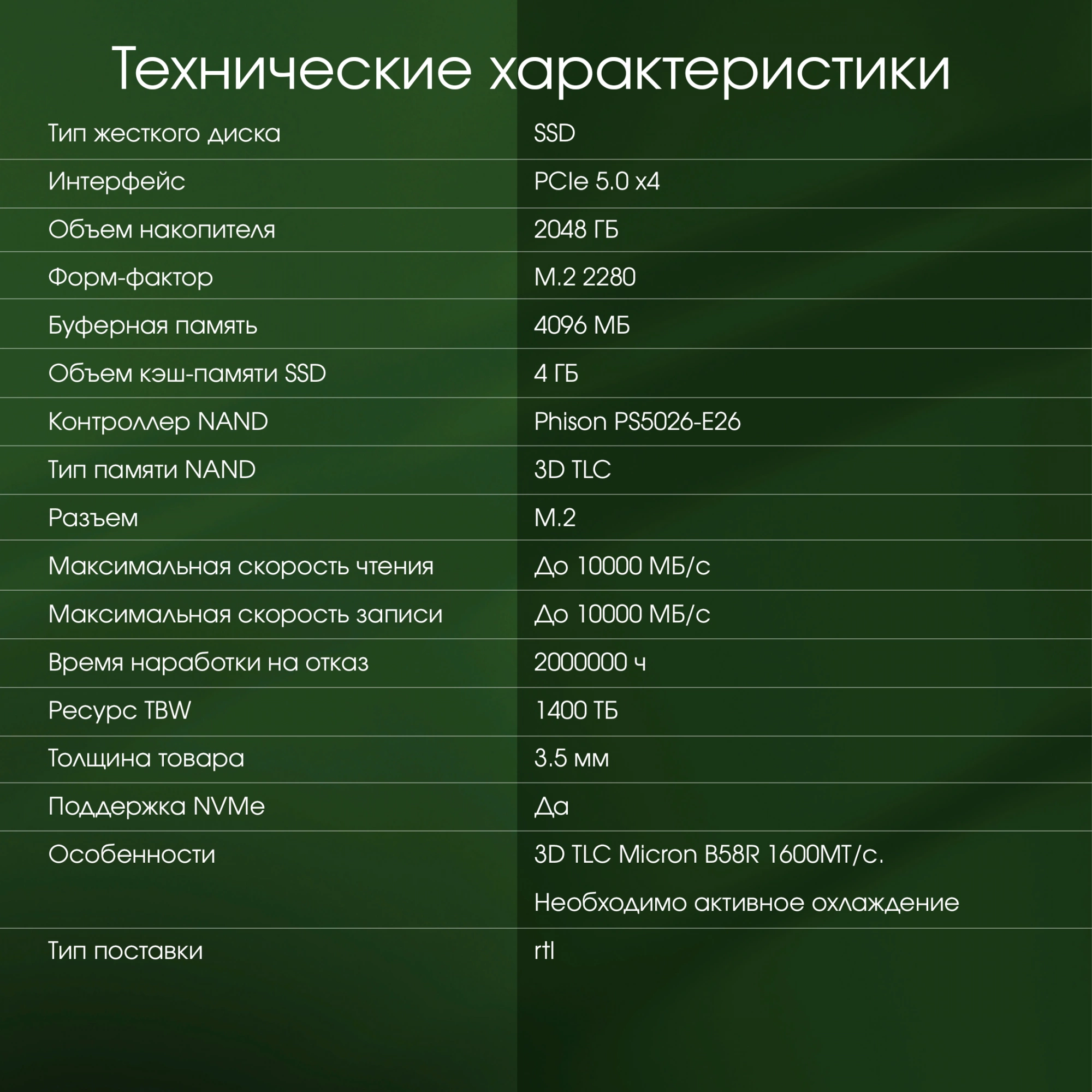 Контроллер Phison PS5026-E26 обеспечивает высокую производительность и надежность работы накопителя. Скорость чтения данных достигает 10000 МБ/с, а скорость записи — 10000 МБ/с. Это позволяет быстро загружать операционную систему и приложения, а также быстро получать доступ к большим объемам данных.