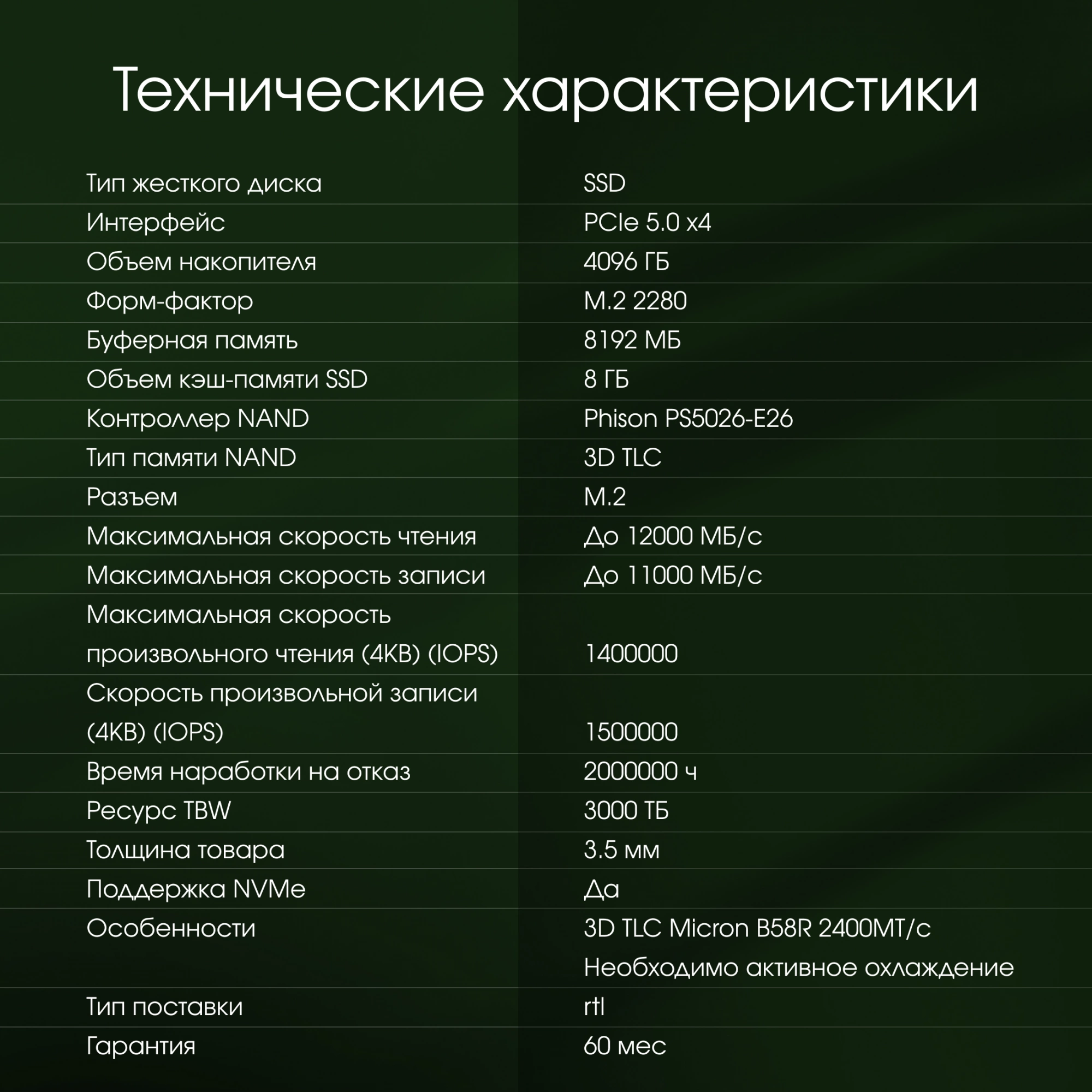 Интерфейс PCIe 5.0 x4 предлагает особенно высокую скорость передачи данных, которая задает новый стандарт для высокопроизводительных систем и будущих технологий хранения. Поддержка NVMe позволяет существенно ускорить загрузку операционной системы и приложений, обеспечить быстрое копирование файлов и улучшить общую отзывчивость системы. NVMe предлагает возможность оптимизированного хранения, что важно для работы с базами данных, виртуализацией и другими ресурсозатратными приложениями. TRIM помогает управлять свободным пространством и увеличивает срок службы накопителя. DRAM буфер обеспечивает дополнительную производительность за счет кэширования данных.