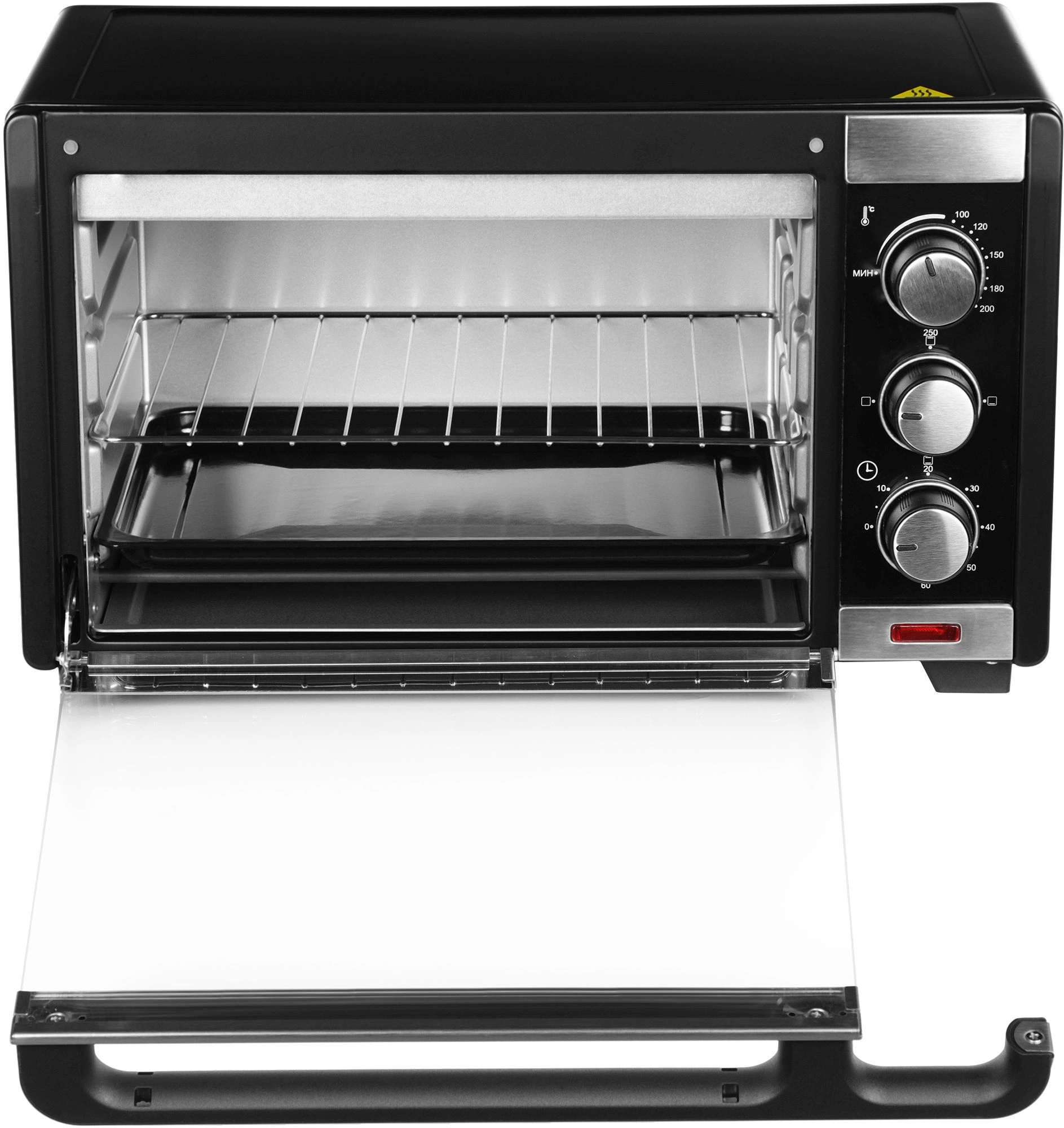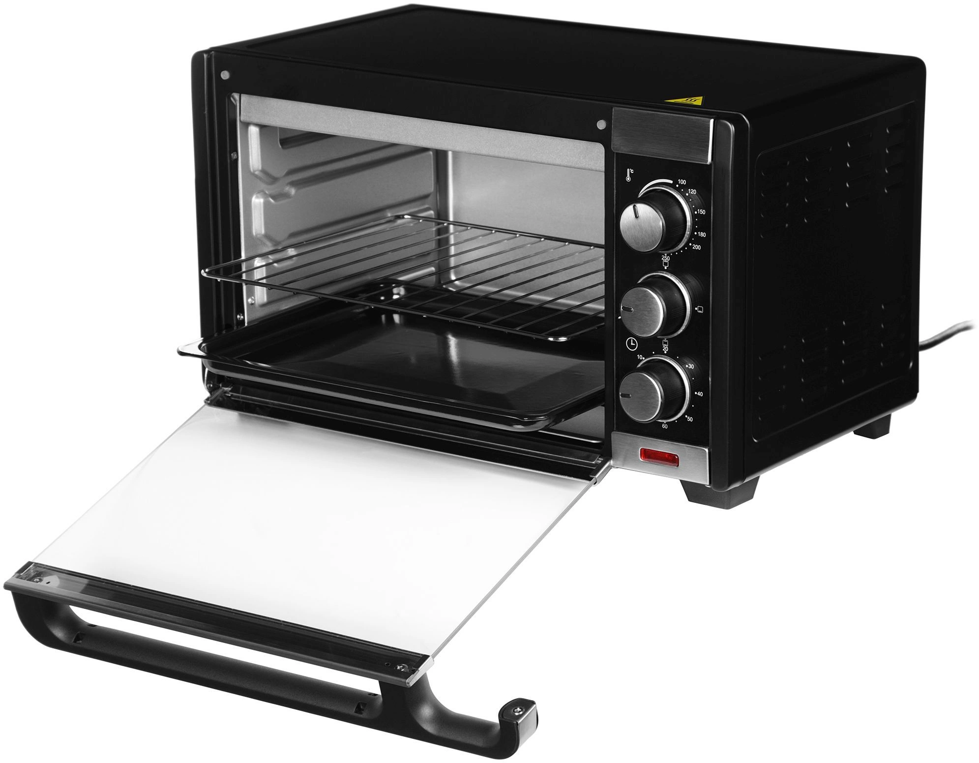Удобное механическое управление. Мини-печь оснащена тремя удобными поворотными переключателями. С помощью верхней ручки устанавливайте температуру в диапазоне от 100 до 250°C. Средний переключатель предназначен для выбора режимов работы, а нижний – для настройки таймера.