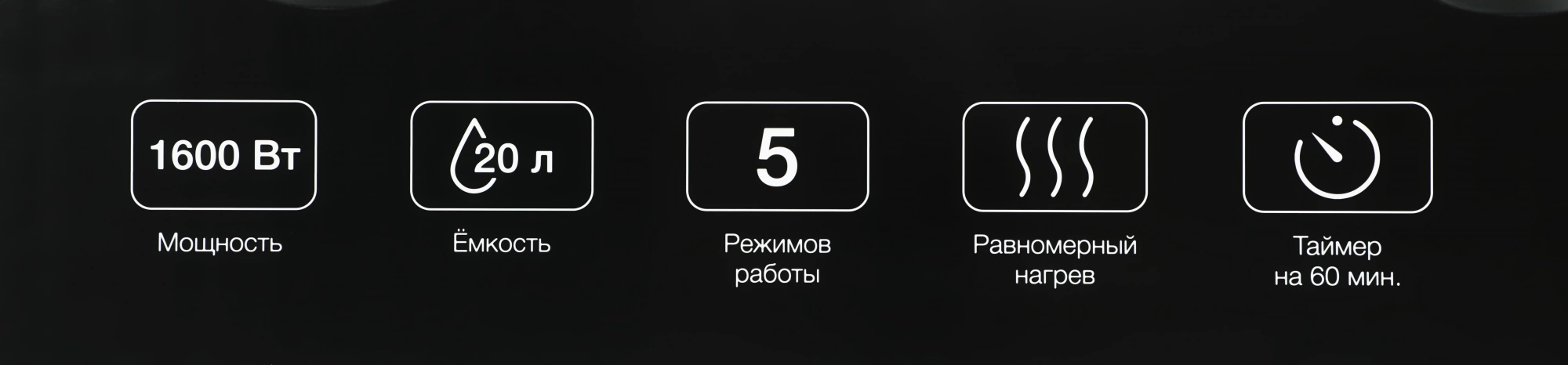 Таймер до 60 минут. Регулируйте время приготовления в пределах часа с шагом в 5 минут. Максимального времени таймера хватит для запекания курицы и утки средних размеров, свиных отбивных, а также почти любой рыбы и овощей.