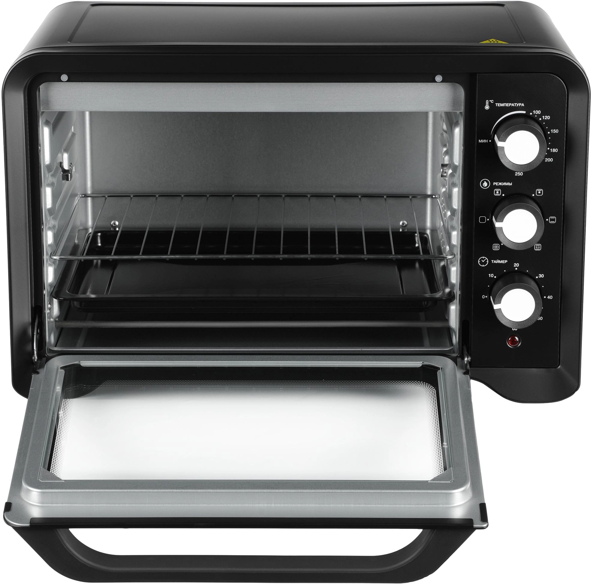 Удобное механическое управление. Мини-печь оснащена тремя поворотными переключателями с интуитивно понятными обозначениями. С помощью верхней ручки устанавливайте температуру в диапазоне от 100 до 250°C. Средний переключатель предназначен для выбора режимов работы, а нижний – для запуска таймера. С легкостью ориентируйтесь в настройках благодаря уникальному дизайну ручек управления: яркая белая полоска на черном фоне указывает на установленное значение.