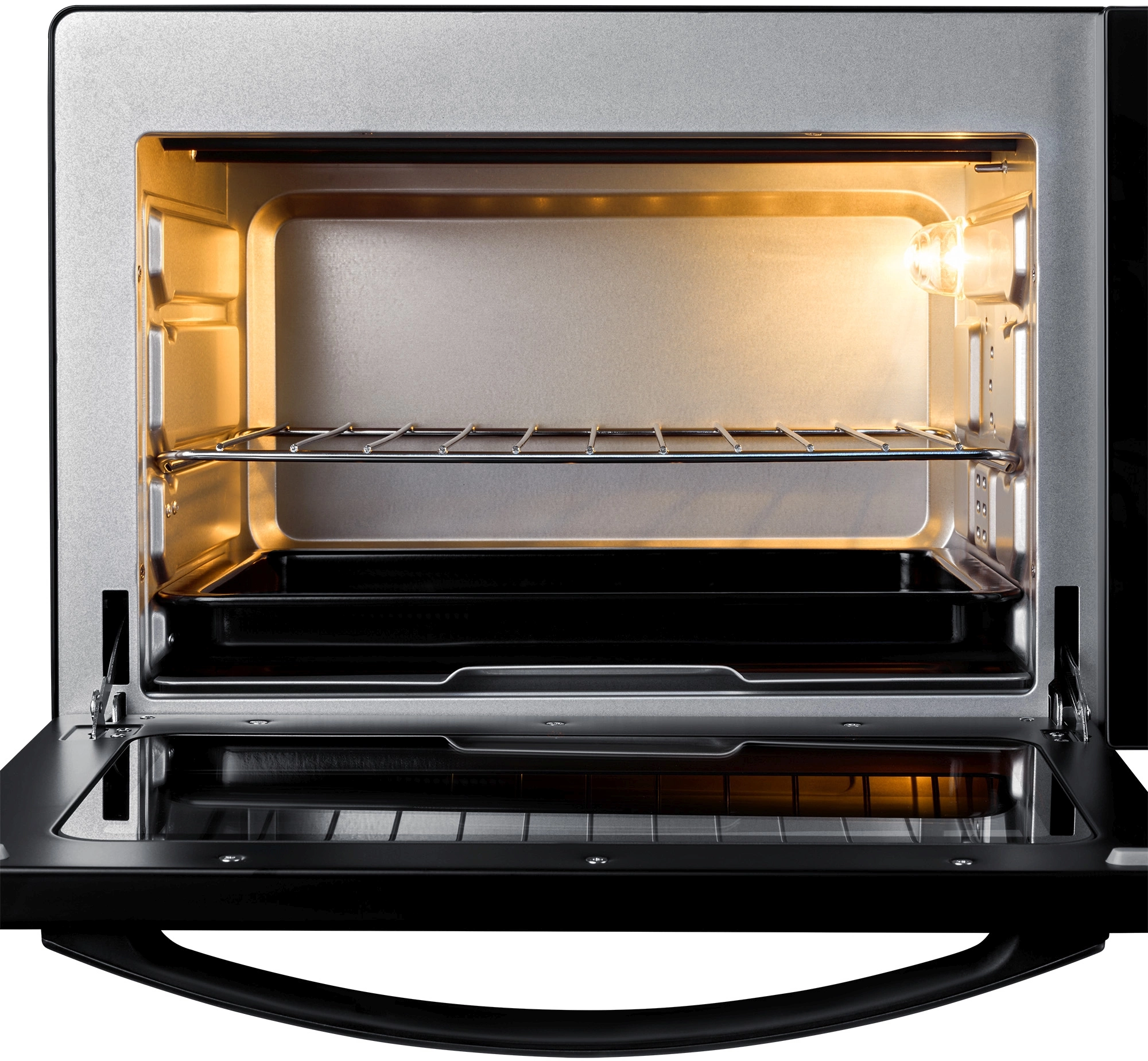 Печь имеет вместительный объем — 28 литров, что позволит готовить большие порции еды одновременно. Ручка печи выполнена из нержавеющей стали, а фронтальное покрытие изготовлено из прочного стекла.