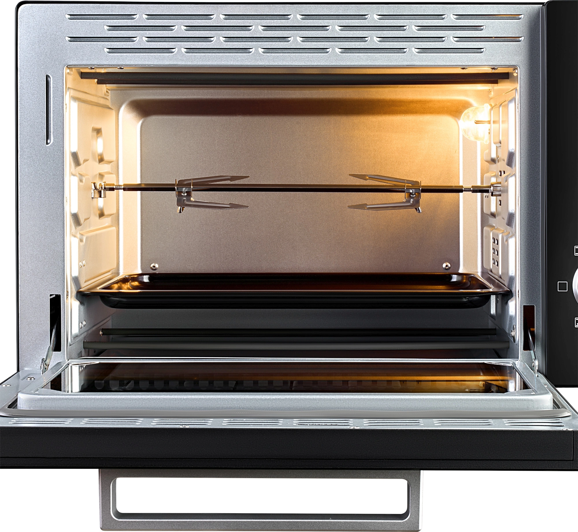 Интуитивно понятное сенсорное управление. В одно касание устанавливайте нужную температуру приготовления от 40 до 250 °C. Регулируйте заданные параметры кнопками «+» и «-». Таймер управляется таким же образом. Следите за временем и температурой – все показатели хорошо видны на двух дисплеях. Выбирайте нужный режим работы мини-печи с помощью поворотного регулятора.