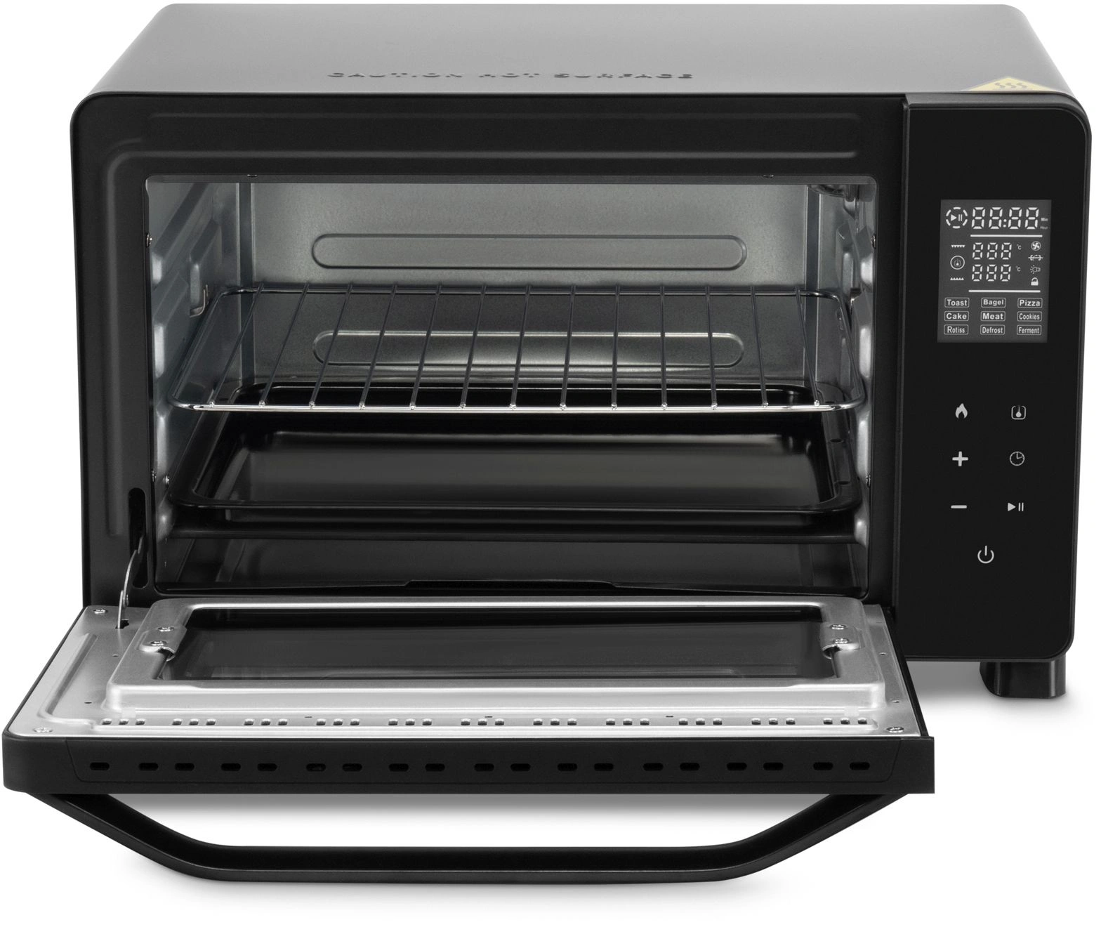 Удобное сенсорное управление. В одно касание включайте мини-печь, выбирайте автопрограммы, устанавливайте нужную температуру от 30 до 230 °C, запускайте таймер, включайте внутреннее освещение. На светодиодном LED-дисплее отображается вся информация о процессе приготовления.
