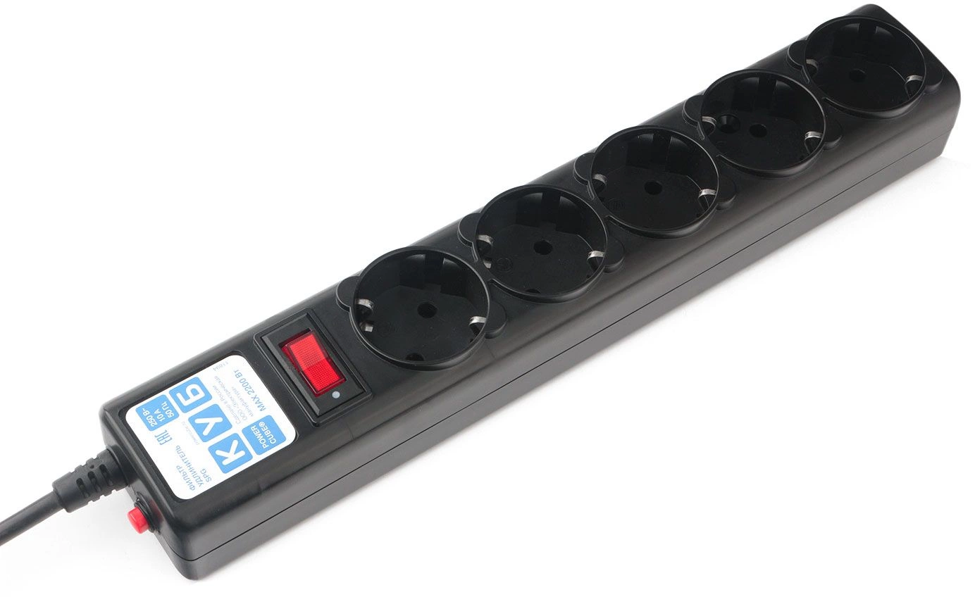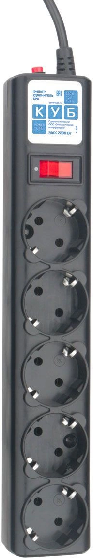 5 розеток с заземлением. Однополюсный выключатель со световой индикацией. Автоматический, многоразовый предохранитель. Защита от импульсных помех и короткого замыкания. Материал корпуса соответствует требованиям пожаробезопасности. Отверстия для крепежа.
