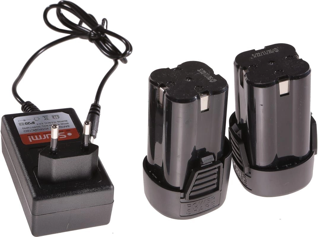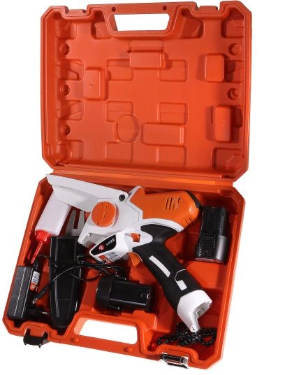 Пила цепная, пильная шина, пластиковый защитный кожух шины, пильная цепь, аккумуляторная батарея (2 шт), бутылка для масла, зарядное устройство, инструкция по эксплуатации, инструкция по безопасности