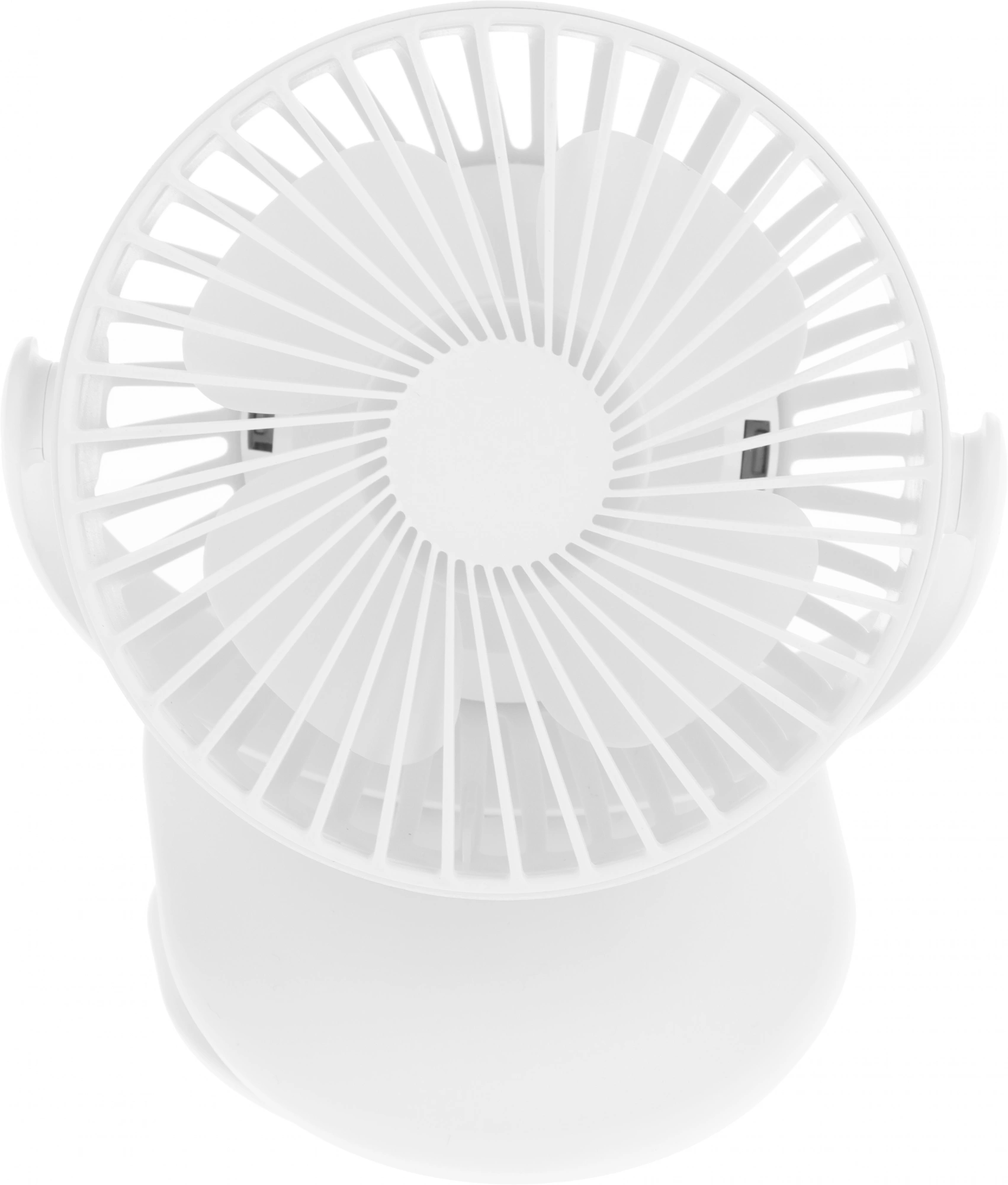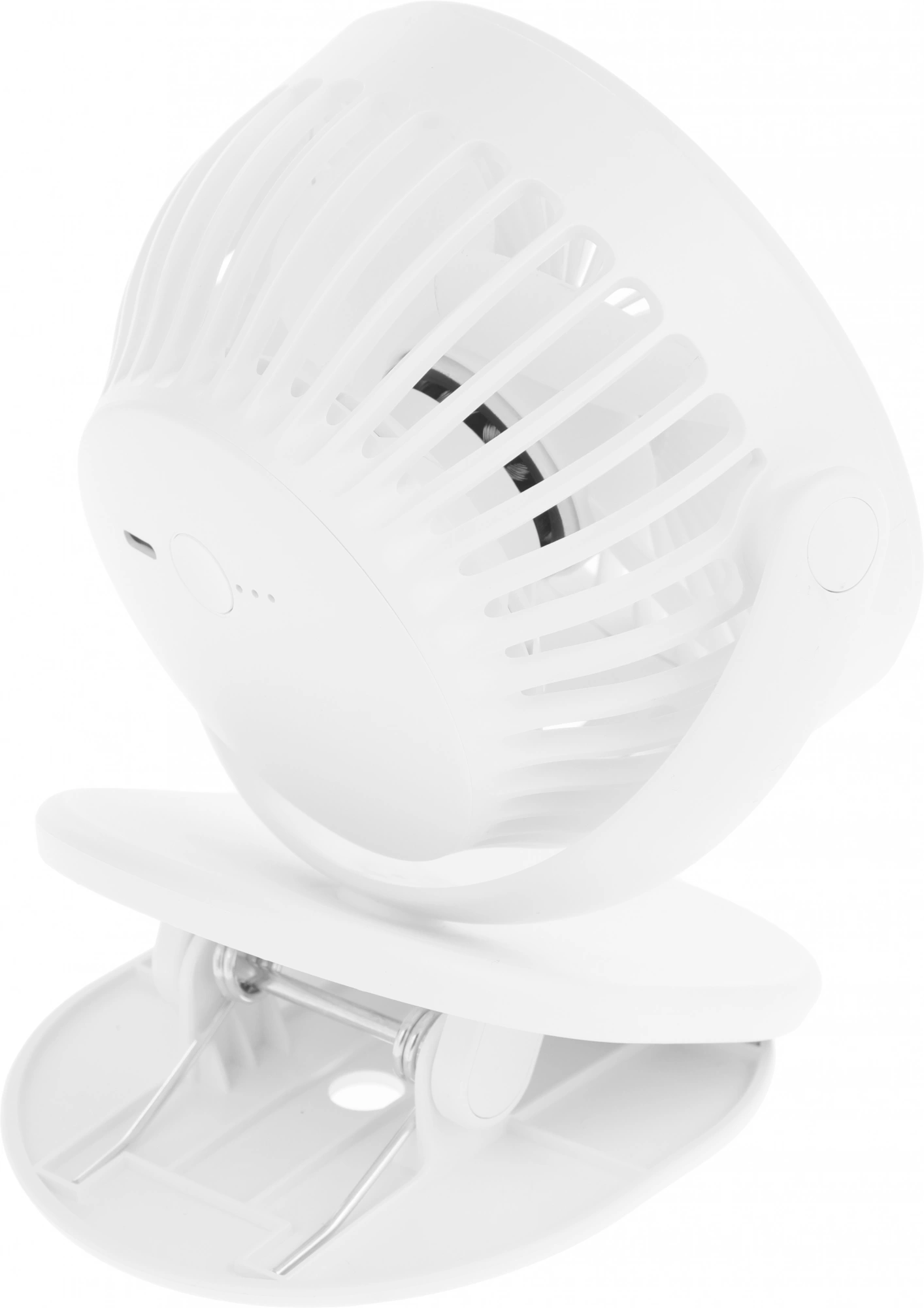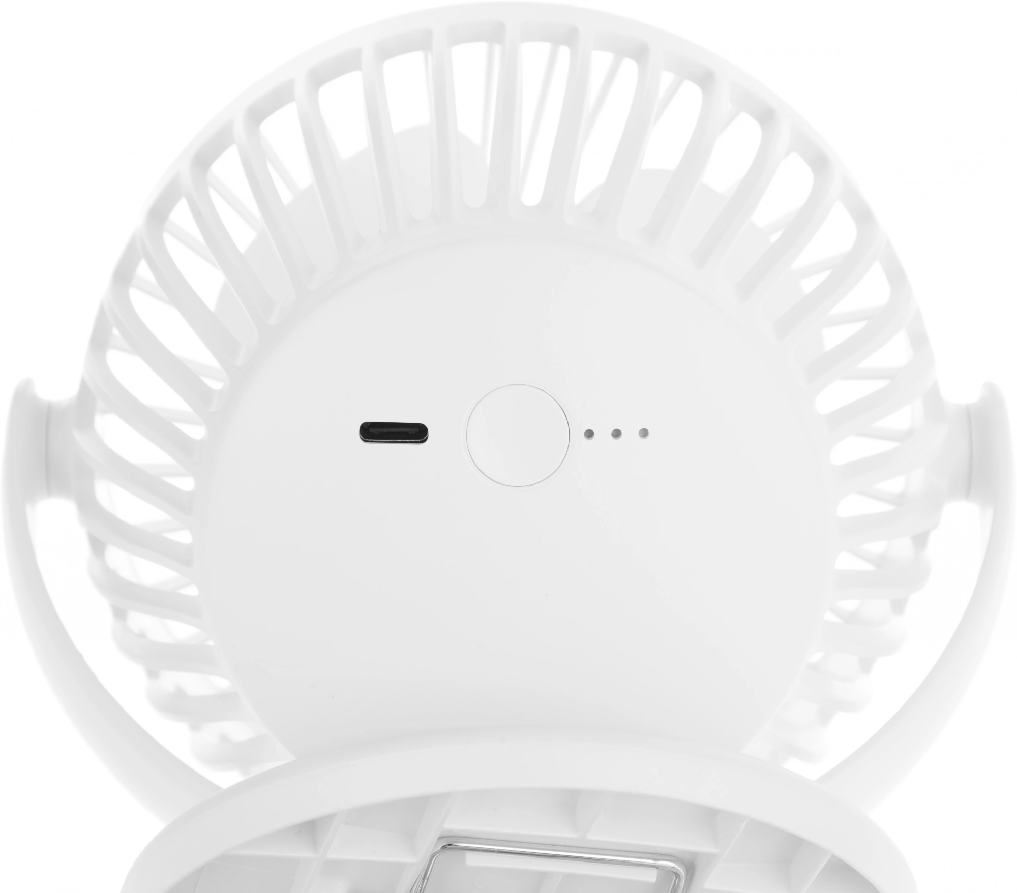 Вращение корпуса 360. Три скорости, зарядка от USB. Основание вентилятора представляет собой крепкий зажим с противоскользящим покрытием. Встроенный аккумулятор емкостью 2000 мА поддерживает работу вентилятора в течение 2-6 часов. Встроенный порт USB Type-C. Погружать корпус в воду запрещено.