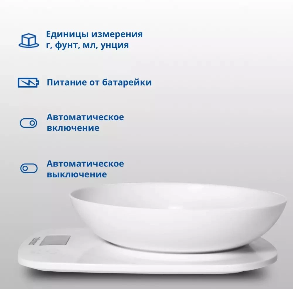 Точность от 1 г до 5 кг · Экран с подсветкой · Вес в г / фунтах / унциях / мл · Функция тары · Ультратонкий дизайн, легкий и удобный для хранения · Специальная функция для взвешивания молока и воды