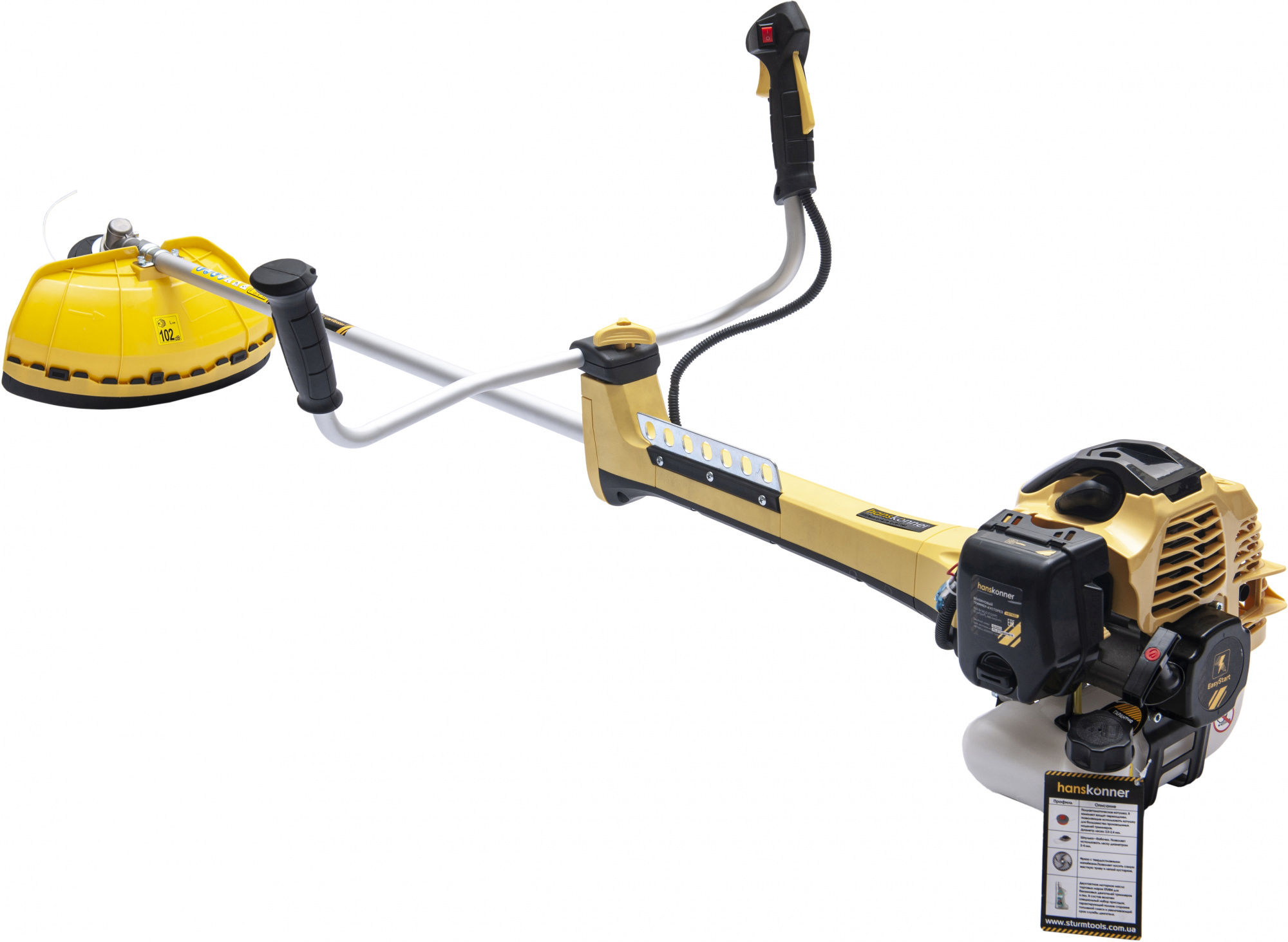 Триммер бензиновый (двигатель с ручкой газа, штанга), Боковая рукоятка, Трехлопастной нож, Катушка с леской, Ранцевый ремень, Канистра для топливной смеси, Защитный кожух с винтами, Отвертка с торцевым ключом, Шестигранный ключ 2 шт, Двухсторонний гаечный ключ, Стяжка, Сумка,Режущий диск 80 зубьев