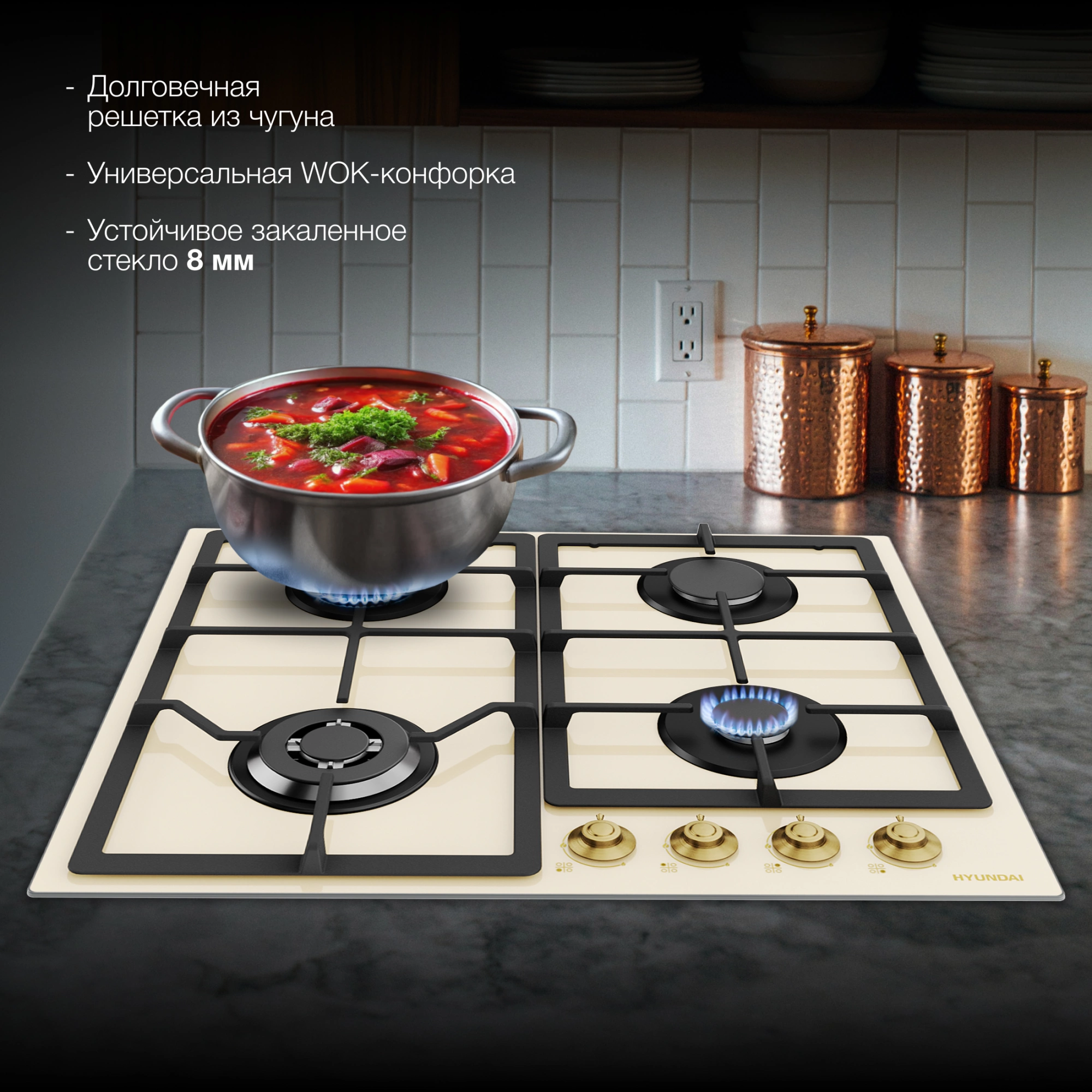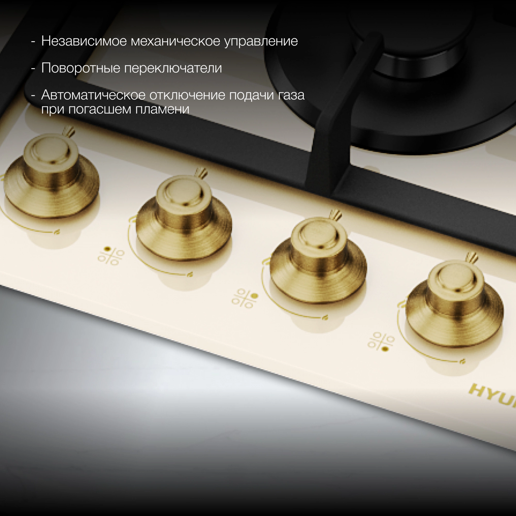 Газовая варочная панель Hyundai HHG 6434 BE: стиль, мощность и удобство на вашей кухне. Ее можно использовать как в обычной квартире, так и на даче (для этого в комплект входят жиклеры для сжиженного газа).