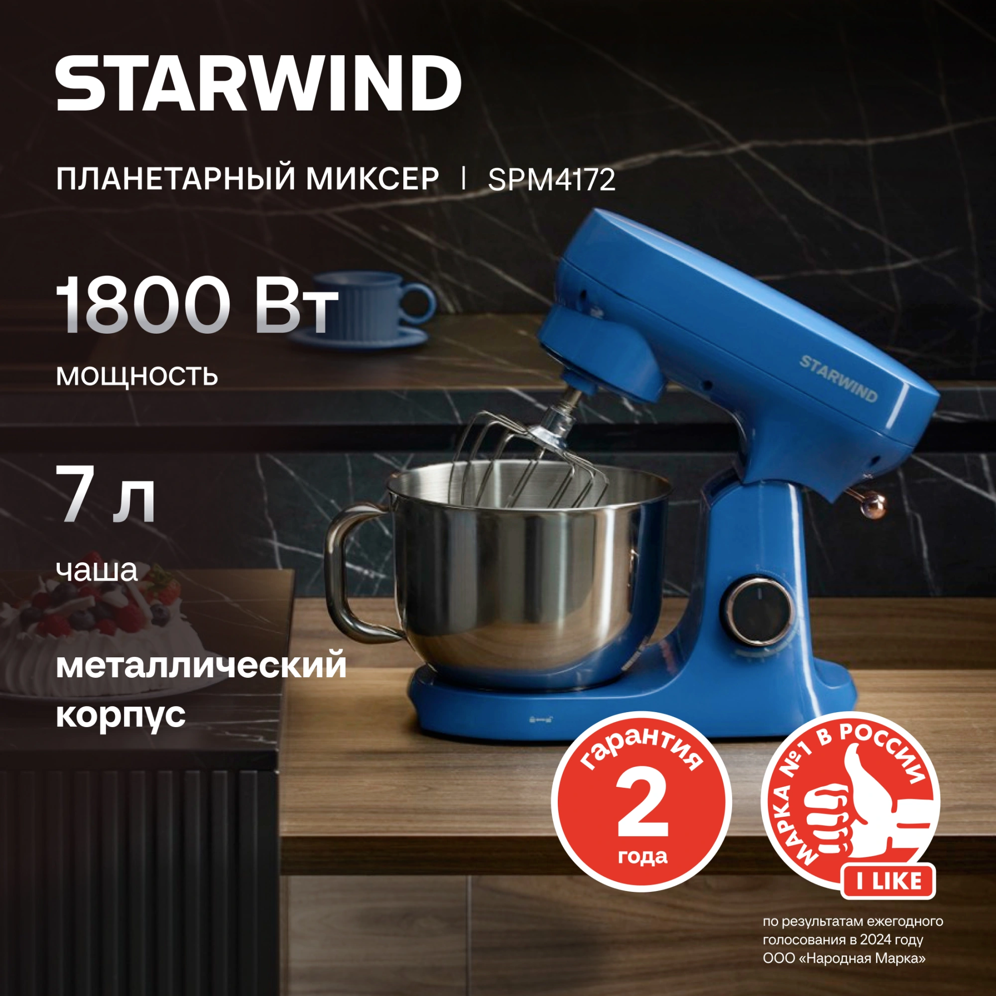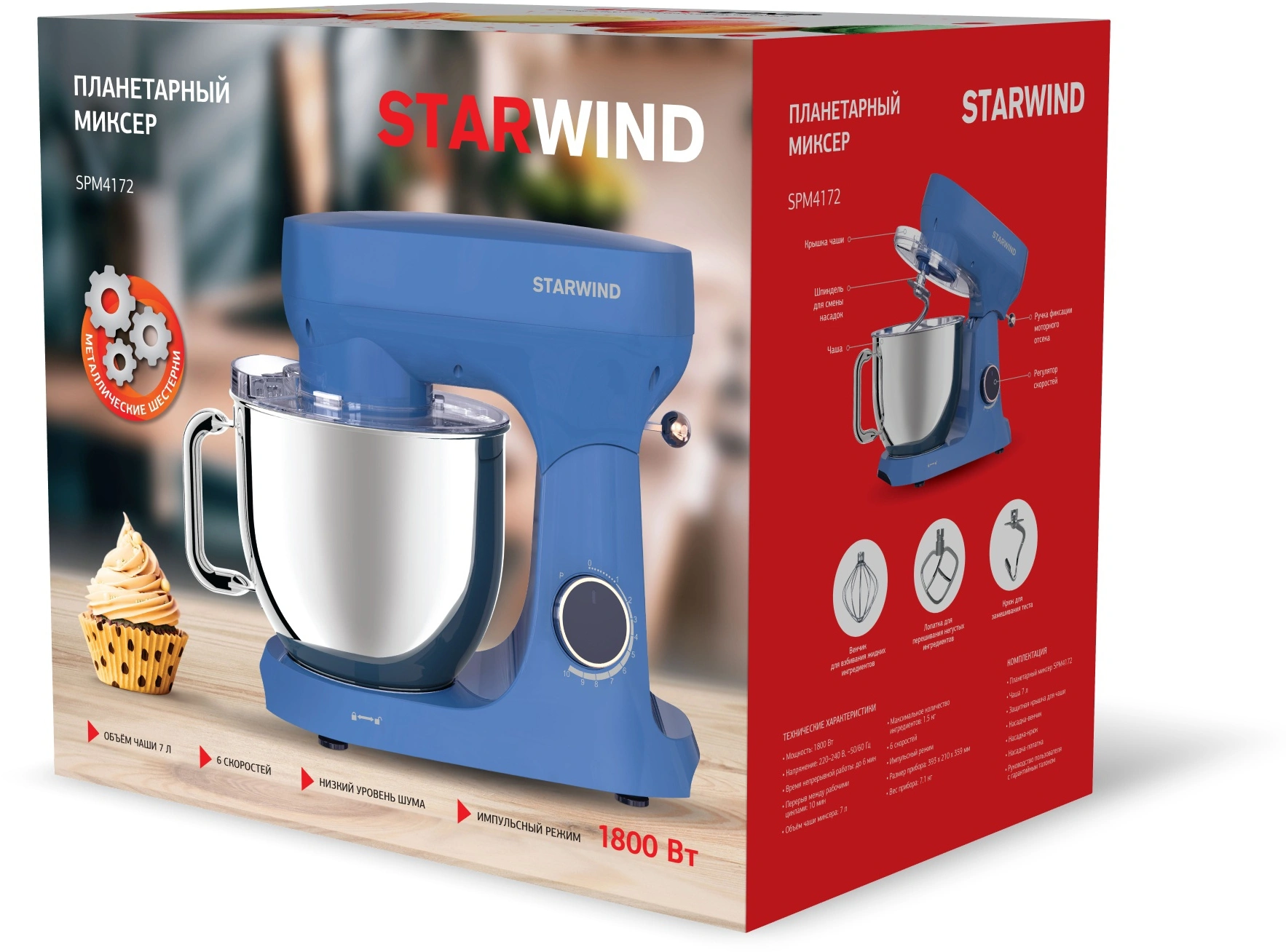 Планетарный миксер Starwind SPM4172 - представитель 4й серии планетарных миксеров Starwind, которая имеет ряд преимуществ перед аналогами: удобное управление, большая стальная чаша, цельнометаллические насадки с тефлоновым покрытием, металлические шестерни и защита от перегрузок.