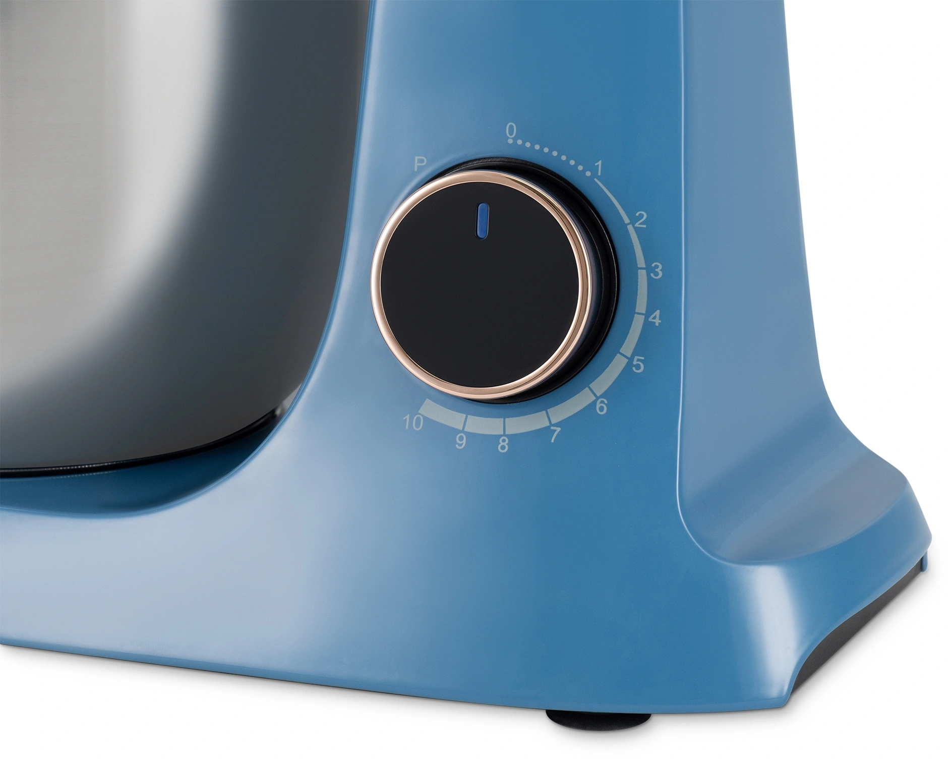 В комплект поставки включены 3 цельнометаллические насадки с тефлоновым покрытием: венчик для взбивания, лопатка для перемешивания с гибким ребром и крюк для замеса густого теста. Насадки, благодаря тефлоновому покрытию, можно мыть в посудомоечной машине, что значительно упрощает уход. Гибкое ребро лопатки тщательно собирает остатки продукта со стенок емкости, что обеспечивает высокое качество смешивания по всему объему чаши.
