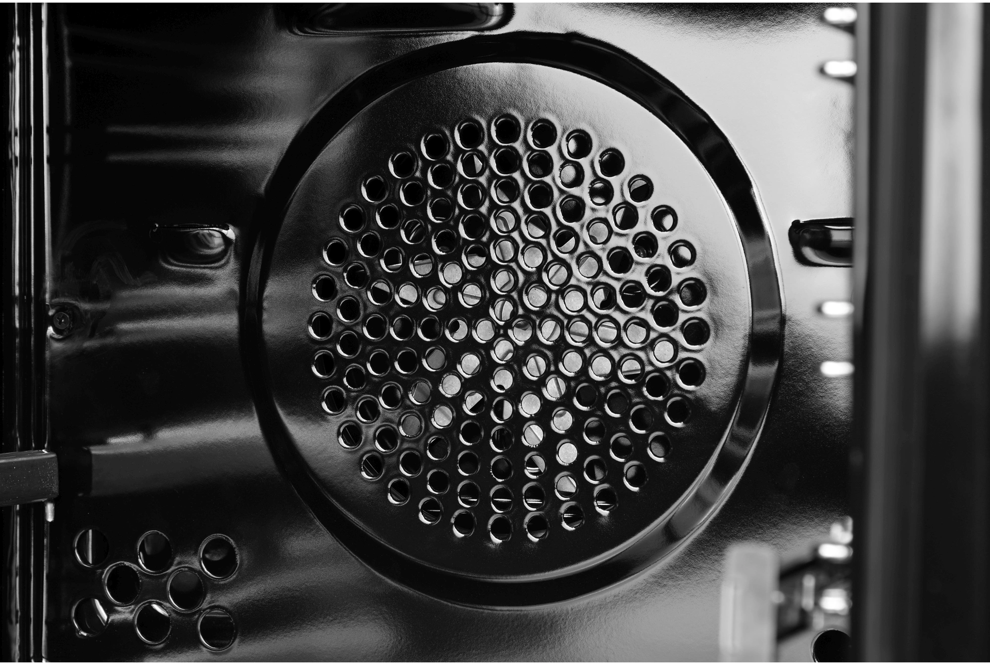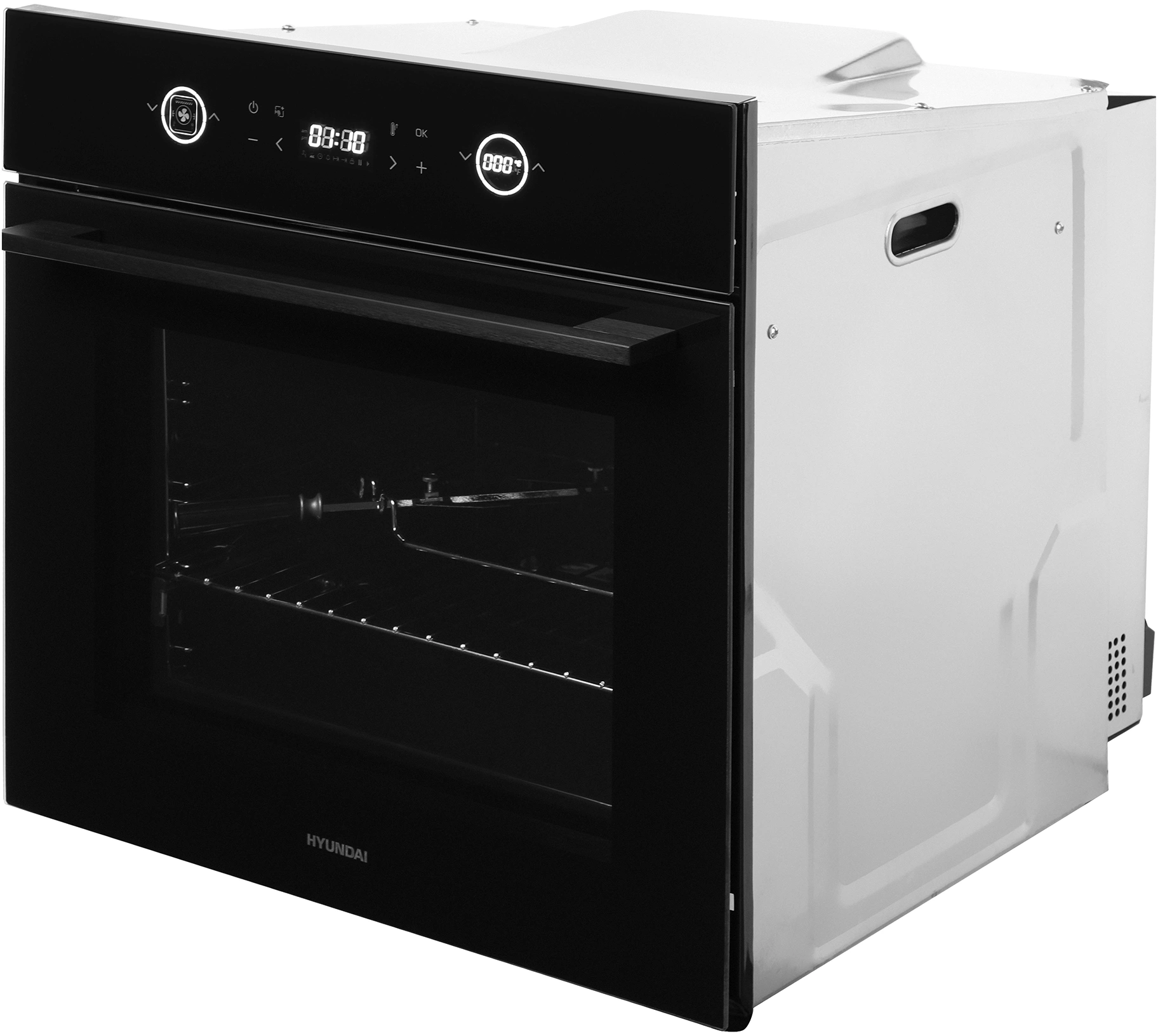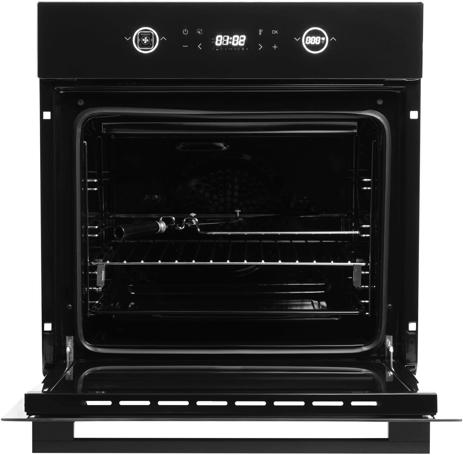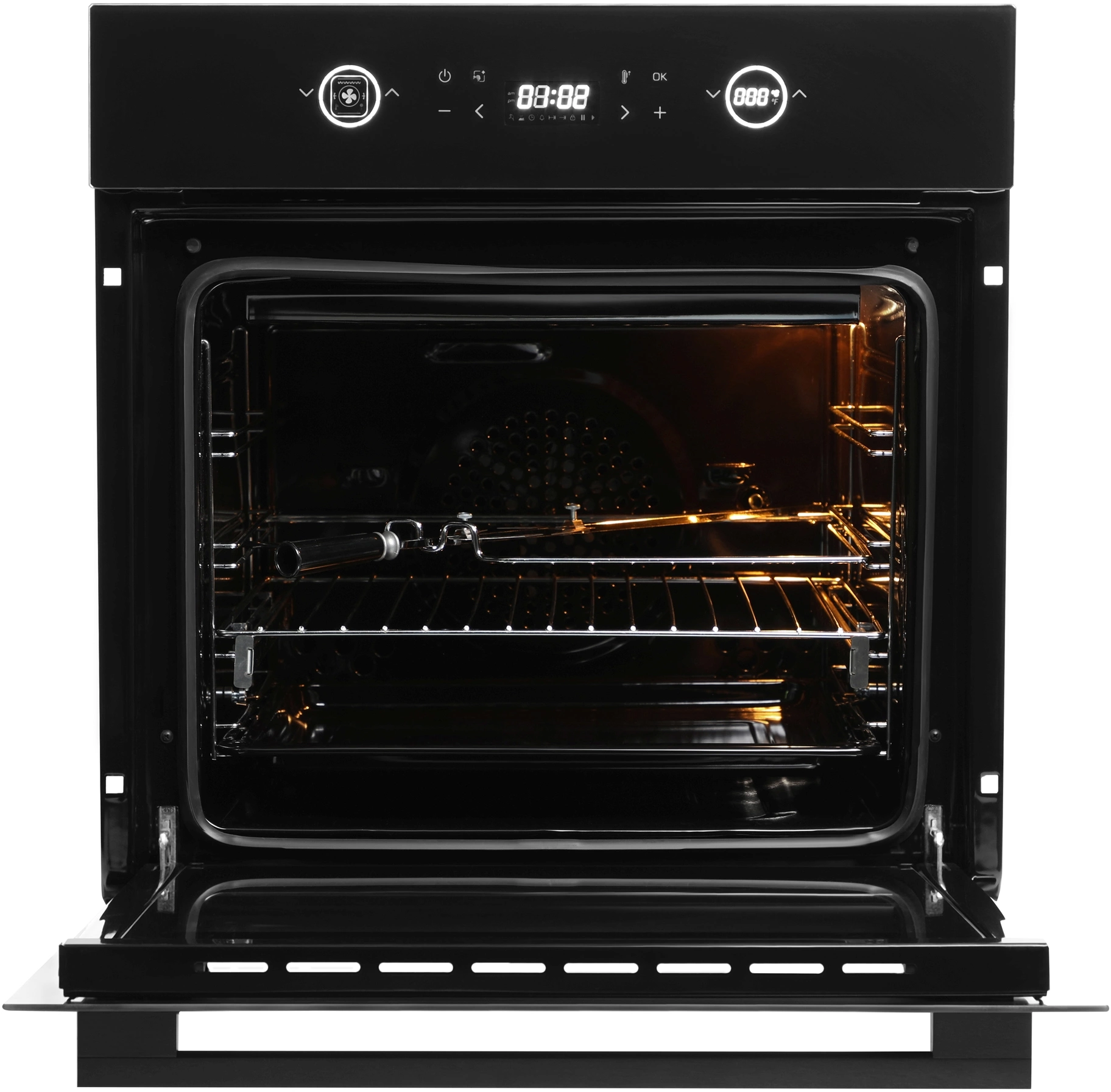 вентилятор охлаждения, вертел, полностью стеклянная внутренняя поверхность дверцы духовки, телескопические направляющие