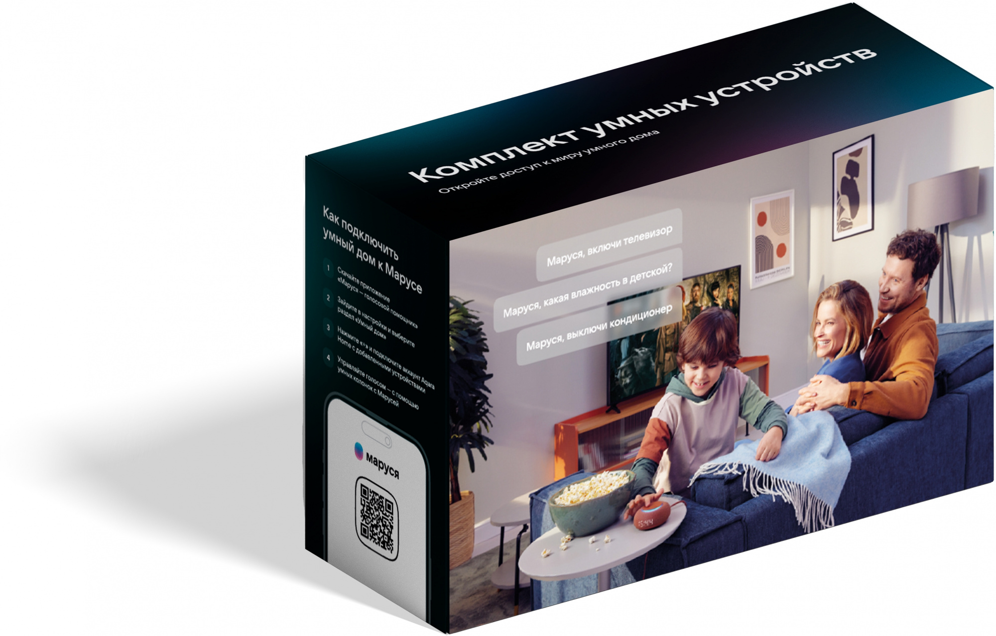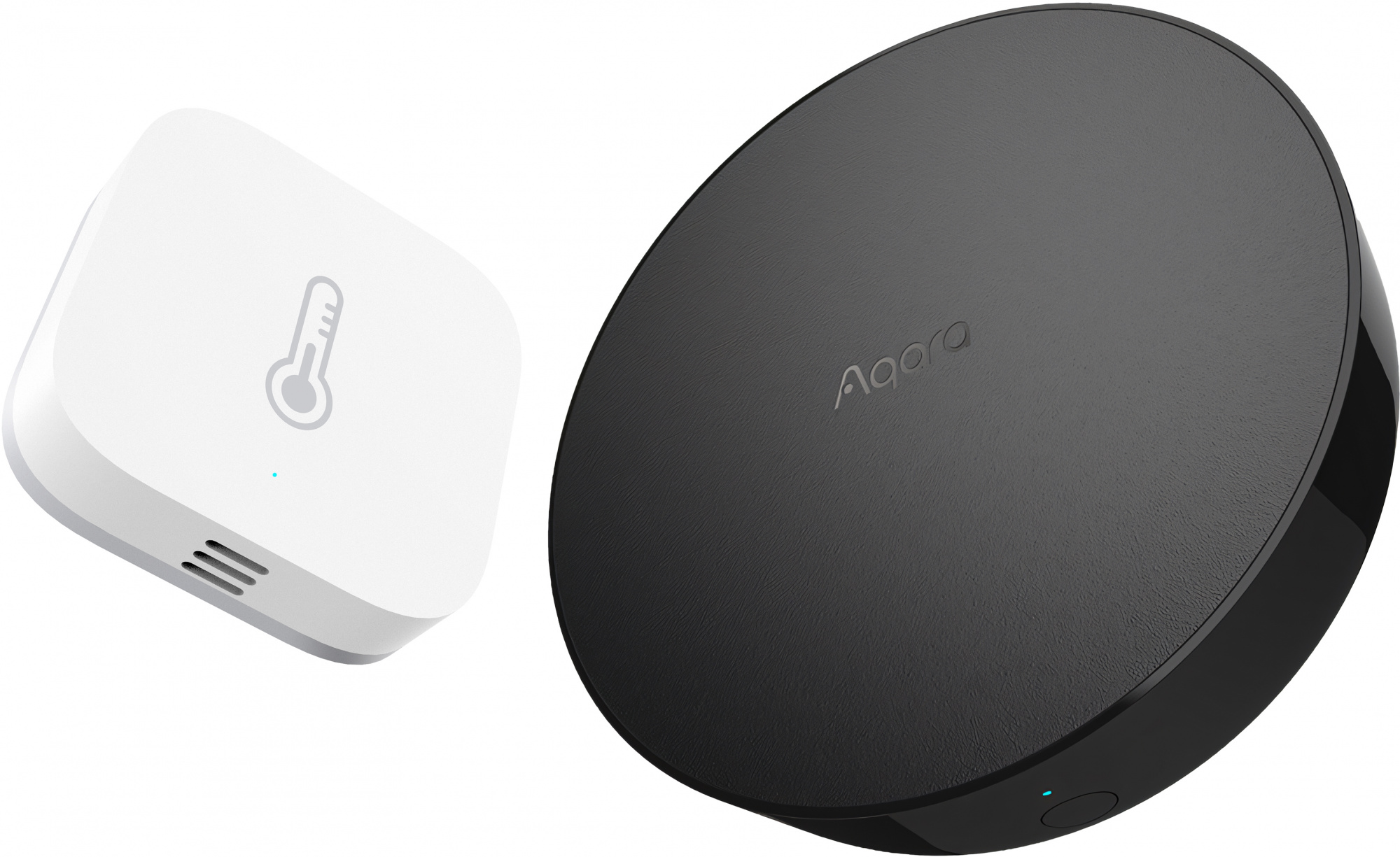 В комплекте устройства Aqara для климат-контроля. Это Hub M2 для управления кондиционерами и датчик температуры и влажности. Вы можете легко управлять температурой и влажностью с помощью Маруси или через приложение Aqara Home.